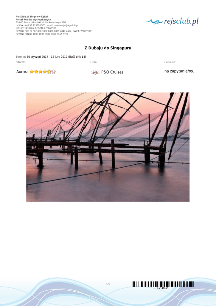 RejsClub.pl Zbigniew Kąkol Portal Rejsów Wycieczkowych 83-000 Pruszcz Gdański, ul. Podkomorzego 58/1 tel./fax: +48 58 7138200/01, email: [email protected] NIP: 6511430265, REGON: 220868580 BZ WBK EUR PL 58 1090 1098 0000 0001 2047 2434, SWIFT: WBKPPLPP BZ WBK PLN 82 1090 1098 0000 0001 2047 2390 Z Dubaju do Singapuru Termin: 30 styczeń 2017 - 12 luty 2017 (ilość dni: 14) Statek: Aurora Linia: Cena od: P&O Cruises na zapytanie/os. 1/3 EV:48029 RejsClub.pl Zbigniew Kąkol Portal Rejsów Wycieczkowych 83-000 Pruszcz Gdański, ul. Podkomorzego 58/1 tel./fax: +48 58 7138200/01, email: [email protected] NIP: 6511430265, REGON: 220868580 BZ WBK EUR PL 58 1090 1098 0000 0001 2047 2434, SWIFT: WBKPPLPP BZ WBK PLN 82 1090 1098 0000 0001 2047 2390 TRASA REJSU dzień 1 Data Port Wpłynięcie Wypłynięcie poniedziałek 30.01.2017 Dubaj --:-- --:-- Zjednoczone Emiraty Arabskie dzień 2 wtorek 31.01.2017 Dzień na morzu --:-- --:-- dzień 3 środa 01.02.2017 Dzień na morzu --:-- --:-- dzień 4 czwartek 02.02.2017 Bombaj --:-- --:-- dzień 5 piątek 03.02.2017 Dzień na morzu --:-- --:-- dzień 6 sobota 04.02.2017 Koczin --:-- --:-- dzień 7 niedziela 05.02.2017 Dzień na morzu --:-- --:-- dzień 8 poniedziałek 06.02.2017 Kolombo --:-- --:-- dzień 9 wtorek 07.02.2017 Dzień na morzu --:-- --:-- dzień 10 środa 08.02.2017 Dzień na morzu --:-- --:-- dzień 11 czwartek 09.02.2017 Dzień na morzu --:-- --:-- dzień 12 piątek 10.02.2017 Penang --:-- --:-- dzień 13 sobota 11.02.2017 Dzień na morzu --:-- --:-- dzień 14 niedziela 12.02.2017 Singapur --:-- --:-- Indie Indie Sri Lanka Malezja Singapur 2/3 EV:48029 Legenda RejsClub.pl Zbigniew Kąkol Portal Rejsów Wycieczkowych 83-000 Pruszcz Gdański, ul. Podkomorzego 58/1 tel./fax: +48 58 7138200/01, email: [email protected] NIP: 6511430265, REGON: 220868580 BZ WBK EUR PL 58 1090 1098 0000 0001 2047 2434, SWIFT: WBKPPLPP BZ WBK PLN 82 1090 1098 0000 0001 2047 2390 Data Port Wpłynięcie Wypłynięcie Legenda CENNIK Cena katalogowa Kabina wewnętrzna od £1 999.00 Kabina zewnętrzna z oknem na zapytanie Kabina zewnętrzna z balkonem na zapytanie Suite (apartament) od £6 029.00 Kabina jednoosobowa na zapytanie 3 i 4 osoba dorosła w kabinie na zapytanie dziecko do 18 lat jako 3 i 4 osoba w kabinie na zapytanie Opłaty portowe Cena promocyjna w cenie Uwaga! Ceny za osobę w kabinie dwuosobowej. Cena zawiera: zakwaterowanie w w wybranej kabinie; pełne wyżywienie w trakcie rejsu: 3 główne posiłki i przekąski między posiłkami; napoje serwowane do śniadania i w bufetach samoobsługowych; serwis bagażowy podczas wejścia i zejścia ze statku oraz serwis kabinowy; korzystanie ze wszystkich urządzeń sportowo - rekreacyjnych znajdujących się na pokładzie statku (kasyno, pub quiz, card room, baseny, siłownie); udział we wszystkich imprezach organizowanych na statku (przedstawienia w teatrze, koncerty itp.); klub dla dzieci; opłaty portowe. Cena nie zawiera: wycieczek fakultatywnych w trakcie rejsu; korzystania z barów, mini baru w kabinie oraz napojów zamawianych w restauracji (proponujemy pakiety napojów oraz ice-cream package); korzystania z punktów usługowych (fryzjer, pralnia, fotograf, salon piękności i odnowy biologicznej, internet); napiwków na statku - 5 funtów/os. powyżej 12 roku życia/dzień; wydatków osobistych w trakcie całej imprezy. 3/3 EV:48029