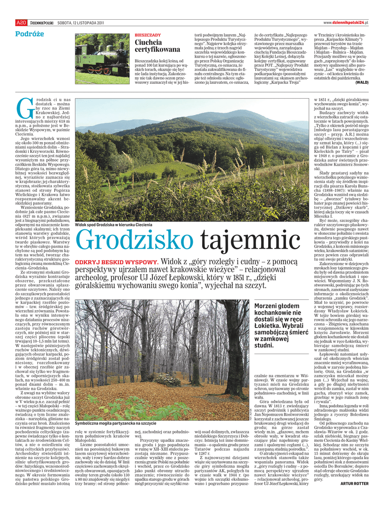 A20 www.dziennikpolski24.pl SOBOTA, 12 LISTOPADA 2011 Podróże BIESZCZADY Ciuchcia certyfikowana Bieszczadzka kolej leśna, od ponad 100 lat kursująca po wąskich torach, okazuje się być nie lada instytucją. Zakończony nie tak dawno sezon przewozowy zaznaczył się w jej his- torii podwójnym laurem „Najlepszego Produktu Turystycznego”. Najpierw kolejka otrzymała jedną z trzech nagród szczebla wojewódzkiego konkursu o tej nazwie, ogłoszonego przez Polską Organizację Turystyczną, co oznacza, że została zakwalifikowana do finału centralnego. Na tym etapie też odniosła sukces: ogłoszono ją laureatem, co oznacza, że do certyfikatu „Najlepszego Produktu Turystycznego”, wystawionego przez marszałka województwa, zarządzająca ciuchcią Fundacja Bieszczadzkiej Kolejki Leśnej, dołączyła kolejny certyfikat, sygnowany przez POT. „Najlepszy Produkt Turystyczny” województwa podkarpackiego (pozostałymi laureatami są: skansen archeologiczny „Karpacka Troja” G Widok spod Grodziska w kierunku Ciecienia Grodzisko tajemnic Widok z „góry rozległy i cudny – z pomocą perspektywy ujrzałem nawet krakowskie wieżyce” – relacjonował archeolog, profesor UJ Józef Łepkowski, który w 1851 r., „dzięki góralskiemu wychowaniu swego konia”, wyjechał na szczyt. ODKRYJ BESKID WYSPOWY. Morzeni głodem kochankowie nie dostali się w ręce Łokietka. Wybrali samobójczą śmierć w zamkowej studni. FOT. AUTOR rodzisk ci u nas dostatek – można by rzec na Ziemi Krakowskiej. Jedno z najbardziej interesujących mierzy 618 m n.p.m., a położone jest w Beskidzie Wyspowym, w paśmie Ciecienia. Jego wierzchołek wznosi się około 300 m ponad obniżeniami sąsiednich dolin – Stradomki i Krzyworzeki. Równocześnie szczyt ten jest najdalej wysuniętym na północ przyczółkiem Beskidu Wyspowego. Dlatego góra ta, mimo niewybitnej wysokości bezwzględnej, wyraziście zaznacza się w krajobrazie; jej charakterystyczna, stożkowata sylwetka stanowi od strony Pogórza Wielickiego i Krakowa łatwo rozpoznawalny akcent beskidzkiej panoramy. Wzniesienie Grodziska, podobnie jak całe pasmo Ciecienia (827 m n.p.m.), związane jest z biegnącymi południkowo, odpornymi na niszczenie kompleksami skalnymi; ich trzon stanowią warstwy godulskie, wśród których przeważają twarde piaskowce. Warstwy te w obrębie całego pasma nachylone są pod podobnym kątem na wschód, tworząc charakterystyczną strukturę geologiczną zwaną monokliną Ciecienia–Grodziska. Ze stromymi stokami Grodziska wyraźnie kontrastuje obszerne, przekształcone przez obwarowania spłaszczenie szczytowe. Należy ono do szczątkowych pozostałości jednego z zaznaczających się w karpackiej rzeźbie poziomów – tzw. śródgórskiej powierzchni zrównania. Powstała ona w wyniku intensywnego działania procesów niszczących, przy równoczesnym zastoju ruchów górotwórczych, nie później niż w starszej części pliocenu (epoki trwającej 10–1,5 mln lat temu). W następstwie późniejszych ruchów tektonicznych, dźwigających obszar karpacki, poziom śródgórski został podniesiony, rozczłonkowany i w obecnej rzeźbie gór zachował się tylko we fragmentach, w odporniejszych skałach, na wysokości 250–400 m ponad dnami dolin – m..in. właśnie na Grodzisku. Z uwagi na wybitne walory obronne szczyt Grodziska już w V wieku p.n.e. zaczął pełnić – w tej części Małopolski – rolę ważnego punktu osadniczego; świadczą o tym liczne znaleziska – narzędzia, gliniane naczynia oraz broń. Znaleziono tu również fragmenty naczyń pochodzenia celtyckiego (zapewne świadczące tylko o kontaktach ze środowiskiem Celtów, a nie o osiedleniu się tutaj celtyckich przybyszów). Archeolodzy stwierdzili istnienie na szczycie kolejnych, silnie ufortyfikowanych grodów: łużyckiego, wczesnośredniowiecznego i średniowiecznego. W okresie formowania się państwa polskiego Grodzisko pełnić musiało istotną Symboliczna mogiła partyzancka na szczycie rolę w systemie fortyfikacyjnym południowych krańców Małopolski. Liczne pozostałości umocnień na porośniętej bukowym lasem szczytowej wierzchowinie, wały i rowy bardzo dobrze zachowały się do dzisiaj. W linii częściowo zachowanych okrężnych obwarowań, opasujących owalny teren grodu (około 130 x 80 m) znajdowały się niegdyś trzy bramy: od strony północ- nej, zachodniej oraz południowej. Przyczyny upadku znaczenia grodu i jego popadnięcia w ruinę w XII–XIII stuleciu pozostają nieznane. Przypuszczalnie wynikły one z poszerzenia granic Polski na południe i wschód, przez co Grodzisko jako punkt obronny utraciło znaczenie; równocześnie do upadku starego grodu w górach mógł przyczynić się szybki roz- wój osad dolinnych, zwłaszcza niedalekiego Szczyrzyca i Dobczyc. Istnieją też inne domniemania – o spaleniu grodu przez Tatarów podczas najazdu w 1287 r. Z najnowszymi dziejami wiąże się usytuowana na szczycie góry symboliczna mogiła partyzantów AK, poległych tu w czasie walk w 1944 r. (po wojnie ich szczątki ekshumowano i pogrzebano przypusz- czalnie na cmentarzu w Wiśniowej). W czasie wojny partyzanci mieli na Grodzisku schron, usytuowany po stronie południowo–zachodniej, w linii wału. Góra odwiedzana była od dawna. W 1813 r. zwiedzający szczyt podróżnik i publicysta Jan Nepomucen Rostworowski korzystał z zachowanej jeszcze brukowanej drogi wiodącej do grodu; na górze zastał wtedy m.in. „głazowe, mchem obrosłe wały, w kwadrat otaczające plac napełniony gruzami i spalonymi cegłami (...), z zasypaną studnią pośrodku.”. O atrakcyjności eskapad na wierzchołek stanowiła także wspaniała panorama. Widok z „góry rozległy i cudny – z pomocą perspektywy ujrzałem nawet krakowskie wieżyce” – relacjonował archeolog, profesor UJ Józef Łepkowski, który w Trzcinicy i krośnieńska impreza „Karpackie Klimaty”) przewozi turystów na trasie Majdan –