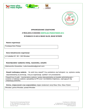 SPRAWOZDANIE CZĄSTKOWE Z REALIZACJI ZADANIA WSPÓLNA PRZESTRZEŃ 2013 W RAMACH XI AKCJI MASZ GŁOS, MASZ WYBÓR Nazwa organizacji: Fundacja Dom Pokoju Dane teleadresowe organizacji: ul. Łokietka 5/1, 50 – 243 Wrocław Koordynator zadania (imię, nazwisko, email): Aleksandra Kowalska, [email protected] Zespół realizujący zadanie. Ile osób liczy zespół? Czy podzielono się funkcjami: np. wybrano osobę odpowiedzialną za promocję, inną za organizację spotkań i ich prowadzenie. Zespół liczy 6 osób – koordynatora zadania, osobę odpowiedzialną za kwestie administracyjno – prawne w realizacji zadania, specjalistę ds PR oraz 3 architektów krajobrazu, zajmujących się adaptacją podwórka. Gmina, miejscowość oraz województwo objęte działaniami akcji Masz Głos, Masz Wybór: Wrocław, gmina Wrocław, powiat Wrocław Pracownia Zrównoważonego Rozwoju ul. Św. Katarzyny 5/3 | 87-100 Toruń tel. 695 254 739, [email protected] www.pzr.org.pl Fundacja im. S. Batorego ul. Sapieżyńska 10a | 00-215 Warszawa tel. 22/536 02 62, [email protected] www.maszglos.pl Nazwa własna zadania (opcjonalnie, jeżeli posiadacie Państwo nazwę swojego działania, to proszę o wpisanie) Uwolnij podwórko Wybór przestrzeni. Proszę o wyjaśnienie, w jaki sposób dokonano wyboru przestrzeni np. podczas zebrania/spotkania mieszkańców? Dlaczego wybrano tę przestrzeń? Wybrana przestrzeń jest przestrzenią najbliższą siedzibie Fundacji – jest to podwórko wewnątrzblokowe, wspólne dla trzech sąsiadujących kamienic, w jednej z nich zaś znajduje się siedziba Fundacji. Wybór przestrzeni motywowany był potrzebami pracowników Fundacji a także chęcią przywrócenia zaniedbanego dotąd podwórka mieszkańcom. Struktura przestrzeni. Czy wybrany obszar objęty jest miejscowym planem zagospodarowania przestrzennego lub został ujęty w studium uwarunkowań i kierunków zagospodarowania? Jeżeli tak, to jakie funkcje przeznaczono dla tego terenu w powyższych dokumentach planistycznych. Dla wybranego obszaru nie został sporządzony miejscowy plan zagospodarowania przestrzennego ani nie został on ujęty w studium uwarunkowań i kierunków zagospodarowania. Obecnie znajduje się ono pod władaniem Zarządu Zasobu Komunalnego. Opis przestrzeni. Jak w chwili obecnej wygląda wybrany teren? Co znajduje się w najbliższym otoczeniu np. – szkoła, jezioro, sklepy, węzeł przesiadkowy? Aktualnie podwórko jest zaniedbane. Tereny zielone nie są pielęgnowane. Brak jest ławek, koszy na śmieci i innych rozwiązań przydatnych mieszkańcom. Podwórko jest wspólnym terenem trzech kamienic. W jego pobliżu znajduje się przystanek tramwajowy, ruchliwa ulica oraz wyspy, będące ośrodkami spotkań miejskich. Pracownia Zrównoważonego Rozwoju ul. Św. Katarzyny 5/3 | 87-100 Toruń tel. 695 254 739, [email protected] www.pzr.org.pl Fundacja im. S. Batorego ul. Sapieżyńska 10a | 00-215 Warszawa tel. 22/536 02 62, [email protected] www.maszglos.pl Współpraca z władzami samorządowymi. Czy odbyło się spotkanie z wójtem/burmistrzem/prezydentem dotyczące realizacji zadania i współpracy władzy lokalnej z Państwa organizacją/grupą nieformalną. W jakiej atmosferze odbyło się spotkanie? Czy zadeklarowano współpracę i aktywny udział w realizacji zadania np. udział w spotkaniach z mieszkańcami? Czy ze strony urzędu wyznaczono osobę/osoby do współpracy? Czy do współpracy udało się zaangażować radnych np. gminy, osiedla lub sołtysa/sołtyskę. Na tym etapie podjęliśmy współpracę z Zarządem Zasobu Komunalnego, z którego otrzymaliśmy deklarację o wsparciu w realizowaniu projektu a także o wsparciu w upowszechnianiu wypracowanego w ramach projektu modelu dzierżawy, jako modelu uniwersalnego dla całego miasta. Diagnoza przestrzeni – badania przestrzeni, badania społeczne. Jeżeli wykonywano badania to proszę o informację, jakich narzędzi badawczych używano np. sondaż, ankieta, tablica z wlepkami, inne (jakie) itp.? Do momentu złożenia sprawozdania nie przeprowadzone zostały badania społeczne. Zostały one zaplanowane na pierwszy tydzień lipca. Pracownia Zrównoważonego Rozwoju ul. Św. Katarzyny 5/3 | 87-100 Toruń tel. 695 254 739, [email protected] www.pzr.org.pl Fundacja im. S. Batorego ul. Sapieżyńska 10a | 00-215 Warszawa tel. 22/536 02 62, [email protected] www.maszglos.pl Liczba przeprowadzonych sondaży, ankiet, przyklejonych wlepek, prób zliczania, obserwacji itp.? Nie dotyczy W jaki sposób przeprowadzano badania: sondowanie/ankietowanie na ulicach, mieszkaniach, w trakcie lokalnych wydarzeń, skrzynki z ankietami, mapy, tablice umieszczone w przestrzeni publicznej np. sklepach, przychodniach, szkołach? Nie dotyczy Otwarte spotkanie, dyskusja z mieszkańcami oraz władzą lokalną. Jeżeli spotkanie już się odbyło to proszę opisać jego przebieg oraz podać informację, czy w spotkaniu uczestniczyli przedstawiciele władz samorządowych (wójt/burmistrz/prezydent, przedstawiciele rady gminy, sołtys itp.) Nie dotyczy Ilu mieszkańców uczestniczyło w spotkaniu? Czy było więcej kobiet, czy mężczyzn? W jakim wieku byli uczestnicy? Pracownia Zrównoważonego Rozwoju ul. Św. Katarzyny 5/3 | 87-100 Toruń tel. 695 254 739, [email protected] www.pzr.org.pl Fundacja im. S. Batorego ul. Sapieżyńska 10a | 00-215 Warszawa tel. 22/536 02 62, [email protected] www.maszglos.pl Nie dotyczy Promocja działań. W jaki sposób informujecie Państwo o swoich działaniach lokalną społeczność (prasa, TV, Internet – strona internetowa, portale społecznościowe, wydarzenia promocyjne, plakaty, ulotki, marketing szeptany, inne (jakie)? Działanie jest promowane na fun-page'u Fundacji. Dalsze działania promocyjne zostaną podjęte po finalizacji procedury dzierżawy podwórka i przed rozpoczęciem działań partycypacyjnych. Czy w ramach realizacji zadania nawiązali Państwo współpracę z innymi organizacjami pozarządowymi, instytu