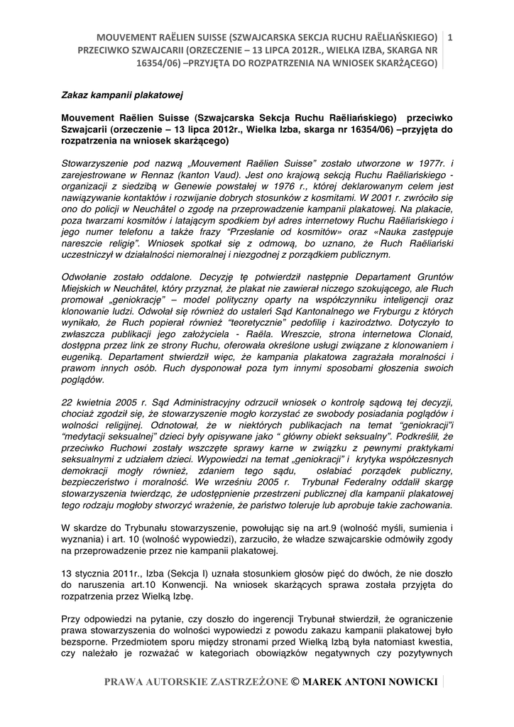 MOUVEMENT RAËLIEN SUISSE (SZWAJCARSKA SEKCJA RUCHU RAËLIAŃSKIEGO) 1 PRZECIWKO SZWAJCARII (ORZECZENIE – 13 LIPCA 2012R., WIELKA IZBA, SKARGA NR 16354/06) –PRZYJĘTA DO ROZPATRZENIA NA WNIOSEK SKARŻĄCEGO) Zakaz kampanii plakatowej Mouvement Raëlien Suisse (Szwajcarska Sekcja Ruchu Raëliańskiego) przeciwko Szwajcarii (orzeczenie – 13 lipca 2012r., Wielka Izba, skarga nr 16354/06) –przyjęta do rozpatrzenia na wniosek skarżącego) Stowarzyszenie pod nazwą „Mouvement Raëlien Suisse” zostało utworzone w 1977r. i zarejestrowane w Rennaz (kanton Vaud). Jest ono krajową sekcją Ruchu Raëliańskiego organizacji z siedzibą w Genewie powstałej w 1976 r., której deklarowanym celem jest nawiązywanie kontaktów i rozwijanie dobrych stosunków z kosmitami. W 2001 r. zwróciło się ono do policji w Neuchâtel o zgodę na przeprowadzenie kampanii plakatowej. Na plakacie, poza twarzami kosmitów i latającym spodkiem był adres internetowy Ruchu Raëliańskiego i jego numer telefonu a także frazy “Przesłanie od kosmitów» oraz «Nauka zastępuje nareszcie religię”. Wniosek spotkał się z odmową, bo uznano, że Ruch Raëliański uczestniczył w działalności niemoralnej i niezgodnej z porządkiem publicznym. Odwołanie zostało oddalone. Decyzję tę potwierdził następnie Departament Gruntów Miejskich w Neuchâtel, który przyznał, że plakat nie zawierał niczego szokującego, ale Ruch promował „geniokrację” – model polityczny oparty na współczynniku inteligencji oraz klonowanie ludzi. Odwołał się również do ustaleń Sąd Kantonalnego we Fryburgu z których wynikało, że Ruch popierał również “teoretycznie” pedofilię i kazirodztwo. Dotyczyło to zwłaszcza publikacji jego założyciela - Raëla. Wreszcie, strona internetowa Clonaid, dostępna przez link ze strony Ruchu, oferowała określone usługi związane z klonowaniem i eugeniką. Departament stwierdził więc, że kampania plakatowa zagrażała moralności i prawom innych osób. Ruch dysponował poza tym innymi sposobami głoszenia swoich poglądów. 22 kwietnia 2005 r. Sąd Administracyjny odrzucił wniosek o kontrolę sądową tej decyzji, chociaż zgodził się, że stowarzyszenie mogło korzystać ze swobody posiadania poglądów i wolności religijnej. Odnotował, że w niektórych publikacjach na temat “geniokracji”i “medytacji seksualnej” dzieci były opisywane jako “ główny obiekt seksualny”. Podkreślił, że przeciwko Ruchowi zostały wszczęte sprawy karne w związku z pewnymi praktykami seksualnymi z udziałem dzieci. Wypowiedzi na temat „geniokracji” i krytyka współczesnych demokracji mogły również, zdaniem tego sądu, osłabiać porządek publiczny, bezpieczeństwo i moralność. We wrześniu 2005 r. Trybunał Federalny oddalił skargę stowarzyszenia twierdząc, że udostępnienie przestrzeni publicznej dla kampanii plakatowej tego rodzaju mogłoby stworzyć wrażenie, że państwo toleruje lub aprobuje takie zachowania. W skardze do Trybunału stowarzyszenie, powołując się na art.9 (wolność myśli, sumienia i wyznania) i art. 10 (wolność wypowiedzi), zarzuciło, że władze szwajcarskie odmówiły zgody na przeprowadzenie przez nie kampanii plakatowej. 13 stycznia 2011r., Izba (Sekcja I) uznała stosunkiem głosów pięć do dwóch, że nie doszło do naruszenia art.10 Konwencji. Na wniosek skarżących sprawa została przyjęta do rozpatrzenia przez Wielką Izbę. Przy odpowiedzi na pytanie, czy doszło do ingerencji Trybunał stwierdził, że ograniczenie prawa stowarzyszenia do wolności wypowiedzi z powodu zakazu kampanii plakatowej było bezsporne. Przedmiotem sporu między stronami przed Wielką Izbą była natomiast kwestia, czy należało je rozważać w kategoriach obowiązków negatywnych czy pozytywnych PRAWA AUTORSKIE ZASTRZEŻONE © MAREK ANTONI NOWICKI 2 MOUVEMENT RAËLIEN SUISSE (SZWAJCARSKA SEKCJA RUCHU RAËLIAŃSKIEGO) PRZECIWKO SZWAJCARII (ORZECZENIE – 13 LIPCA 2012R., WIELKA IZBA, SKARGA NR 16354/06) –PRZYJĘTA DO ROZPATRZENIA NA WNIOSEK SKARŻĄCEGO) państwa. Wielka Izba uznała, że nie było potrzeby tego rozstrzygać, bo wydany zakaz był niezależnie od wszystkiego ingerencją możliwą do zaakceptowania jedynie pod warunkiem spełnienia wymagań ust.2 art.10. Była ona zgodna z prawem i podjęta w celu zapobiegania przestępstwom, ochrony zdrowia i moralności oraz praw innych osób. Czy była konieczna w społeczeństwie demokratycznym? Izba zwróciła uwagę na szczególny charakter tej sprawy, która wiązała się z kwestią, czy władze krajowe powinny zezwolić stowarzyszeniu rozpowszechniać swoje idee w drodze kampanii plakatowej i udostępnić mu w tym celu również określoną przestrzeń publiczną. Wielka Izba przypomniała, że wcześniej w dwóch sprawach Tüzel przeciwko Turcji (orzeczenia z 21 lutego i z 31 października 2006r.) Trybunał stwierdził naruszenie z powodu zakazu plakatowania przez partię polityczną. Wnioski Trybunału w tamtych sprawach wynikały jednak z faktu, że regulacje będące podstawą zakazu nie były poddane żadnej ścisłej ani skutecznej kontroli sądowej. Sprawa ta różniła się również od sprawy Appleby i inni przeciwko Wielkiej Brytanii (orzeczenie z 6 maja 2003r.) dotyczącej zajęcia powierzchni należącej do spółki prywatnej oraz od sprawy Women On Waves przeciwko Portugalii (orzeczenie z 3 lutego 2009r.), w której chodziło o odmowę państwa zgody na wpłynięcie statku na jego wody terytorialne, a więc przestrzeń „publiczną i ze swojej natury całkowicie otwartą”. W tym przypadku nie było ogólnego zakazu rozpowszechnia określonych idei, ale skorzystania z określonych uregulowanych i nadzorowanych miejsc lub obiektów w przestrzeni publicznej. Izba – podobnie, jak wcześniej szwajcarski Trybunał Federalny – zauważyła, że nie istnieje bezwarunkowe i nieograniczone prawo jednostek do rozciągniętego w czasie korzystania z prz