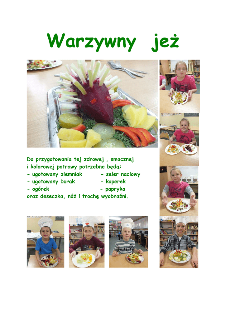 Warzywny jeż Do przygotowania tej zdrowej , smacznej i kolorowej potrawy potrzebne będą: - ugotowany ziemniak - seler naciowy - ugotowany burak - koperek - ogórek - papryka oraz deseczka, nóż i trochę wyobraźni.