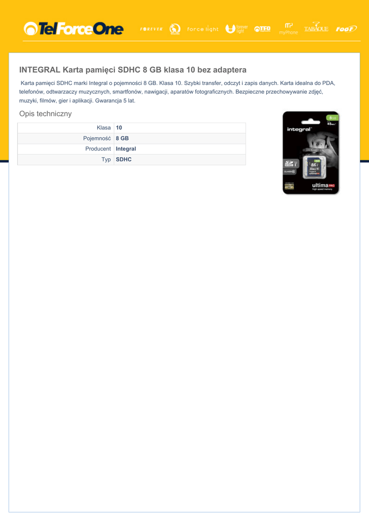 INTEGRAL Karta pamięci SDHC 8 GB klasa 10 bez adaptera Karta pamięci SDHC marki Integral o pojemności 8 GB. Klasa 10. Szybki transfer, odczyt i zapis danych. Karta idealna do PDA, telefonów, odtwarzaczy muzycznych, smartfonów, nawigacji, aparatów fotograficznych. Bezpieczne przechowywanie zdjęć, muzyki, filmów, gier i aplikacji. Gwarancja 5 lat. Opis techniczny Klasa 10 Pojemność 8 GB Producent Integral Typ SDHC