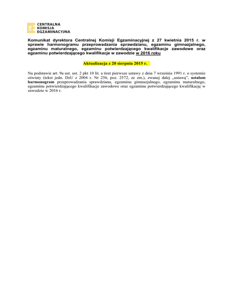 Komunikat dyrektora Centralnej Komisji Egzaminacyjnej z 27 kwietnia 2015 r. w sprawie harmonogramu przeprowadzania sprawdzianu, egzaminu gimnazjalnego, egzaminu maturalnego, egzaminu potwierdzającego kwalifikacje zawodowe oraz egzaminu potwierdzającego kwalifikacje w zawodzie w 2016 roku Aktualizacja z 20 sierpnia 2015 r. Na podstawie art. 9a ust. ust. 2 pkt 10 lit. a tiret pierwsze ustawy z dnia 7 września 1991 r. o systemie oświaty (tekst jedn. DzU z 2004 r. Nr 256, poz. 2572, ze zm.), zwanej dalej „ustawą”, ustalam harmonogram przeprowadzania sprawdzianu, egzaminu gimnazjalnego, egzaminu maturalnego, egzaminu potwierdzającego kwalifikacje zawodowe oraz egzaminu potwierdzającego kwalifikację w zawodzie w 2016 r. TERMINY EGZAMINU POTWIERDZAJĄCEGO KWALIFIKACJE ZAWODOWE dla absolwentów wszystkich typów szkół prowadzących kształcenie zawodowe, którzy uzyskali świadectwo ukończenia szkoły w styczniu 1. Etap pisemny 11 stycznia 2016 r. (poniedziałek), godz. 12:00 – dla absolwentów wszystkich typów szkół prowadzących kształcenie zawodowe 2. Etap praktyczny 12 stycznia 2016 r. – dla absolwentów techników, techników uzupełniających i szkół policealnych kształcących w tych samych zawodach, w których kształcą technika od 18 do 29 stycznia 2016 r. – dla absolwentów zasadniczych szkól zawodowych i szkół policealnych kształcących w tych samych zawodach, w których kształcą zasadnicze szkoły zawodowe Termin ogłaszania wyników egzaminu potwierdzającego kwalifikacje zawodowe: Termin przekazania szkołom dyplomów: Termin wydania zdającym dyplomów: 26 lutego 2016 r. 26 lutego 2016 r. 26 lutego 2016 r. TERMINY EGZAMINU POTWIERDZAJĄCEGO KWALIFIKACJE ZAWODOWE dla absolwentów wszystkich typów szkół prowadzących kształcenie zawodowe, którzy uzyskali świadectwo ukończenia szkoły w kwietniu lub czerwcu 1. Etap pisemny 20 czerwca 2016 r. (poniedziałek), godz. 12:00 – dla absolwentów wszystkich typów szkół prowadzących kształcenie zawodowe 2. Etap praktyczny od 21 do 22 czerwca 2016 r. – dla absolwentów techników, techników uzupełniających i szkół policealnych kształcących w tych samych zawodach, w których kształcą technika od 27 czerwca do 4 lipca 2016 r. – dla absolwentów zasadniczych szkół zawodowych i szkół policealnych kształcących w tych samych zawodach, w których kształcą zasadnicze szkoły zawodowe Termin ogłaszania wyników egzaminu potwierdzającego kwalifikacje zawodowe: Termin przekazania szkołom dyplomów: Termin wydania zdającym dyplomów: 26 sierpnia 2016 r. 26 sierpnia 2016 r. 26 sierpnia 2016 r. 7 TERMINY EGZAMINU POTWIERDZAJĄCEGO KWALIFIKACJE W ZAWODZIE W 2016 R. (kształcenie według nowej Podstawy programowej kształcenia w zawodach) Sesja 1.: styczeń – luty 2016 r. (z wyłączeniem Z.22 i Z.23) Część praktyczna Część pisemna w kwalifikacjach, w których jedynym w jest dokumentacja 14 stycznia 2016 r. pozostałych kwalifikacjach rezultatem od 16 stycznia do 26 lutego 2016 r. 15 stycznia 2016 r. Termin ogłaszania wyników egzaminu potwierdzającego kwalifikacje zawodowe: Termin przekazania szkołom, placówkom, pracodawcom oraz podmiotom prowadzącym kwalifikacyjne kursy zawodowe wyników egzaminu potwierdzającego kwalifikacje w zawodzie: Termin przekazania szkołom, placówkom i pracodawcom świadectw potwierdzających kwalifikacje w zawodzie oraz termin przekazania szkołom dyplomów potwierdzających kwalifikacje w zawodzie: 30 marca 2016 r. 30 marca 2016 r. 30 marca 2016 r. Sesja 2.: wyłącznie kwalifikacje Z.22 i Z.23 (technik pożarnictwa) Część praktyczna Część pisemna Z.22 11 kwietnia 2016 r. od 12 kwietnia do 29 kwietnia 2016 r. 7 czerwca 2016 r. Z.23 8 czerwca 2016 r. Termin ogłaszania wyników egzaminu potwierdzającego kwalifikacje zawodowe: Termin przekazania szkołom, placówkom, pracodawcom oraz podmiotom prowadzącym kwalifikacyjne kursy zawodowe wyników egzaminu potwierdzającego kwalifikacje w zawodzie: Termin przekazania szkołom, placówkom i pracodawcom świadectw potwierdzających kwalifikacje w zawodzie oraz termin przekazania szkołom dyplomów potwierdzających kwalifikacje w zawodzie: Z.22: 20 maja 2016 r. Z.23: 24 czerwca 2016 r. Z.22: 20 maja 2016 r. Z.23: 24 czerwca 2016 r. Z.22: 20 maja 2016 r. Z.23: 24 czerwca 2016 r. Sesja 3.: maj – lipiec 2016 r.* (z wyłączeniem Z.22 i Z.23) Część praktyczna Część pisemna w kwalifikacjach, w których jedynym w pozostałych jest dokumentacja 17 czerwca 2016 r. kwalifikacjach rezultatem 23 czerwca 2016 r. od 30 maja do 4 lipca 2016 r. * Egzaminy powinny zakończyć się do 30 czerwca 2016 r. W uzasadnionych przypadkach sesja może zostać przedłużona do 4 lipca 2016 r. Termin ogłaszania wyników egzaminu potwierdzającego kwalifikacje zawodowe: Termin przekazania szkołom, placówkom, pracodawcom oraz podmiotom prowadzącym kwalifikacyjne kursy zawodowe wyników egzaminu potwierdzającego kwalifikacje w zawodzie: Termin przekazania szkołom, placówkom i pracodawcom świadectw potwierdzających kwalifikacje w zawodzie oraz termin przekazania szkołom dyplomów potwierdzających kwalifikacje w zawodzie: 26 sierpnia 2016 r. 26 sierpnia 2016 r. 26 sierpnia 2016 r. 8 Sesja 4.: sierpień – październik 2016 r. Część pisemna 6 października 2016 r. 6 października 2016 r. Część praktyczna w kwalifikacjach, w których jedynym rezultatem jest w pozostałych kwalifikacjach dokumentacja od 16 sierpnia do 6 września – tylko M.11 i M.19 11 października 2016 r. od 6 września do 17 października 2016 r. – pozostałe kwalifikacje, w tym M.19 Z.22 od 6 października do 17 października 2016 r. Termin ogłaszania wyników egzaminu potwierdzającego kwalifikacje zawodowe: Termin przekazania szkołom, placówkom, pracodawcom oraz podmiotom prowadzącym kwalifikacyjne kursy zawodowe wyników egzaminu potwierdzającego kwalifikacje w zawodzie: Termin przekazania szkołom, placówkom i pracodaw
