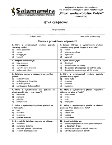 Wojewódzki Konkurs Przyrodniczy dla Uczniów Gimnazjów i Szkół Podstawowych „Ptaki wodno-błotne Polski” (2007/2008) ETAP OKRĘGOWY .......................................................................................................................................................................................................... imię i nazwisko .......................................................................................................................................................................................................... szkoła, klasa nauczyciel prowadzący Zaznacz prawidłową odpowiedź 1. Który z wymienionych czerwony dziób? a) mewa pospolita b) żuraw c) ostrygojad d) bekasik ptaków posiada 7. Samiec którego z wymienionych ptaków posiada czarny pasek biegnący przez oko? a) rudzik b) pełzacz ogrodowy c) mysikrólik d) gąsiorek 2. Brzęczki zamieszkują: a) lasy sosnowe b) trzcinowiska c) ogrody, parki miejskie d) nadmorskie plaże 8. Łyska składa jaja: a) do dziupli b) bezpośrednio na ziemię c) do gniazda pływającego na lustrze wody d) do gniazda zawieszonego wśród trzcin 3. Bataliony można w naszym kraju spotkać głównie: a) nad Bałtykiem b) na Pojezierzu Drawskim c) w Wielkopolsce d) na Bagnach Biebrzańskich 9. Który z wymienionych głęboko wcięty ogon? a) kania ruda b) krogulec c) jastrząb d) myszołów 4. Która z wymienionych sów głowie pęczki piór – tzw. „uszy”? a) włochatka b) puchacz c) pójdźka d) płomykówka 10. Który z wymienionych ptaków regularnie odlatuje na zimę z Polski? a) orzechówka b) sroka c) kruk d) krętogłów posiada na ptaków posiada 5. Który z wymienionych ptaków gnieździ się w koloniach? a) bąk b) trzciniak c) kokoszka d) rybitwa rzeczna 11. Który z wymienionych ptaków w okresie pierzenia traci zdolność do lotu? a) myszołów b) czapla siwa c) pluszcz d) krzyżówka 6. Krzyżodziób świerkowy odżywia się głównie: a) kornikami b) nasionami świerka c) owocami, głównie – borówkami d) różnymi bezkręgowcami 12. a) b) c) d) Kraski gnieżdżą się: w norach wykopanych w piaszczystych skarpach w dziuplach drzew na strychach opuszczonych domostw wśród przybrzeżnych zarośli Wojewódzki Konkurs Przyrodniczy dla Uczniów Gimnazjów i Szkół Podstawowych „Ptaki wodno-błotne Polski” (2007/2008) 13. Która z wymienionych cech dotyczy śmieszki? a) w zimie ma szarobrązową plamkę za okiem b) w zimie ma czerwoną plamkę za okiem c) ubarwienia samca i samicy różnią się między sobą d) latem wierzch głowy ptaka jest czerwono zabarwiony 20. Który z wymienionych ptaków pojawia się w Polsce w okresie jesieni i zimy, szczególnie licznie nad Bałtykiem? a) brodziec piskliwy b) rycyk c) lodówka d) kszyk 14. Który z wymienionych ptaków składa często jaja w szczelinach skalnych, na murach wież lub ruin? a) pustułka b) grzywacz c) siwerniak d) wilga 21. Który z wymienionych ptaków zwykle przylatuje do nas na początku maja i odlatuje w połowie sierpnia? a) jerzyk b) pierwiosnek c) piecuszek d) zięba 15. a) b) c) d) Mewy pospolite odżywiają się: przede wszystkim pokarmem roślinnym przede wszystkim glonami morskimi wyłącznie rybami są wszystkożerne 22. a) b) c) d) Ile jaj znosi zazwyczaj w lęgu gołąb miejski? 1 2 5 8 16. a) b) c) d) Kszyk zbliżony jest wielkością do: wróbla kosa mewy srebrzystej kormorana 23. a) b) c) d) Cyranka należy do rodziny: czaplowate jastrzębiowate drozdowate kaczkowate 24. a) b) c) Kowalik występuje głównie: w zadrzewianiach śródpolnych na podmokłych łąkach w starych drzewostanach parkowych nad potokami górskimi 17. Który z wymienionych gatunków nazywany jest popularnie bewikiem? a) brodziec pławny b) kwokacz c) łabędź czarnodzioby d) szczudlak d) 18. Który z wymienionych gatunków gniazduje w Polsce? a) głuptak b) mewa blada c) perkoz rdzowoszyi d) uhla 25. Który z wymienionych Polsce najrzadszy? a) potrzeszcz b) ortolan c) trznadel d) wąsatka 19. Który z wymienionych ptaków gnieździ się w naszym kraju nielicznie, głównie we wschodniej i południowej części Polski? a) paszkot b) trzcinniczek c) remiz d) dzięcioł zielonosiwy 26. Jaja którego z wymienionych ptaków mają barwę zielonkawą lub niebieskawą, z bardzo drobnymi rdzawymi plamkami? a) dzięcioł duży b) kos c) oknówka d) bogatka leśnych ptaków jest i w
