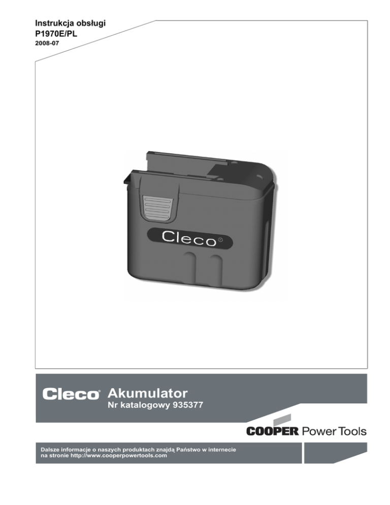 Instrukcja obsługi P1970E/PL 2008-07 Akumulator Nr katalogowy 935377 Dalsze informacje o naszych produktach znajdą Państwo w internecie na stronie http://www.cooperpowertools.com Spis treści 1 Bezpieczeństwo 3 1.1 1.2 1.3 1.4 1.5 1.6 Prezentacja wskazówek ....................................................................... Zasady bezpiecznej pracy .................................................................... Użytkowanie zgodne z przeznaczeniem............................................... Zakres dostawy..................................................................................... Transport .............................................................................................. Składowanie ......................................................................................... 3 4 4 4 4 5 2 Wymiary w mm 5 3 Ładowanie akumulatora 6 4 Wymiana akumulatora 6 5 Wykrywanie i usuwanie błędów 7 6 Obsługa techniczna 7 7 Serwis 7 8 Dane techniczne 8 9 Utylizacja 8 P1970E_PL Akkupack 935377 200807IVZ.fm, 08.09.2008 P1970E/PL 2008-07 2 Bezpieczeństwo Zastrzeżenia Cooper Power Tools zastrzega sobie prawo do wprowadzania zmian, uzupełnień i udoskonaleń w dokumentacji i produkcie bez wcześniejszego powiadomienia. Niniejsza dokumentacja nie może być reprodukowana w jakiejkolwiek formie w całości ani w części bez wyraźnego zezwolenia Cooper Power Tools. Odnosi się to również do przetwarzania na język naturalny, maszynowy, przenoszenia na nośniki danych w sposób elektroniczny, mechaniczny, optyczny oraz każdy inny. 1 Bezpieczeństwo 1.1 Prezentacja wskazówek Wskazówki ostrzegawcze oznaczone są słowem ostrzegawczym oraz piktogramem: • Słowo ostrzegawcze opisuje stopień i prawdopodobieństwo wystąpienia danego zagrożenia. • Piktogram opisuje rodzaj zagrożenia. OSTRZEŻENIE! Możliwość wystąpienia sytuacji niebezpiecznej dla zdrowia osób. Nieprzestrzeganie tego ostrzeżenia może doprowadzić do najcięższych uszkodzeń ciała. OSTROŻNIE! Możliwość wystąpienia sytuacji szkodliwej dla zdrowia osób oraz powodującej szkody rzeczowe i zagrożenie dla środowiska naturalnego. Nieprzestrzeganie tego ostrzeżenia może prowadzić do obrażeń, szkód rzeczowych i zagrożenia dla środowiska naturalnego. WSKAZÓWKA Informacje ogólne obejmują porady, wskazówki i inne przydatne informacje. Nie zawierają jednak ostrzeżeń przed zagrożeniami. 70b_1_5 pl.fm, 08.09.2008 P1970E/PL 2008-07 3 1 1 Bezpieczeństwo 1.2 Zasady bezpiecznej pracy Przed uruchomieniem akumulatora należy dokładnie przeczytać i zrozumieć instrukcję obsługi. Nieprzestrzeganie poniższych zaleceń może skutkować poparzeniem oraz poważnymi obrażeniami. OSTROŻNIE! Bezpieczeństwo elektryczne ➔ Nie otwierać akumulatora. ➔ Nie dokonywać zmian konstrukcyjnych w akumulatorze. ➔ Akumulator używać tylko w pomieszczeniach zamkniętych i suchych. ➔ Akumulator chronić przed wilgocią i deszczem. ➔ Akumulatora w żadnym przypadku nie wolno eksploatować w nieodpowiednich warunkach otoczenia (np. palne gazy, rozpuszczalniki, pył, para, wilgoć). ➔ Nie uruchamiać akumulatora, jeśli posiada uszkodzoną obudowę lub styki. ➔ Przestrzegać wskazówek dotyczących bezpieczeństwa umieszczonych na akumulatorze i ładowarce. Stanowisko pracy ➔ Zapewnić dostateczną ilość miejsca na stanowisku pracy. ➔ Obszar pracy musi być suchy i utrzymany w czystości. 1.3 Użytkowanie zgodne z przeznaczeniem • • • 1.4 Akumulator przeznaczony jest wyłącznie do zasilania bezprzewodowego narzędzia EC CLECO. Nie stosować w obszarach zagrożonych wybuchem. Do ładowania należy korzystać wyłącznie z następujących ładowarek CLECO: Nr katalogowy Ładowarka 935302 Litowo-jonowa 26 V (230 VAC), 4-krotna 935382 Litowo-jonowa 26 V (230 VAC), 1-krotna 935390 Litowo-jonowa 26 V (110 – 230 VAC), 1-krotna 935391 Litowo-jonowa 26 V (110 – 230 VAC), 1-krotna Zakres dostawy Dostarczony wyrób sprawdzić pod względem uszkodzeń transportowych i zgodności z zakresem dostawy: 1 Akumulator 1 Niniejsza instrukcja obsługi 1.5 TRANSPORT Akumulator transportować i przechowywać w oryginalnym opakowaniu. Opakowanie nadaje się do utylizacji. 4 P1970E/PL 2008-07 70b_1_5 pl.fm, 08.09.2008 Wymiary w mm 1.6 Składowanie Przedział czasowy 5000 h / 200 dni – maksymalnie, bez ładowania podtrzymującego. Temperatura składowania Względna wilgotność powietrza -30 do +45 °C 0 … 90 % Uwagi Przechowywać naładowany w 100%. Po 5000 h / 200 dniach ponownie naładować, aby uniknąć nadmiernego rozładowania (< 17,5 V). OSTRZEŻENIE! Niebezpieczeństwo wybuchu wskutek zwarcia ➔ Chronić akumulator przed wilgocią. ➔ Unikać kontaktu przedmiotów przewodzących prąd elektryczny, jak np. spinacze biurowe, monety, klucze, igły lub śruby, ze stykami akumulatora. ➔ W przypadku przechowywania akumulatora poza narzędziem lub ładowarką należy osłonić styki akumulatora. 2 Wymiary w mm 70b_1_5 pl.fm, 08.09.2008 P1970E/PL 2008-07 5 2 3 Ładowanie akumulatora 3 Ładowanie akumulatora Dostarczany akumulator naładowany jest tylko częściowo. ➔ Przed pierwszym użyciem całkowicie naładować akumulator. OSTRZEŻENIE! W przypadku stosowania nieodpowiednich ładowarek lub akumulatorów istnieje ryzyko przegrzania lub wypłynięcia żrącej cieczy z akumulatora. ➔ Stosować wyłącznie oryginalne ładowarki CLECO. Są one optymalnie przystosowane do pracy z tym akumulatorem. WSKAZÓWKA Przy prawidłowym użytkowaniu, akumulator można ładować przynajmniej 800 razy (60 % pojemności). Istotne są tu następujące warunki: ➔ Temperatura ładowania akumulatora 5 °C do +45 °C ➔ Przestrzegać wskazówek dotyczących bezpieczeństwa umieszczonych na akumulatorze i ładowarce. ➔ Nowe lub długo nieużywane akumulatory naładować do pełna. ➔ Nie rozładowywać akumulatora całkowicie (< 17,5 V). ➔ Chronić akumulator przed uderzeniem. ➔ Miejsca styku w