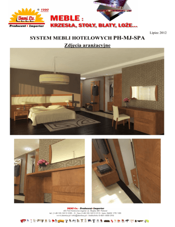 Lipiec 2012 SYSTEM MEBLI HOTELOWYCH PH-MJ-SPA Zdjęcia aranżacyjne Meble dostępne w wybarwieniu: naturalna okleina czereśnia miodowa Uwaga! Powyższe próbki wybarwień mogą nieznacznie różnić się od oryginału. ELEMENTY SYSTEMU HOTELOWEGO PH-MJ-SPA Lp 1. 2.* 3. Produkt Lustro LU-MJ-SPA-02 Biurko z szafką na minibar B-MJ-SPA-03 Biurko z szufladami i szafką na minibar Zdjęcie Wymiary w mm (szer., gł., wys.) 1000/30/540 1400/550/715 1899/550/715 B-MJ-SPA-04 4.* 5.* Bagażnik SZ-MJ-SPA-09 Garderoba SZF-MJ-SPA-10 970/550/530 485/30/1600 6. 7.* 8.* 9.* 10. 11. Panel z lustrem SZF-MJ-SPA-11 Szafa 2-drzwiowa SZF-MJ-SPA-08 Szafka nocna SZ-MJ-SPA-12 Zagłówek łóżka pojedynczy PN-MJ-SPA-06 Zagłówek łóżka podwójny PN-MJ-SPA-07 Łóżko * Elementy uwzględnione w wycenie pokoju 485/30/1600 1012/632/2159 548/428/410 1510/45/1110 3020/45/1110 O pełną ofertę łóżek pytaj w dziale sprzedaży 32 3513220-23
