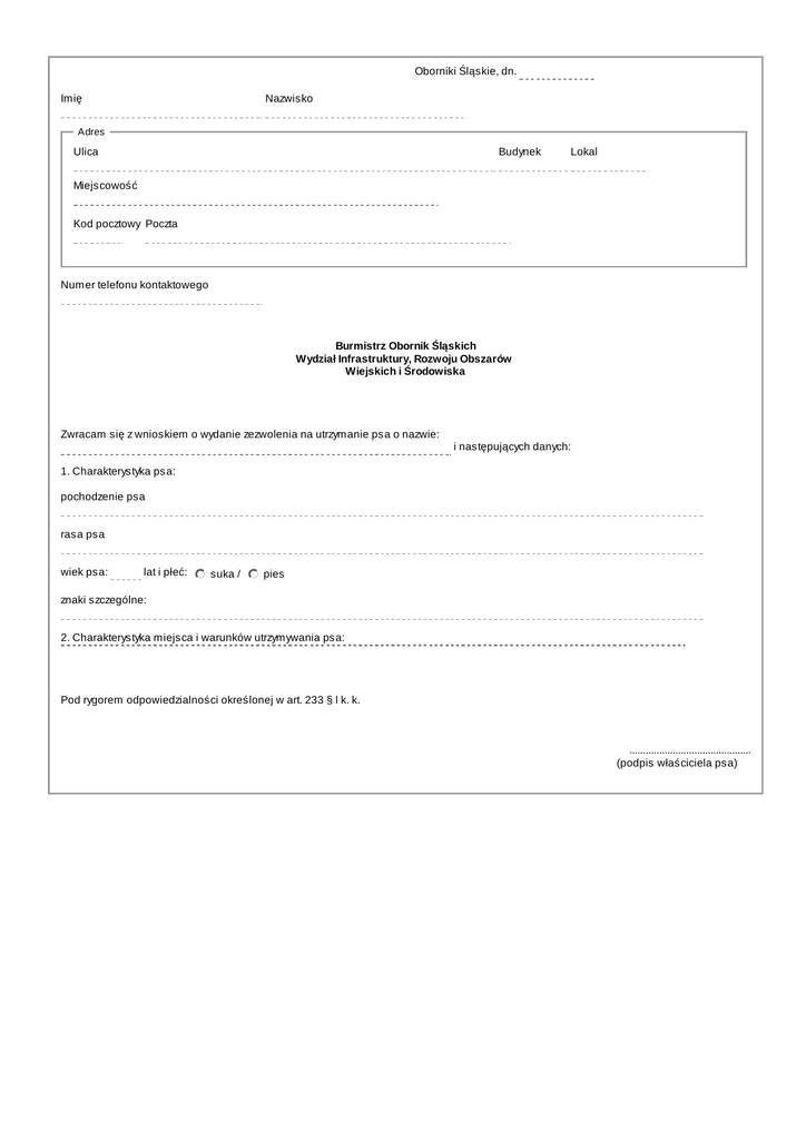 Oborniki Śląskie, dn. Imię Nazwisko Adres Ulica Budynek Lokal Miejscowość Kod pocztowy Poczta Numer telefonu kontaktowego Burmistrz Obornik Śląskich Wydział Infrastruktury, Rozwoju Obszarów Wiejskich i Środowiska Zwracam się z wnioskiem o wydanie zezwolenia na utrzymanie psa o nazwie: i następujących danych: 1. Charakterystyka psa: pochodzenie psa rasa psa wiek psa: lat i płeć: suka / pies znaki szczególne: 2. Charakterystyka miejsca i warunków utrzymywania psa: Pod rygorem odpowiedzialności określonej w art. 233 § l k. k. ............................................. (podpis właściciela psa)