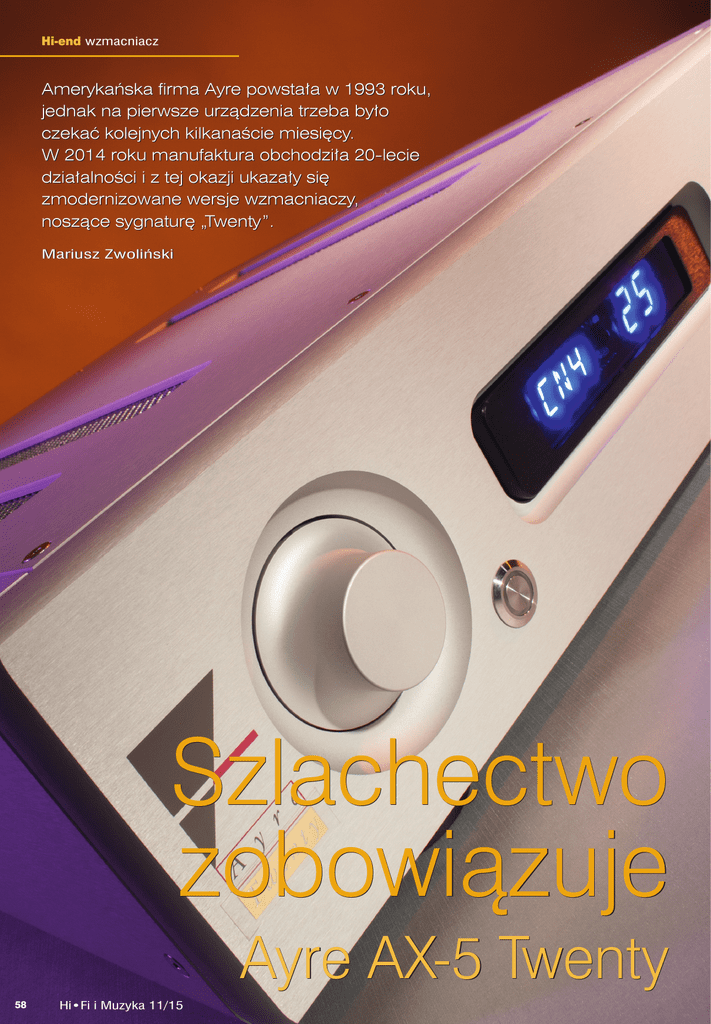 Hi-end wzmacniacz Amerykańska firma Ayre powstała w 1993 roku, jednak na pierwsze urządzenia trzeba było czekać kolejnych kilkanaście miesięcy. W 2014 roku manufaktura obchodziła 20-lecie działalności i z tej okazji ukazały się zmodernizowane wersje wzmacniaczy, noszące sygnaturę „Twenty”. Mariusz Zwoliński Szlachectwo zobowiązuje Ayre AX-5 Twenty 58 Hi•Fi i Muzyka 11/15 Hi-end wzmacniacz ako pierwsza na warsztat poszła seria R i załapała się jeszcze na okrągłą rocznicę. Niższą linię 5 ulepszono dopiero w tym roku. Wzmacniacz AX-5 pojawił się w grudniu 2012, a jego odświeżona wersja – dwa lata później. Tempo przypomina trochę dalekowschodni sektor kina domowego, ale skoro nowy AX-5 ma być lepszy od pierwowzoru, to nie ma co narzekać. Niestety, jest także zła wiadomość: jubileuszowa edycja jest znacznie droższa od pierwszej wersji. Test Ayre AX-5 ukazał się na łamach „HFiM” w wydaniu 7-8/2013. Opisując wersję urodzinową, nie sposób nie wspomnieć o poprzedniej, choć nie będzie to bezpośrednie porównanie. zentuje szlachetny minimalizm, bliższy europejskim gustom. Nie znaczy to, że AX-5 Twenty jest kiepsko wyposażony. Co ciekawe, na podstawie wyglądu trudno ocenić nie tylko jego wiek, ale też cenę. Skromny wizualnie piecyk równie dobrze może kosztować pięć, jak i 25 tysięcy. A kosztuje... o wiele więcej. Panel czołowy, wykonany z litego bloku aluminium, zdobią tylko dwa pokrętła, para podświetlanych przycisków oraz spory wyświetlacz, znacznie ułatwiający życie użytkownikom. Poza aktualnie używanym wejściem i poziomem głośności informuje także o przegrzaniu urządzenia, spaleniu któregoś z bezpieczników i tym podobnych przypadłościach. Żaden z manipulatorów nie został jednak opisany, dlatego przed pierwszym uruchomieniem urządzenia dobrze jest przeczytać instrukcję obsługi. Budowa Wszystkie urządzenia Ayre są budowane ręcznie w siedzibie firmy, w miejscowości Boulder w stanie Kolorado. Całą załogę, w większości z kilkunastoletnim stażem, bez problemu dałoby się upchnąć w mikrobusie. Atmosfera panująca w hali montażowej, o ile pomieszczenie to zasługuje na tę górnolotną nazwę, tchnie spokojem i skupieniem, bez wyśrubowanych planów i korporacyjnej rywalizacji. Dzięki indywidualnemu podejściu i zaangażowaniu osób zatrudnionych przy montażu, urządzenia, choć z żelaza i stali, mają w sobie coś, co można nazwać „duszą”. Podobnie jak dawne instrumenty, niektóre kolumny głośnikowe czy gramofony. Wizualnie rocznicowy wzmacniacz Ayre od zwykłego różni się tylko małą tabliczką z napisem „Twenty”. Wzornictwo ścianki przedniej należy do gatunku tych, których nie ima się upływ czasu. Repre- Wnętrze wzmacniacza jest równie schludne jak jego aparycja. Trafo wspólne, ale resztę zasilania każdy kanał ma własną. Variable Gain Technology w całym swym skomplikowaniu. Na tylnej ściance znajdują się cztery wejścia XLR, wyraźnie preferowane przez konstruktorów Ayre. RCA opisano dopiero na piątym i szóstym miejscu. Także wyjście magnetofonowe zrealizowano na XLR-ach, choć konia z rzędem temu, kto w drugiej dekadzie XXI wieku będzie do niego podłączał kaseciaka lub szpulowca celem zgrania płyt. Jedyne logiczne uzasadnienie to brak wyjścia słuchawkowego, w związku z czym do wyjścia „tape” można podpiąć stosowny przedwzmacniacz. Hi•Fi i Muzyka 11/15 59 Hi-end wzmacniacz Zaciski głośnikowe Cardasa umożliwiają podłączenie kabli zakończonych widełkami. Posiadacze bananów muszą się zaopatrzyć w przejściówki. Duże nakrętki pozwalają mocno docisnąć końcówki. Główny włącznik zasilania znalazł się nad gniazdem IEC, co jest wyraźną sugestią, żeby wzmacniacz pozostawiać pod prądem. Ostanie dwa gniada RJ-11, opisane jako AyreLink, służą do spinania kilku urządzeń w magistralę włączaną jednym przyciskiem. Zanim chwyciłem klucz imbusowy i zabrałem się za rozkręcanie, chwilę delektowałem się dokładnością montażu obudo- wy. Elementy zostały idealnie spasowane i nawet najbardziej drobiazgowa kontrola jakości nie zgłosiłaby zastrzeżeń. Zresztą, wszystkie urządzenia Ayre przez takową przechodzą i to na każdym etapie produkcji, co powinno zapewnić im wiele lat bezawaryjnej pracy. Gdyby jednak coś szwankowało, można spać spokojnie, bowiem posprzedażowa obsługa klientów Ayre należy do najlepszych na świecie. Firma gwarantuje m.in. dożywotni serwis swoich urządzeń, bez względu na to, czy pochodzą od pierwszego właściciela, czy z rynku wtórnego. Wnętrze kryje kilka niespodzianek, a pierwszą z nich napotykamy już na etapie zasilania. Zamiast spodziewanego dużego toroidu, w centralnym miejscu widać klasyczny transformator rdzeniowy, obłożony sztywną gąbką, niwelującą wibracje. Charles Hansen, założyciel i główny konstruktor Ayre, motywuje to tym, że we wzmacniaczach dużej mocy toroidy nie zawsze się dobrze spisują, a ja nie mam podstaw, by mu nie wierzyć. Pomiędzy włącznikiem a trafem zamontowano układ o nazwie AyreConditioner, zapożyczony z firmowego kondy60 Hi•Fi i Muzyka 11/15 cjonera. Ma on redukować szum RFI. Tuż za przednią ścianką znalazły się pozostałe elementy zasilacza AyreLock. W oczy rzuca się 10 kondensatorów elektrolitycznych amerykańskiej firmy Cornell Dubilier, po 10000 μF każdy. Charles Hansen niejednokrotnie podkreślał, że większość podzespołów zamawia u amerykańskich dostawców. Nie jest w tym podejściu odosobniony i nawet jeśli kieruje się wyłącznie patriotyzmem, to przy okazji zyskuje kontrolę nad jakością dostarczanych komponentów. Zasilacz uzupełniają tranzystorowe stabilizatory napięcia, zielone diody prostownicze oraz komplet bezpieczników topikowych. Dystrybucją energii zarządza W górnej części obudowy znalazły się otwory wentylacyjne. Lepiej ich niczym nie zasłania