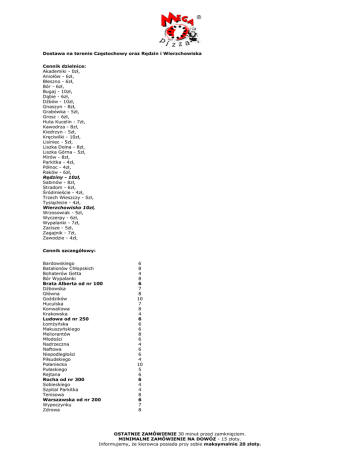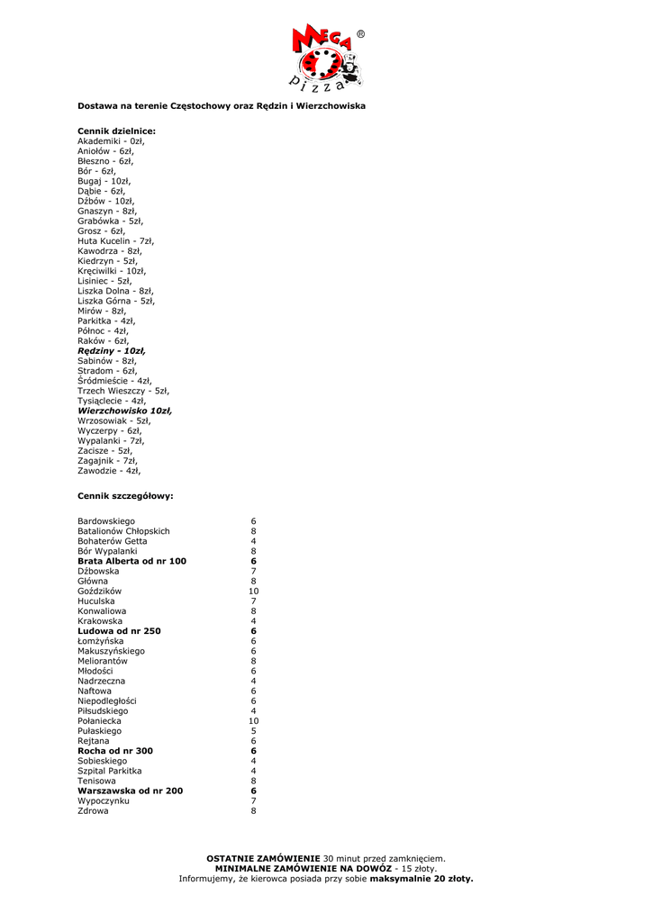 Dostawa na terenie Częstochowy oraz Rędzin i Wierzchowiska Cennik dzielnice: Akademiki - 0zł, Aniołów - 6zł, Błeszno - 6zł, Bór - 6zł, Bugaj - 10zł, Dąbie - 6zł, Dźbów - 10zł, Gnaszyn - 8zł, Grabówka - 5zł, Grosz - 6zł, Huta Kucelin - 7zł, Kawodrza - 8zł, Kiedrzyn - 5zł, Kręciwilki - 10zł, Lisiniec - 5zł, Liszka Dolna - 8zł, Liszka Górna - 5zł, Mirów - 8zł, Parkitka - 4zł, Północ - 4zł, Raków - 6zł, Rędziny - 10zł, Sabinów - 8zł, Stradom - 6zł, Śródmieście - 4zł, Trzech Wieszczy - 5zł, Tysiąclecie - 4zł, Wierzchowisko 10zł, Wrzosowiak - 5zł, Wyczerpy - 6zł, Wypalanki - 7zł, Zacisze - 5zł, Zagajnik - 7zł, Zawodzie - 4zł, Cennik szczegółowy: Bardowskiego Batalionów Chłopskich Bohaterów Getta Bór Wypalanki Brata Alberta od nr 100 Dźbowska Główna Goździków Huculska Konwaliowa Krakowska Ludowa od nr 250 Łomżyńska Makuszyńskiego Meliorantów Młodości Nadrzeczna Naftowa Niepodległości Piłsudskiego Połaniecka Pułaskiego Rejtana Rocha od nr 300 Sobieskiego Szpital Parkitka Tenisowa Warszawska od nr 200 Wypoczynku Zdrowa 6 8 4 8 6 7 8 10 7 8 4 6 6 6 8 6 4 6 6 4 10 5 6 6 4 4 8 6 7 8 OSTATNIE ZAMÓWIENIE 30 minut przed zamknięciem. MINIMALNE ZAMÓWIENIE NA DOWÓZ - 15 złoty. Informujemy, że kierowca posiada przy sobie maksymalnie 20 złoty.