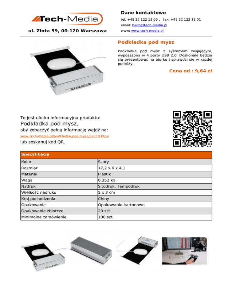 Dane kontaktowe tel. +48 22 122 13 00 , fax. +48 22 122 13 01 email: [email protected] ul. Złota 59, 00-120 Warszawa www: www.tech-media.pl Podkładka pod mysz Podkładka pod mysz z systemem zwijającym, wyposażona w 4 porty USB 2.0. Doskonale będzie się prezentować na biurku i sprawdzi się w każdej podróży. Cena od : 9,64 zł To jest ulotka informacyjna produktu: Podkładka pod mysz , aby zobaczyć pełną informację wejdź na: www.tech-media.pl/podkladka,pod,mysz,02718.html lub zeskanuj kod QR. Specyfikacja Kolor Szary Rozmiar 17,2 x 6 x 4,1 Materiał Plastik Waga 0,352 kg. Nadruk Sitodruk, Tampodruk Wielkość nadruku 5 x 3 cm Kraj pochodzenia Chiny Opakowanie Opakowanie kartonowe Opakowanie zbiorcze 20 szt. Minimalne zamówienie 100 szt.
