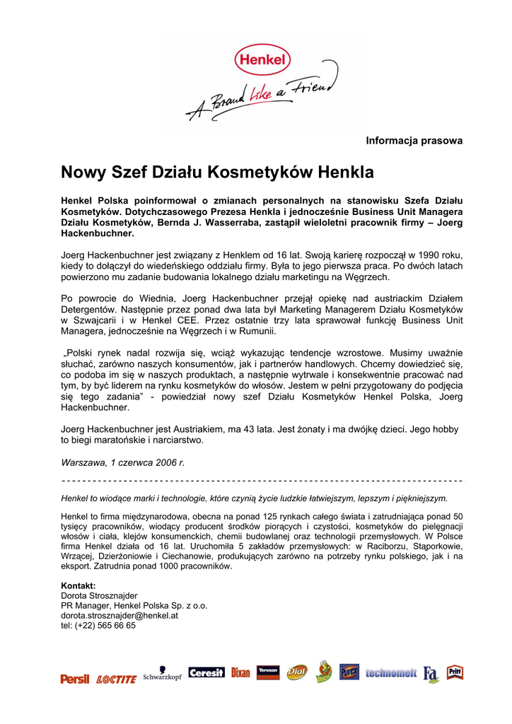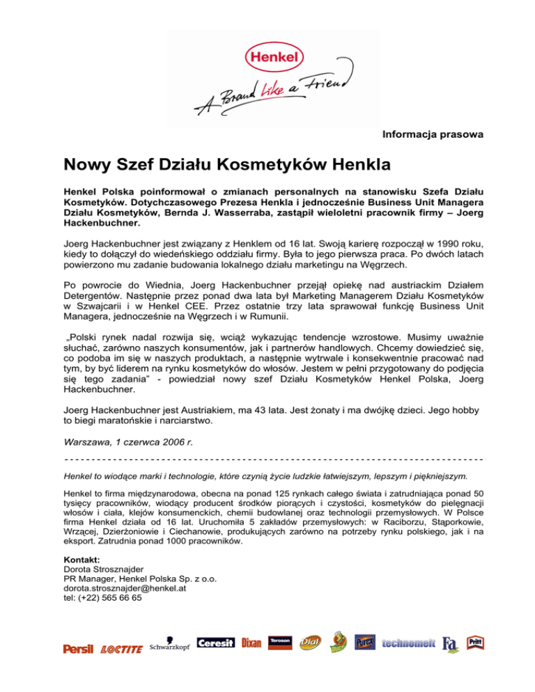 Informacja prasowa Nowy Szef Działu Kosmetyków Henkla Henkel Polska poinformował o zmianach personalnych na stanowisku Szefa Działu Kosmetyków. Dotychczasowego Prezesa Henkla i jednocześnie Business Unit Managera Działu Kosmetyków, Bernda J. Wasserraba, zastąpił wieloletni pracownik firmy – Joerg Hackenbuchner. Joerg Hackenbuchner jest związany z Henklem od 16 lat. Swoją karierę rozpoczął w 1990 roku, kiedy to dołączył do wiedeńskiego oddziału firmy. Była to jego pierwsza praca. Po dwóch latach powierzono mu zadanie budowania lokalnego działu marketingu na Węgrzech. Po powrocie do Wiednia, Joerg Hackenbuchner przejął opiekę nad austriackim Działem Detergentów. Następnie przez ponad dwa lata był Marketing Managerem Działu Kosmetyków w Szwajcarii i w Henkel CEE. Przez ostatnie trzy lata sprawował funkcję Business Unit Managera, jednocześnie na Węgrzech i w Rumunii. „Polski rynek nadal rozwija się, wciąż wykazując tendencje wzrostowe. Musimy uważnie słuchać, zarówno naszych konsumentów, jak i partnerów handlowych. Chcemy dowiedzieć się, co podoba im się w naszych produktach, a następnie wytrwale i konsekwentnie pracować nad tym, by być liderem na rynku kosmetyków do włosów. Jestem w pełni przygotowany do podjęcia się tego zadania” - powiedział nowy szef Działu Kosmetyków Henkel Polska, Joerg Hackenbuchner. Joerg Hackenbuchner jest Austriakiem, ma 43 lata. Jest żonaty i ma dwójkę dzieci. Jego hobby to biegi maratońskie i narciarstwo. Warszawa, 1 czerwca 2006 r. Henkel to wiodące marki i technologie, które czynią życie ludzkie łatwiejszym, lepszym i piękniejszym. Henkel to firma międzynarodowa, obecna na ponad 125 rynkach całego świata i zatrudniająca ponad 50 tysięcy pracowników, wiodący producent środków piorących i czystości, kosmetyków do pielęgnacji włosów i ciała, klejów konsumenckich, chemii budowlanej oraz technologii przemysłowych. W Polsce firma Henkel działa od 16 lat. Uruchomiła 5 zakładów przemysłowych: w Raciborzu, Stąporkowie, Wrzącej, Dzierżoniowie i Ciechanowie, produkujących zarówno na potrzeby rynku polskiego, jak i na eksport. Zatrudnia ponad 1000 pracowników. Kontakt: Dorota Strosznajder PR Manager, Henkel Polska Sp. z o.o. [email protected] tel: (+22) 565 66 65 Magda Gieorgica Mmd Poland - Corporate, Public Affairs & Public Relations Consultants [email protected] tel: (+22) 536 04 63 2
