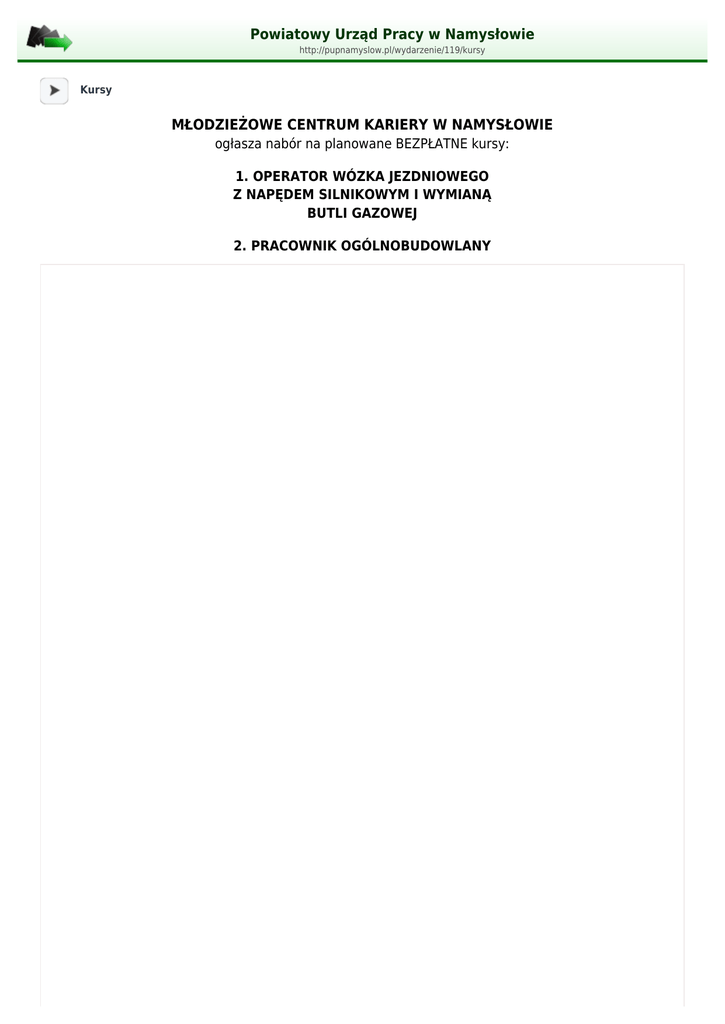 Powiatowy Urząd Pracy w Namysłowie http://pupnamyslow.pl/wydarzenie/119/kursy Kursy MŁODZIEŻOWE CENTRUM KARIERY W NAMYSŁOWIE ogłasza nabór na planowane BEZPŁATNE kursy: 1. OPERATOR WÓZKA JEZDNIOWEGO Z NAPĘDEM SILNIKOWYM I WYMIANĄ BUTLI GAZOWEJ 2. PRACOWNIK OGÓLNOBUDOWLANY .