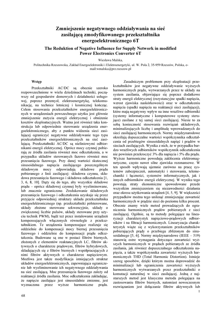 Zmniejszenie negatywnego oddziaływania na sieć zasilającą zmodyfikowanego przekształtnika energoelektronicznego 6T The Reduktion of Negative Influence for Supply Network in modified Power Electronics Converter 6T Wiesława Malska, Politechnika Rzeszowska, Zakład Energoelektroniki i Elektroenergetyki, ul. W. Pola 2, 35-959 Rzeszów, Polska, email:[email protected] Wstęp Przekształtniki AC/DC są obecnie szeroko rozpowszechnione w wielu dziedzinach techniki, począwszy od gospodarstw domowych i działalności usługowej, poprzez przemysł, elektroenergetykę, telekomunikację, na technice lotniczej i kosmicznej kończąc. Celem stosowania przekształtników energoelektronicznych w urządzeniach powszechnego użytku jest głównie zmniejszenie zużycia energii elektrycznej i obniżenie kosztów eksploatacyjnych. Ważna jest również taka konstrukcja lub odpowiednie sterowanie urządzenia energoelektronicznego, aby z punktu widzenia sieci zasilającej ograniczyć negatywne oddziaływanie tego typu przekształtników energoelektronicznych na sieć zasilającą. Przekształtniki AC/DC są nieliniowymi odbiornikami energii elektrycznej. Oprócz mocy czynnej pobierają ze źródła zasilania również moc odkształcenia, a w przypadku układów sterowanych fazowo również moc przesunięcia fazowego. Przy danej wartości skutecznej sinusoidalnego napięcia zasilającego poszczególnym składowym mocy odpowiadają składowe prądu pobieranego z linii zasilającej: składowa czynna, składowa przesunięcia fazowego i składowa odkształcenia [1, 3, 6, 8, 10]. Dąży się do tego, aby wszystkie składowe prądu – oprócz składowej czynnej były wyeliminowane, lub znacznie ograniczone. Zredukowanie składowych przesunięcia fazowego i odkształcenia uzyskuje się przez przyjęcie odpowiedniej struktury układu przekształtnika energoelektronicznego (np. przekształtniki półsterowane, układy złożone sterowane sekwencyjnie, układy o zwiększonej liczbie pulsów, układy sterowane przy użyciu technik PWM), bądź też przez instalowanie urządzeń kompensujących włączonych równolegle z przekształtnikiem. Te urządzenia kompensujące realizuje się oddzielnie do kompensacji mocy biernej przesunięcia fazowego i oddzielnie do kompensacji prądu odkształcenia. Budowane są one w postaci filtrów biernych, złożonych z elementów reaktancyjnych LC, filtrów aktywnych o charakterze prądowym, filtrów hybrydowych, składających się z filtrów biernych i współpracujących z nimi filtrów aktywnych o charakterze napięciowym. Możliwa jest także modyfikacja istniejących struktur układów energoelektronicznych, zapewniająca ograniczenie lub wyeliminowanie ich negatywnego oddziaływania na sieć zasilającą. Moc przesunięcia fazowego zależy od reaktancji źródła zasilania. Moc odkształcenia zakładając, że napięcie zasilające jest sinusoidalnie zmienne, jest wyznaczona przez wyższe harmoniczne prądu. Zasadniczym problemem przy eksploatacji przekształtników jest negatywne oddziaływanie wyższych harmonicznych prądu, wytwarzanych przez te układy na system zasilania, objawiające się poprzez dodatkowe straty energii elektrycznej (rezystancyjne spadki napięcia, wzrost zjawiska naskórkowości) oraz w odkształceniu napięcia (spadki napięcia na reaktancji sieci zasilającej), które mają negatywny wpływ na inne wrażliwe odbiorniki (systemy informatyczne i komputerowe systemy sterujące) zasilane z tej samej sieci zasilającej. Niesie to za sobą konieczność stosowania rozwiązań układowych, minimalizujących liczbę i amplitudę wprowadzanych do sieci zasilającej harmonicznych. Normy międzynarodowe określają dopuszczalne wartości współczynnika odkształcenia od przebiegów sinusoidalnych napięć i prądów w sieciach zasilających. Wynika z nich, że w przypadku bardzo wrażliwych odbiorników współczynnik odkształcenia nie powinien przekroczyć 3% dla napięcia i 5% dla prądu. Wyższe harmoniczne powodują zakłócenia elektromagnetyczne, często nawet silne zjawiska rezonansowe. W ten sposób wpływają ujemnie zarówno na pracę systemów zabezpieczeń, automatyki i sterowania, telemechaniki i łączności, systemów informatycznych, jak i innych odbiorników energii elektrycznej. W wyniku tego powstają straty ekonomiczne spowodowane przede wszystkim zmniejszeniem się niezawodności działania oraz okresu użytkowania urządzeń [4, 5, 9]. W większości przypadków można tego uniknąć zmniejszając zawartość harmonicznych w prądzie sieci do poziomu kilku procent. Obecnie znamy wiele metod prowadzących do ograniczenia harmonicznych prądów pobieranych z sieci zasilającej. Ogólnie, są to metody polegające na linearyzacji charakterystyk napięciowo-prądowych odbiorników i na filtracji harmonicznych. Linearyzacja charakterystyk wiąże się z wykorzystaniem przekształtników pobierających prądy o przebiegu zbliżonym do sinusoidalnego [5, 6]. Normy międzynarodowe (IEEE – 519) stanowią ostre wymagania dotyczące zawartości wyższych harmonicznych w prądach pobieranych ze źródła zasilania, jak również dopuszczalnego odkształcenia napięcia, a także współczynnika zawartości wyższych harmonicznych THD (Total Harmonic Distortion). Istnieje szereg sposobów, dzięki którym można doprowadzić do minimalizacji lub ograniczenia zawartości wyższych harmonicznych wytwarzanych przez przekształtniki o komutacji naturalnej w sieci zasilającej. Jedną z najstarszych metod jest klasyczna metoda polegająca na zastosowaniu filtrów biernych, natomiast nowoczesnym rozwiązaniem jest dołączanie filtrów aktywnych lub 1 68 hybrydowych. Innym stosowanym sposobem jest budowa układów wielopulsowych, realizowana poprzez równoległe lub szeregowe połączenie grup trójfazowych przekształtników mostkowych. Kolejnym sposobem jest stosowanie różnych metod modulacji w obwodzie prądu stałego lub w obwodzie prądu przemie