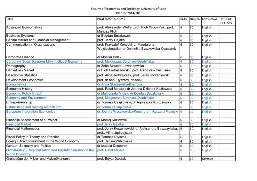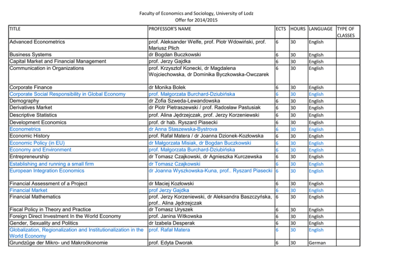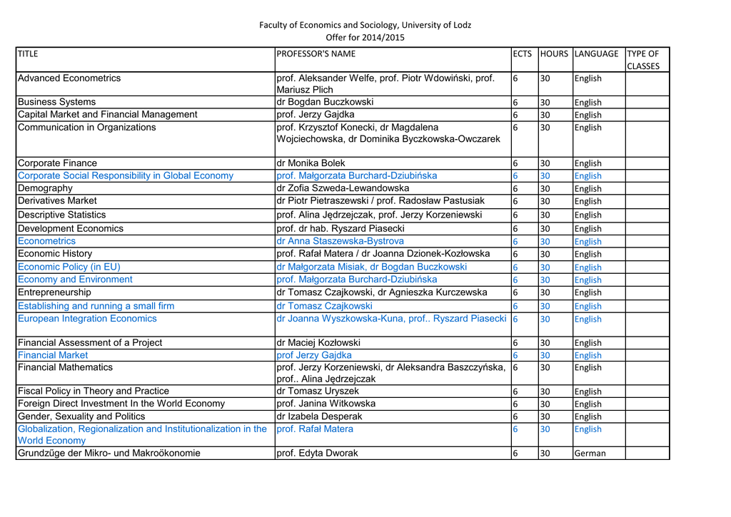 Faculty of Economics and Sociology, University of Lodz Offer for