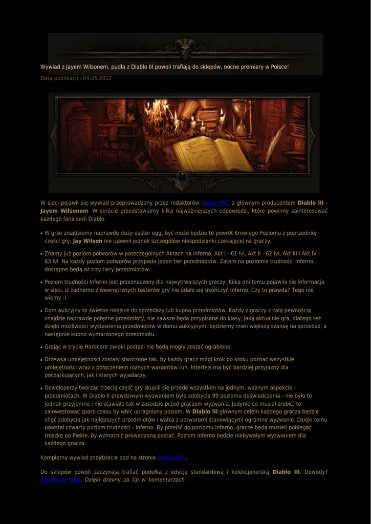 Wywiad z Jayem Wilsonem, pudła z Diablo III powoli trafiają do sklepów, nocne premiery w Polsce! Data publikacji : 04.05.2012 W sieci pojawił się wywiad przeprowadzony przez redaktorów AtomicMPC z głównym producentem Diablo III Jayem Wilsonem. W skrócie przedstawiamy kilka najważniejszych odpowiedzi, które powinny zainteresować każdego fana serii Diablo. ● ● ● ● ● ● ● W grze znajdziemy naprawdę duży easter egg, być może będzie to powrót Krowiego Poziomu z poprzedniej części gry. Jay Wilson nie ujawnił jednak szczegółów niespodzianki czekającej na graczy. Znamy już poziom potworów w poszczególnych Aktach na Inferno. Akt I - 61 lvl, Akt II - 62 lvl, Akt III i Akt IV 63 lvl. Na każdy poziom potworów przypada jeden tier przedmiotów. Zatem na poziomie trudności Inferno, dostępne będą aż trzy tiery przedmiotów. Poziom trudności Inferno jest przeznaczony dla najwytrwalszych graczy. Kilka dni temu pojawiła się informacja w sieci, iż żadnemu z wewnętrznych testerów gry nie udało się ukończyć Inferno. Czy to prawda? Tego nie wiemy :) Dom aukcyjny to świetne miejsce do sprzedaży lub kupna przedmiotów. Każdy z graczy z całą pewnością znajdzie naprawdę potężne przedmioty, nie zawsze będą przypisane do klasy, jaką aktualnie gra, dlatego też dzięki możliwości wystawienia przedmiotów w domu aukcyjnym, będziemy mieli większą szansę na sprzedaż, a następnie kupno wymarzonego przedmiotu. Grając w trybie Hardcore zwłoki postaci nie będą mogły zostać ograbione. Drzewka umiejętności zostały stworzone tak, by każdy gracz mógł krok po kroku poznać wszystkie umiejętności wraz z połączeniem różnych wariantów run. Interfejs ma być bardziej przyjazny dla początkujących, jak i starych wyjadaczy. Deweloperzy tworząc trzecią część gry skupili się przede wszystkim na jednym, ważnym aspekcie przedmiotach. W Diablo II prawdziwym wyzwaniem było zdobycie 99 poziomu doświadczenia - nie było to jednak przyjemne i nie stawiało tak w zasadzie przed graczem wyzwania. Jedynie co musiał zrobić, to zainwestować sporo czasu by wbić upragniony poziom. W Diablo III głównym celem każdego gracza będzie chęć zdobycia jak najlepszych przedmiotów i walka z potworami stanowiącymi ogromne wyzwanie. Dzięki temu powstał czwarty poziom trudności - Inferno. By przejść do poziomu Inferno, gracze będą musieli pobiegać troszkę po Piekle, by wzmocnić prowadzoną postać. Poziom Inferno będzie niebywałym wyzwaniem dla każdego gracza. Kompletny wywiad znajdziecie pod na stronie AtomicMPC. Do sklepów powoli zaczynają trafiać pudełka z edycją standardową i kolekcjonerską Diablo III. Dowody? Zobaczcie tutaj. Dzięki drevny za tip w komentarzach. Strona internetowa informująca o sklepach organizujących nocną premierę została zaktualizowana. Polska trafiła do zakładki, dzięki czemu już teraz możecie przeglądać uzupełnioną listę miast, które organizują nocne premiery z 14 na 15 maja! Autor: Dominik "BeLial" Misiak Data publikacji : 04.05.2012 Data modyfikacji : 04.05.2012 Liczba wyświetleń tekstu: 14414 Tagi: edycja kolekcjonerska, Jay Wilson POWRÓT DRUKUJ PDF POLEĆ ZNAJOMEMU Komentarz (172) dodaj komentarz Nie wie ktoś, czy w Łodzi będzie jakaś nocna premiera?~onekiss 2012/05/05 13:15 ~Onekiss ...w Łodzi bedzie premiera w empiku w manufakturze i w tesco na pojezierskiej, w jednym i drugim miejscu o 21, bede w manufakturze... ;)~Viking84 2012/05/05 13:18 I co da się zrobić grę dla casuali (normal) i dla weteranów (inferno)? Da się:)~Gieszu 2012/05/05 13:33 @ONEKISS http://diablo3.com.pl/forum/index.php?topic=2218.0~kauah 2012/05/05 13:55 Dzięki Wielkie, i do zobaczenia w manufakturze w takim razie :)~onekiss 2012/05/05 14:18 WOOOOOOOOOOOWWWWWWWW !!! Właśnie ukazała się mym oczom reklama Diablo III w TV !!!!!!!! :D :D :D Polsat Sport, w przerwie meczu siatkarskiego Polek (vs. Niemki). Mimo, że widziałem już je wiele razy, to jednak w TV robią zupełnie inny efekt :DDDD W sensie reklamy, nie siatkarki :P (choć i one zapewne też ;) ).~Vendeur 2012/05/05 14:28 Oo to nieźle dobrze wiedzieć że jednak puszczają te reklamę na Polskich programach :)~micio500 2012/05/05 15:12 Ciekaw jestem o ile spadną odporności na kosz, hell i inferno? -30, - 100 i...- 150? Ja zawsze w swoich postaciach dbałem o odporności... @onekiss, Viking - spodziewacie się jakichś eventów u nas? Będą jakieś promocje...? Czy idziecie kupić po prostu?~Bishop 2012/05/05 15:40 ~xennth Ja jestem z Sopotu, ale możliwe, że zdecyduje się na Gdańsk, gdyż pewnie będzie nieco ciekawiej...jeszcze nie podjąłem decyzji;) Jak ktoś z SOPOTU, proszę pisać ^^~duzeciacho 2012/05/05 16:02 jedno mnie dziwi po co ultima reklamuje sprzedarz d3 ek jak wycofano ten produkt calkowicie ze sprzedarzy ~daro676 2012/05/05 16:32 @Bishop Ja osobiście będę polował na kolekcjonerkę, bo niestety ultima się nie popisała i mimo tego, że zamawiałem grubo przed ogłoszeniem premiery to anulowali moje zamówienie:( Co do eventu, ja nic nie wiem czy coś będzie, ale w sumie mogłoby coś umilić mi czekanie w kolejce :D~onekiss 2012/05/05 17:19 ~Bishop ~Onekiss ...dzisiaj bylem dowiedziec sie co jest grane w empiku, w manufakturze, powiedzieli mi, ze na kolekcjonerki nie ma szans, chyba, ze ktos z Was wczesniej zamawial na necie, w empiku, mozliwe, ze cos moga miec ponad nadmiar, ale w cuda raczej bym nie wierzyl, podstawa bedzie na pewno dla wszystkich, od 21 zaczynaja, o 24 sprzedaz egzemplarzy, ~Bishop ...jesli chodzi o jakies atrakcje, to mam nadzieje, ze beda, chociazby z tego wzgledu, ze bedziemy musieli czekac te 3 godziny, od 21 do 24 na odebranie gry... ;) ...tak jeszcze zapytam, jakie jestescie roczniki ? ;)~Viking84 2012/05/05 23:31 87]:-> No i reklama pojawiła się w TV Najpierw zoaczyłem w Discovery Science a potem przeżuciłem na Discvery Chanel i też była ale już końcówka :D~Hoage 