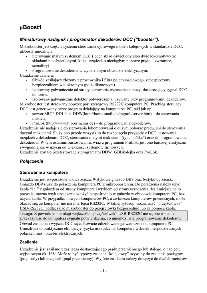 μBoost1 Miniaturowy nadajnik i programator dekoderów DCC (“booster”). Mikrobooster jest częścią systemu sterowania cyfrowego modeli kolejowych w standardzie DCC. μBoost1 umożliwia: • Sterowanie małym systemem DCC (jeden skład oświetlony albo dwie lokomotywy ze składami nieoświetlonymi, kilka urządzeń o nieciągłym poborze prądu – zwrotnice, semafory) • Programowanie dekoderów w wydzielonym obwodzie elektrycznym. Urządzenie zawiera: • Obwód zasilający złożony z prostownika i filtra pojemnościowego, zabezpieczony bezpiecznikiem wielokrotnym (polisilikonowym). • Izolowany galwanicznie od strony sterowania wzmacniacz mocy, dostarczający sygnał DCC do torów. • Izolowany galwanicznie detektor potwierdzenia, używany przy programowaniu dekoderów. Mikrobooster jest sterowany poprzez port szeregowy RS232C komputera PC. Przebieg sterujący DCC jest generowany przez program działający na komputerze PC, taki jak np. • serwer SRCP DDL lub DDW(http://home.snafu.de/mgrafe/server.htm) – do sterowania makietą, • ProLok (http://www.tt.borrmanns.de) – do programowania dekoderów. Urządzenie nie nadaje się do sterowania lokomotywami o dużym poborze prądu, ani do sterowania dużymi makietami. Służy ono przede wszystkim do rozpoczęcia przygody z DCC, testowania urządzeń z dekoderami DCC, sterowania małymi makietami (typu “półka”) oraz do programowania dekoderów. W tym ostatnim zastosowaniu, wraz z programem ProLok, jest ono bardziej elastyczne i wygodniejsze w użyciu od większości systemów firmowych. Urządzenie zostało przetestowane z programami DDW+GBBkolejka oraz ProLok. Połączenia Sterowanie z komputera Urządzenie jest wyposażone w dwa złącza: 9-stykowe gniazdo DB9 oraz 6-stykowy zacisk. Gniazdo DB9 służy do połączenia komputera PC z mikroboosterem. Do połączenia należy użyć kabla “1:1” z gniazdem od strony komputera i wtykiem od strony urządzenia. Jeśli miejsce na to pozwala, można wtyk urządzenia włożyć bezpośrednio w gniazdo w obudowie komputera PC, bez użycia kabla. W przypadku nowych komputerów PC, a zwłaszcza komputerów przenośnych, może okazać się, że komputer nie ma interfejsu RS232C. W takiej sytuacji można użyć “przejściówki” USB-RS232C, podłączając mikrobooster do przejściówki bezpośrednio lub za pomocą kabla. Uwaga: Z powodu konstrukcji większości „przejściówek” USB-RS232C nie są one w stanie przekazywać do komputera sygnału potwierdzenia, co uniemożliwia programowanie dekoderów. Obwód zasilania i wyjścia DCC są całkowicie odizolowane galwanicznie od komputera PC. Umożliwia to praktycznie eliminację ryzyka uszkodzenia komputera wskutek niespodziewanych połączeń mas i przebić elektrycznych. Zasilanie Urządzenie jest zasilane z zasilacza dostarczającego prądu przemiennego lub stałego, o napięciu wyjściowym ok. 16V. Może to być typowy zasilacz “kolejkowy” używany do zasilania pociągów (prąd stały) lub urządzeń (prąd przemienny). Wyjście zasilacza należy dołączyć do dwóch zacisków -1- u dołu płytki mikroboostera, oznaczonych napisem PwrIn na dolnej stronie płytki. Nominalne napięcie w systemie DCC wynosi 14.4V. Spadki napięcia w urządzeniu mają łączną wartość ok. 3V. W przypadku dysponowania zasilaczem regulowanym należy ustawić wartość napięcia zasilania w taki sposób, aby przy braku sterowania z komputera i obciążeniu wyjścia DCC odbiornikiem (np. lokomotywą działającą na prąd stały), wartość napięcia na wyjściu DCC mieściła się w zakresie 14.4..16V. Sterowanie lokomotyw i urządzeń Do sterowania makiety służy wyjście DCCOut, w postaci dwóch zacisków u góry płytki. Uwaga: przy braku sterowania z komputera PC na wyjściu DCC jest obecny prąd stały. Lokomotywy z dekoderami DCC, w których nie zablokowano funkcji “konwersji” (CV29) będą w tej sytuacji jechały z pełną prędkością. Przed włączeniem zasilania należy uruchomić na PC oprogramowanie dostarczające sygnał DCC do mikroboostera. Programowanie dekoderów Do programowania dekoderów służy wyjście ProgOut – dwa zaciski pośrodku płytki. Sygnał na tym wyjściu jest identyczny z sygnałem na wyjściu DCCOut, ale przechodzi on przez układ wykrywania potwierdzenia. Do programowania dekodera w lokomotywie należy umieścić lokomotywę na torze zasilanym z wyjścia ProgOut. W czasie programowania należy odłączyć od boostera wszelkie inne urządzenia DCC poza programowanym dekoderem. W przeciwnym razie dekodery tych urządzeń zostaną zaprogramowane identycznie jak dekoder dołączony do wyjścia ProgOut. Sygnalizacja stanu Do sygnalizacji działania urządzenia służą trzy dwukierunkowe, dwukolorowe diody LED. • Dioda “In” przy złączu RS232C monitoruje sygnał DCC z komputera. W czasie normalnej pracy powinna ona migotać naprzemiennie światłem czerwonym i zielonym. Świecenie kolorem czerwonym oznacza brak sygnału DCC z komputera. • Dioda “Ack” przy złączu RS232C monitoruje sygnał potwierdzenia. W czasie programowania dekodera dioda powinna świecić słabym czerwonym światłem, rozjaśniając się w chwili potwierdzenia. • Dioda “Out” przy wyjściu DCC monitoruje sygnał DCC dostarczany do torów. Podczas normalnej pracy powinna ona migotać tak samo, jak dioda “In”. Brak świecenia diody Out oznacza najczęściej brak zasilania lub wyłączenie zasilania wskutek zadziałania bezpiecznika polisilikonowego. Bezpiecznik ten samoczynnie załączy obwód wyjściowy po kilkudziesięciu sekundach, o ile zwarcie zostało usunięte. W przypadku zadziałania zabezpieczenia układu wzmacniacza, dioda Out albo nie będzie świeciła, albo będzie migotać tylko jednym kolorem. Podobnie jak w przypadku bezpiecznika, należy wówczas usunąć przyczynę zwarcia lub przeciążenia i odczekać kilkadziesiąt sekund. Świecenie diody Out jednym kolorem bez obciążenia, w stanie zimn