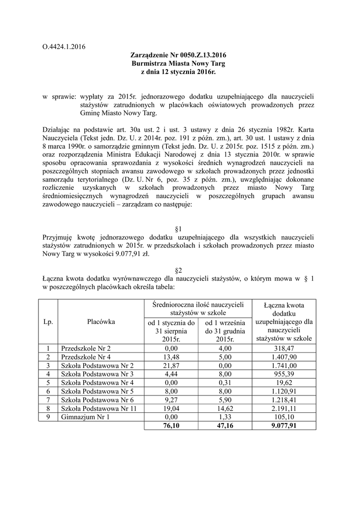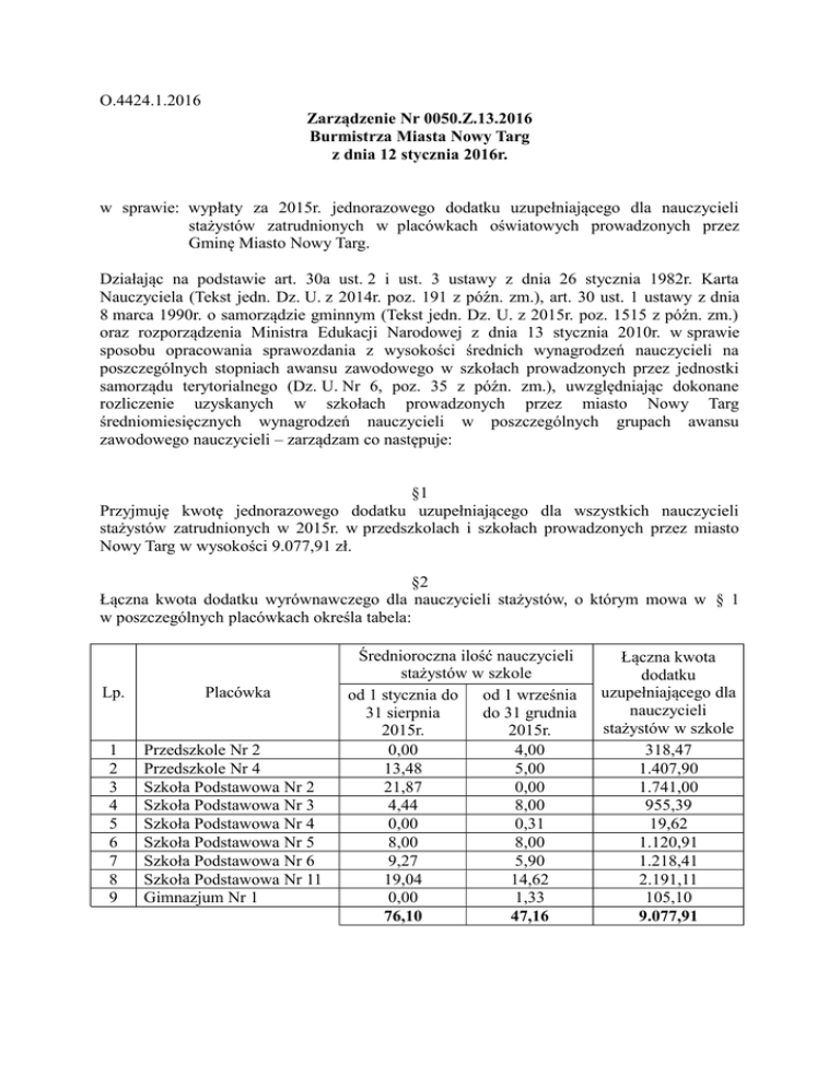 O.4424.1.2016 Zarządzenie Nr 0050.Z.13.2016 Burmistrza Miasta Nowy Targ z dnia 12 stycznia 2016r. w sprawie: wypłaty za 2015r. jednorazowego dodatku uzupełniającego dla nauczycieli stażystów zatrudnionych w placówkach oświatowych prowadzonych przez Gminę Miasto Nowy Targ. Działając na podstawie art. 30a ust. 2 i ust. 3 ustawy z dnia 26 stycznia 1982r. Karta Nauczyciela (Tekst jedn. Dz. U. z 2014r. poz. 191 z późn. zm.), art. 30 ust. 1 ustawy z dnia 8 marca 1990r. o samorządzie gminnym (Tekst jedn. Dz. U. z 2015r. poz. 1515 z późn. zm.) oraz rozporządzenia Ministra Edukacji Narodowej z dnia 13 stycznia 2010r. w sprawie sposobu opracowania sprawozdania z wysokości średnich wynagrodzeń nauczycieli na poszczególnych stopniach awansu zawodowego w szkołach prowadzonych przez jednostki samorządu terytorialnego (Dz. U. Nr 6, poz. 35 z późn. zm.), uwzględniając dokonane rozliczenie uzyskanych w szkołach prowadzonych przez miasto Nowy Targ średniomiesięcznych wynagrodzeń nauczycieli w poszczególnych grupach awansu zawodowego nauczycieli – zarządzam co następuje: §1 Przyjmuję kwotę jednorazowego dodatku uzupełniającego dla wszystkich nauczycieli stażystów zatrudnionych w 2015r. w przedszkolach i szkołach prowadzonych przez miasto Nowy Targ w wysokości 9.077,91 zł. §2 Łączna kwota dodatku wyrównawczego dla nauczycieli stażystów, o którym mowa w § 1 w poszczególnych placówkach określa tabela: Lp. Placówka 1 2 3 4 5 6 7 8 9 Przedszkole Nr 2 Przedszkole Nr 4 Szkoła Podstawowa Nr 2 Szkoła Podstawowa Nr 3 Szkoła Podstawowa Nr 4 Szkoła Podstawowa Nr 5 Szkoła Podstawowa Nr 6 Szkoła Podstawowa Nr 11 Gimnazjum Nr 1 Średnioroczna ilość nauczycieli stażystów w szkole od 1 stycznia do od 1 września 31 sierpnia do 31 grudnia 2015r. 2015r. 0,00 4,00 13,48 5,00 21,87 0,00 4,44 8,00 0,00 0,31 8,00 8,00 9,27 5,90 19,04 14,62 0,00 1,33 76,10 47,16 Łączna kwota dodatku uzupełniającego dla nauczycieli stażystów w szkole 318,47 1.407,90 1.741,00 955,39 19,62 1.120,91 1.218,41 2.191,11 105,10 9.077,91 §3 Zobowiązuje się dyrektorów poszczególnych szkół do określenia kwoty jednorazowego dodatku uzupełniającego (DJ) dla poszczególnych nauczycieli stażystów zatrudnionych w 2015r. w danej placówce przy uwzględnieniu następującej zasady: DJ = WS x SJ gdzie znaczenie poszczególnych symboli jest następujące: WS – iloraz różnicy, o której mowa w art. 30a ust. 2 ustawy Karta Nauczyciela, ustalona dla danego stopnia awansu zawodowego i sumy osobistych stawek wynagrodzenia zasadniczego nauczycieli na danym stopniu awansu zawodowego, ustalonych proporcjonalnie do okresu ich zatrudnienia – wskaźnik obliczany przez organ prowadzący. SJ – osobista stawka wynagrodzenia zasadniczego ustalona proporcjonalnie do okresu zatrudnienia danego nauczyciela. §4 Wskaźnik WS o którym mowa w § 3 zarządzenia dla nauczycieli stażystów zatrudnionych w nowotarskich placówkach oświatowych w 2015r. wynosi – 0,421819 §5 Wypłata jednorazowego dodatku wyrównawczego dla nauczycieli stażystów winna nastąpić do dnia 29 stycznia 2016r. §6 Wykonanie zarządzania zleca się Dyrektorowi Przedszkola Nr 4 w Nowym Targu, Dyrektorowi Przedszkola Nr 2 w Nowym Targu Dyrektorowi Szkoły Podstawowej Nr 2 im. Mikołaja Kopernika w Nowym Targu, Dyrektorowi Szkoły Podstawowej Nr 3 im. Jana Pawła II w Nowym Targu, Dyrektorowi Szkoły Podstawowej Nr 5 im. Konfederacji Tatrzańskiej w Nowym Targu, Dyrektorowi Szkoły Podstawowej Nr 6 im. Józefa Rajskiego Burmistrza Nowego Targu w Nowym Targu, Dyrektorowi Szkoły Podstawowej Nr 11 im. Żołnierzy Armii Krajowej w Nowym Targu, Dyrektorowi Gimnazjum Nr 1 im. Tadeusza Kościuszki w Nowym Targu, Dyrektorowi Zespołu Obsługi Ekonomicznej Szkół i Przedszkoli w Nowym Targu, oraz Naczelnikowi Wydziału Oświaty Urzędu Miasta Nowy Targ. §7 Zarządzenie wchodzi w życie z dniem podjęcia.