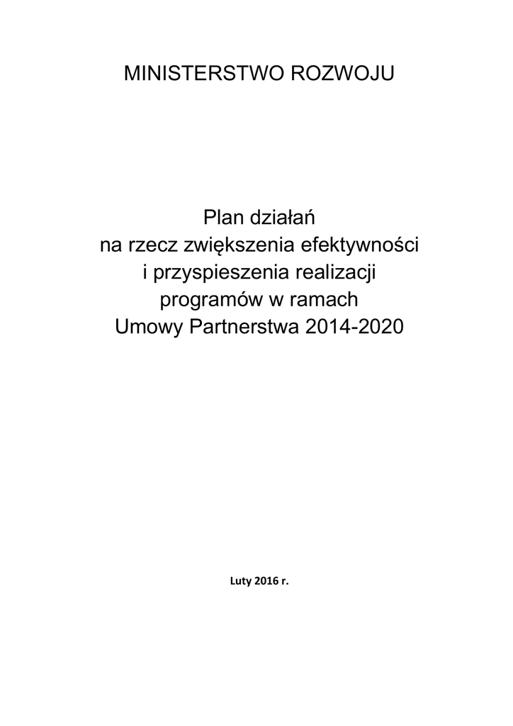 MINISTERSTWO ROZWOJU Plan działań na rzecz zwiększenia efektywności i przyspieszenia realizacji programów w ramach Umowy Partnerstwa 2014-2020 Luty 2016 r. Wstęp W ramach Europejskich Funduszy Strukturalnych i Inwestycyjnych (EFSI) objętych Umową Partnerstwa na lata 2014-2020 Polska dysponuje budżetem środków unijnych w wysokości ok. 82,5 mld euro z Polityki Spójności oraz łącznie ponad 8,6 mld euro na Program Rozwoju Obszarów Wiejskich i ponad 700 mln euro na Program Operacyjny Rybactwo i Morze. Z uwagi na fakt, że jest to tak znaczny budżet środków rozwojowych, dostępna alokacja na cele prorozwojowe musi zostać wykorzystana nie tylko w pełni, ale przede wszystkim w sposób warunkujący dalszy dynamiczny rozwój kraju. Regulacje prawne w funduszy na lata 2014-2020 ustanawiają szereg nowych uwarunkowań dla realizacji interwencji, wśród których szczególne znaczenie w kontekście niniejszego dokumentu mają takie kwestie, jak: • ramy wykonania – tj. ustanowione na etapie programowania cele pośrednie i końcowe dla wsparcia zaplanowanego w danym programie wraz z ustalonymi wskaźnikami. Rozwiązanie to ma na celu zapewnienie ukierunkowania interwencji na rezultaty. Tak zdefiniowane i skwantyfikowane cele będą przedmiotem analizy podczas przeglądu śródokresowego, zaplanowanego na 2019 rok. Wyniki przeglądu będą miały przełożenie na wysokość środków ostatecznie przyznanych w danej osi priorytetowej. • warunki wstępne (warunki ex ante) – tj. katalog wymogów, które muszą zostać spełnione przez państwa członkowskie przed rozpoczęciem realizacji programów lub w pierwszych jej latach (w przypadku Polski do końca 2016 r.). Ich wypełnienie ma na celu przygotowanie odpowiedniego gruntu pod unijne inwestycje, a przez to podniesienie ich efektywności i skuteczności. Niespełnienie warunków wstępnych może być powodem zawieszenia przez Komisję Europejską (KE) płatności na rzecz danego państwa członkowskiego. • koncentracja wsparcia – tj. ukierunkowanie wsparcia na interwencje przynoszące największą wartość dodaną w odniesieniu do realizacji unijnej Strategii na rzecz inteligentnego, zrównoważonego wzrostu sprzyjającego włączeniu społecznemu, z uwzględnieniem najważniejszych wyzwań terytorialnych. W praktyce jest to zobowiązanie państw członkowskich do zastosowania określonych procentowych poziomów alokacji, przeznaczonych na wybrane cele tematyczne (tzw. koncentracja tematyczna, ang.: ring-fencing). • szersze zastosowanie instrumentów finansowych – pomimo wyższego stopnia złożoności tej formy wsparcia, w porównaniu do prostego modelu dotacyjnego, jest ona bardziej efektywna w dłuższej pespektywie czasowej, ponieważ umożliwia długofalowe finansowanie przedsięwzięć prorozwojowych. Jest to także szczególnie istotne w kontekście planowanego wypracowania krajowego modelu finansowania polityki rozwoju. • nowe instrumenty terytorialne – w tym przede wszystkim Zintegrowane Inwestycje Terytorialne (ZIT) i rozwój lokalny kierowany przez społeczność (RLKS). W Polsce ZIT realizowany jest przez 24 Strategie ZIT dla miast i obszarów powiązanych z nimi funkcjonalnie, z czego 17 dotyczy miast wojewódzkich (tzw. ZIT wojewódzkie), a 7 miast subregionalnych. RLKS realizowany będzie z udziałem Europejskiego Funduszu Rolnego na rzecz Rozwoju Obszarów Wiejskich (EFRROW) oraz Europejskiego Funduszu Morskiego i Rybackiego (EFMR) odpowiednio na obszarach wiejskich i rybackich we wszystkich województwach oraz z udziałem Europejskiego Funduszu Rozwoju Regionalnego (EFRR) i Europejskiego Funduszu Społecznego (EFS) na obszarze województw Kujawsko-Pomorskiego i Podlaskiego. • procedura desygnacji – warunkiem koniecznym dla rozpoczęcia przepływów finansowych pomiędzy państwem członkowskim a Komisją Europejską, w postaci wystąpienia z pierwszą deklaracją 2 wydatków oraz wnioskiem o płatność do Komisji Europejskiej, jest zakończenie procesu desygnacji w ramach programu operacyjnego. • rozliczenia roczne – tj. obowiązek przedstawienia przez państwo członkowskie zestawienia wydatków poniesionych w ramach programu w roku obrachunkowym (obejmującym okres od 1 lipca roku n-2 do 30 czerwca roku n-1) do dnia 15 lutego każdego roku n od 2016 do 2025, powiązany z możliwością naliczenia korekt za nieprawidłowo poniesione wydatki. *** Analiza tempa i jakościowego aspektu uruchomienia programów na lata 2014-2020 przeprowadzona w listopadzie 2015 r. wykazała, że odnotowany przebieg wdrażania, zarówno pod względem finansowym, jak i rzeczowym, nie gwarantuje osiągnięcia zakładanych efektów i terminowej realizacji interwencji. Celem niniejszego dokumentu jest zatem wskazanie głównych wyzwań stojących przed instytucjami zaangażowanymi w realizację interwencji na lata 2014-2020 w Polsce w kontekście terminowego wdrożenia programów i osiągnięcia zakładanych w nich efektów, wraz z określeniem niezbędnych działań do podjęcia. Wskazane w dokumencie działania konieczne do podjęcia w programach operacyjnych zostały zaplanowane na 2016 r., niemniej ich pozytywne skutki wykraczają poza ten horyzont czasowy. Realizacja działań niezbędnych do podjęcia, wskazanych w Części III dokumentu oraz aktualność zidentyfikowanych wyzwań i odpowiedzi będą podlegać monitorowaniu i aktualizacji w cyklu kwartalnym, a sformułowane na tej podstawie wnioski z monitoringu i aktualizacja zaleceń będą przedkładane Radzie Ministrów. I. Diagnoza – stan zaawansowania realizacji programów na lata 2014-2020 Kluczowym założeniem niniejszego dokumentu jest postrzeganie zarządzania finansowego, jako narzędzia dla realizacji wysokiej jakości projektów i tym samym zapewnienia wspomnianych we wstępie trwałych rezultatów i podstaw do dalszego rozwoju. Diagnoza zawarta poniżej przedstawia stan uruchomienia programów i stanowi punkt wyjścia do sformułowania d