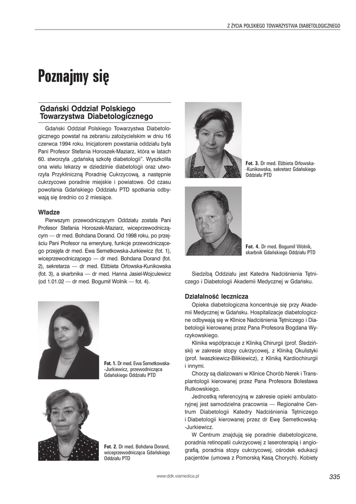 Poznajmy się Z ŻYCIA POLSKIEGO TOWARZYSTWA DIABETOLOGICZNEGO Poznajmy się Gdański Oddział Polskiego Towarzystwa Diabetologicznego Gdański Oddział Polskiego Towarzystwa Diabetologicznego powstał na zebraniu założycielskim w dniu 16 czerwca 1994 roku. Inicjatorem powstania oddziału była Pani Profesor Stefania Horoszek-Maziarz, która w latach 60. stworzyła „gdańską szkołę diabetologii”. Wyszkoliła ona wielu lekarzy w dziedzinie diabetologii oraz utworzyła Przykliniczną Poradnię Cukrzycową, a następnie cukrzycowe poradnie miejskie i powiatowe. Od czasu powołania Gdańskiego Oddziału PTD spotkania odbywają się średnio co 2 miesiące. Fot. 3. Dr med. Elżbieta Orłowska-Kunikowska, sekretarz Gdańskiego Oddziału PTD Władze Pierwszym przewodniczącym Oddziału została Pani Profesor Stefania Horoszek-Maziarz, wiceprzewodniczącym — dr med. Bohdana Dorand. Od 1998 roku, po przejściu Pani Profesor na emeryturę, funkcje przewodniczącego przejęła dr med. Ewa Semetkowska-Jurkiewicz (fot. 1), wiceprzewodniczącego — dr med. Bohdana Dorand (fot. 2), sekretarza — dr med. Elżbieta Orłowska-Kunikowska (fot. 3), a skarbnika — dr med. Hanna Jasiel-Wojculewicz (od 1.01.02 — dr med. Bogumił Wolnik — fot. 4). Fot. 4. Dr med. Bogumił Wolnik, skarbnik Gdańskiego Oddziału PTD Siedzibą Oddziału jest Katedra Nadciśnienia Tętniczego i Diabetologii Akademii Medycznej w Gdańsku. Działalność lecznicza Fot. 1. Dr med. Ewa Semetkowska-Jurkiewicz, przewodnicząca Gdańskiego Oddziału PTD Fot. 2. Dr med. Bohdana Dorand, wiceprzewodnicząca Gdańskiego Oddziału PTD Opieka diabetologiczna koncentruje się przy Akademii Medycznej w Gdańsku. Hospitalizacje diabetologiczne odbywają się w Klinice Nadciśnienia Tętniczego i Diabetologii kierowanej przez Pana Profesora Bogdana Wyrzykowskiego. Klinika współpracuje z Kliniką Chirurgii (prof. Śledziński) w zakresie stopy cukrzycowej, z Kliniką Okulistyki (prof. Iwaszkiewicz-Bilikiewicz), z Kliniką Kardiochirurgii i innymi. Chorzy są dializowani w Klinice Chorób Nerek i Transplantologii kierowanej przez Pana Profesora Bolesława Rutkowskiego. Jednostką referencyjną w zakresie opieki ambulatoryjnej jest samodzielna pracownia — Regionalne Centrum Diabetologii Katedry Nadciśnienia Tętniczego i Diabetologii kierowanej przez dr Ewę Semetkowską-Jurkiewicz. W Centrum znajdują się poradnie diabetologiczne, poradnia retinopatii cukrzycowej z laseroterapią i angiografią, poradnia stopy cukrzycowej, ośrodek edukacji pacjentów (umowa z Pomorską Kasą Chorych). Kobiety www.ddk.viamedica.pl 335 Diabetologia Doświadczalna i Kliniczna rok 2002, tom 2, nr 4 ciężarne z cukrzycą są pod opieką Instytutu Położnictwa i Chorób Kobiecych AMG. Centrum obejmuje wysokospecjalistyczną opieką diabetologiczną pacjentów z województwa pomorskiego, a także ma regionalny nadzór diabetologiczny, prowadzi badania naukowe, szkolenia lekarzy. Dzieci chore na cukrzycę są pod opieką diabetologiczną w Przyklinicznej Poradni Cukrzycowej oraz w Klinice Pediatrii na Oddziale Endokrynologii — zespołem kierują Pani Doktor Bohdana Dorand i Pani Profesor Anna Balcerska. Organizowanie posiedzeń i szkoleń Co 2 miesiące odbywają się posiedzenia Oddziału. Tematyka zebrań obejmuje bieżące zagadnienia, takie jak: 1. Nowa klasyfikacja i wczesne rozpoznawanie cukrzycy; 2. Insulinoterapia; 3. Nowe leki doustne w terapii cukrzycy typu 2; 4. Samokontrola; 5. Nadciśnienie tętnicze u chorych na cukrzycę; 6. Rola inhibitorów ACE w prewencji nefropatii cukrzycowej; 7. Leczenie nerkozastępcze chorych na cukrzycę; 8. Hormonalna terapia zastępcza; 9. Neuropatia cukrzycowa; 10. Retinopatia cukrzycowa; 11. Ocena jakości opieki diabetologicznej w województwie pomorskim; 12. Pompy insulinowe; 13. Zawał serca u chorego na cukrzycę; 14. Stopa cukrzycowa i jej prewencja; 15. Zespoły depresyjne u chorych na cukrzycę; 16. Chory na cukrzycę w miejscu pracy — orzecznictwo; 17. Powikłania dermatologiczne u chorych na cukrzycę. Na posiedzeniach Towarzystwa gościmy wybitne autorytety w dziedzinie diabetologii z kraju i z zagranicy. Ponadto pod patronatem Oddziału odbywają się liczne szkolenia dla lekarzy diabetologów i lekarzy podsta- wowej opieki zdrowotnej prowadzone głównie przez pracowników naukowych AMG, członków zarządu Oddziału. Zorganizowano także kilkudniowe szkolenie na temat podstaw diabetologii ponad 400 lekarzy rodzinnych pod patronatem Gdańskiego Oddziału, konsultanta wojewódzkiego i Regionalnej Pomorskiej Kasy Chorych. Współpraca ze Stowarzyszeniem Chorych na Cukrzycę Na terenie województwa pomorskiego działa Wojewódzki Oddział Polskiego Stowarzyszenia Diabetyków, którego prezesem jest mgr Hanna Zych-Cisoń. Prężnie działają liczne pododdziały. Lekarze uczestniczą w spotkaniach z chorymi, współorganizowane są charytatywne koncerty na rzecz Centrum Diabetologii. Członkowie Oddziału wielokrotnie byli nagradzani Dyplomami Honorowymi Stowarzyszenia Chorych na Cukrzycę i Odznakami Honorowego Członka Stowarzyszenia. Aktywność organizacyjna W 1998 roku w Gdańsku odbyło się spotkanie European Diabetic Nephropathy Study Group EASD. Zostało ono zorganizowane przez dr Elżbietę Orłowską-Kunikowską i dr Ewę Semetkowską-Jurkiewicz, które są członkami tej grupy. W kongresie uczestniczyło około 100 wybitnych uczonych w dziedzinie nefropatii cukrzycowej ze Stanów Zjednoczonych, Wielkiej Brytanii, Danii, Włoch, Izraela, Francji, Niemiec, Japonii, Szwecji, Finlandii — profesorowie Parving, Marre, Viberti, Nosadini, Watkins, Ritz, Bilous, Mauer i inni. Jesteśmy także członkami (dr Semetkowska, dr Wolnik, doc. Bieniaszewski, dr Kruszewski, dr Przeździak) Hypertension in Diabetes EASD Study Group, czynnie uczestniczymy w spotkaniach, prezentujemy prace. Podsumowując, warto wspomnieć o ciężkiej pracy wielu lekarzy prowadzących poradnie cukrzycowe, opiekując