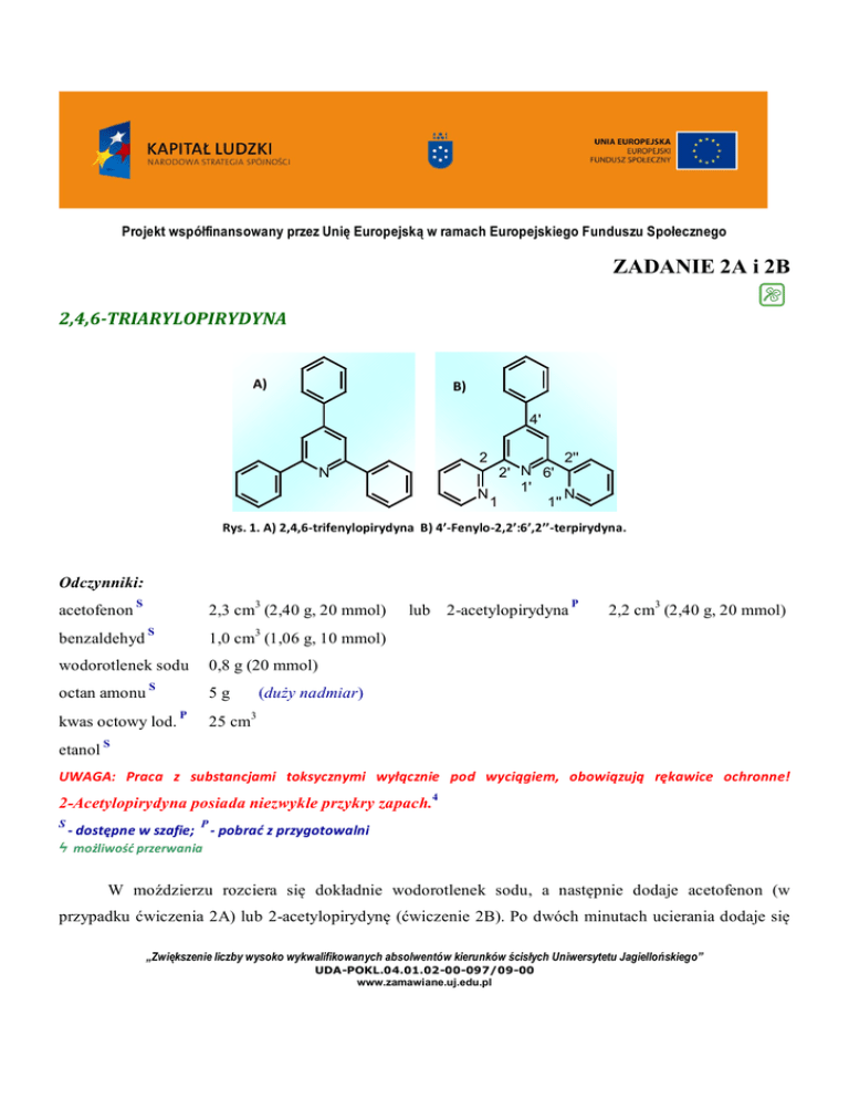 Projekt współfinansowany przez Unię Europejską w ramach Europejskiego Funduszu Społecznego ZADANIE 2A i 2B 2,4,6-TRIARYLOPIRYDYNA A) B) 4' 2 2'' 2' N 6' 1' N N 1 1'' N Rys. 1. A) 2,4,6-trifenylopirydyna B) 4’-Fenylo-2,2’:6’,2’’-terpirydyna. Odczynniki: acetofenon S benzaldehyd 2,3 cm3 (2,40 g, 20 mmol) S P 2,2 cm3 (2,40 g, 20 mmol) 1,0 cm3 (1,06 g, 10 mmol) wodorotlenek sodu 0,8 g (20 mmol) octan amonu S 5g kwas octowy lod. lub 2-acetylopirydyna P (duży nadmiar) 25 cm3 etanol S UWAGA: Praca z substancjami toksycznymi wyłącznie pod wyciągiem, obowiązują rękawice ochronne! 2-Acetylopirydyna posiada niezwykle przykry zapach.4 S - dostępne w szafie; P - pobrać z przygotowalni ϟ możliwość przerwania W moździerzu rozciera się dokładnie wodorotlenek sodu, a następnie dodaje acetofenon (w przypadku ćwiczenia 2A) lub 2-acetylopirydynę (ćwiczenie 2B). Po dwóch minutach ucierania dodaje się „Zwiększenie liczby wysoko wykwalifikowanych absolwentów kierunków ścisłych Uniwersytetu Jagiellońskiego” UDA-POKL.04.01.02-00-097/09-00 www.zamawiane.uj.edu.pl Projekt współfinansowany przez Unię Europejską w ramach Europejskiego Funduszu Społecznego benzaldehyd. W trakcie dalszego ucierania mieszanina zmienia swą barwę, staje się bardziej lepka i ostatecznie zaczyna krystalizować. Zwykle cały proces trwa 10 – 15 minut. Po zakończeniu ucierania zeskrobuje się produkt ze ścianek moździerza1 do kolby stożkowej o pojemności 50 cm3, zawierającej octan amonu i lodowaty kwas octowy. Kolbę zaopatruje się w chłodnicę zwrotną i jej zawartość ogrzewa do wrzenia na mieszadle magnetycznym przez 2 godziny. Następuje zmiana barwy roztworu na niebieski lub zielony, która świadczy o zachodzeniu procesu utlenienia. Po ochłodzeniu dodaje się 10 cm3 wody ϟ i odsącza wydzielony produkt. Osad przemywa się wodą i etanolem2, a w razie potrzeby oczyszcza przez krystalizację z etanolu.3 2,4,6-trifenylopirydyna stanowi bezbarwny produkt o temperaturze topnienia 138 – 139 ºC. Oczyszczona przez krystalizację z etanolu 4’-fenylo-2,2’:6’,2’’-terpirydyna posiada temperaturę topnienia 206 – 208 ºC. Zadania: 1. Napisz mechanizmy reakcji prowadzących do 1,3,5-trifenylopentano-1,5-dionu. Podaj nazwy tych reakcji. 2. W oparciu o rozwiązanie zadania 1 zaprojektuj syntezę 4,6-difenylo-2,3’-bipirydyny. 3. Zarejestrowano widmo 1HNMR 4’-fenylo-2,2’:6’,2’’-terpirydyny [4]: 1 HNMR (δ[ppm]; DMSO-d 6): 8,82 (d, 2H, J = 4,8 Hz), 8,72 (s, 2H), 8,68 (d, 2H, J = 8,0 Hz), 8,04 (dd, 2H, J1 = 8,0 Hz, J2 = 6,4 Hz), 7,93 (dd, 2H, J1 = 6,4 Hz, J2 = 4,8 Hz), 7,63 - 7,52 (m, 5H) Podaj pełną interpretację widma, przypisując sygnały poszczególnym grupom protonów. UWAGI I ZAGOSPODAROWANIE ODPADÓW 1 Moździerz należy spłukać wodą pod dygestorium, a następnie umyć acetonem. 2 Przesącz należy umieścić w pojemniku na odpady W-K. 3 Roztwór po krystalizacji należy umieścić w pojemniku na odpady O. 4 Używane naczynia (pipety, moździerz) należy wymyć 5% roztworem kwasu chlorowodorowego, który potem umieszcza się w pojemniku na odpady W-K „Zwiększenie liczby wysoko wykwalifikowanych absolwentów kierunków ścisłych Uniwersytetu Jagiellońskiego” UDA-POKL.04.01.02-00-097/09-00 www.zamawiane.uj.edu.pl