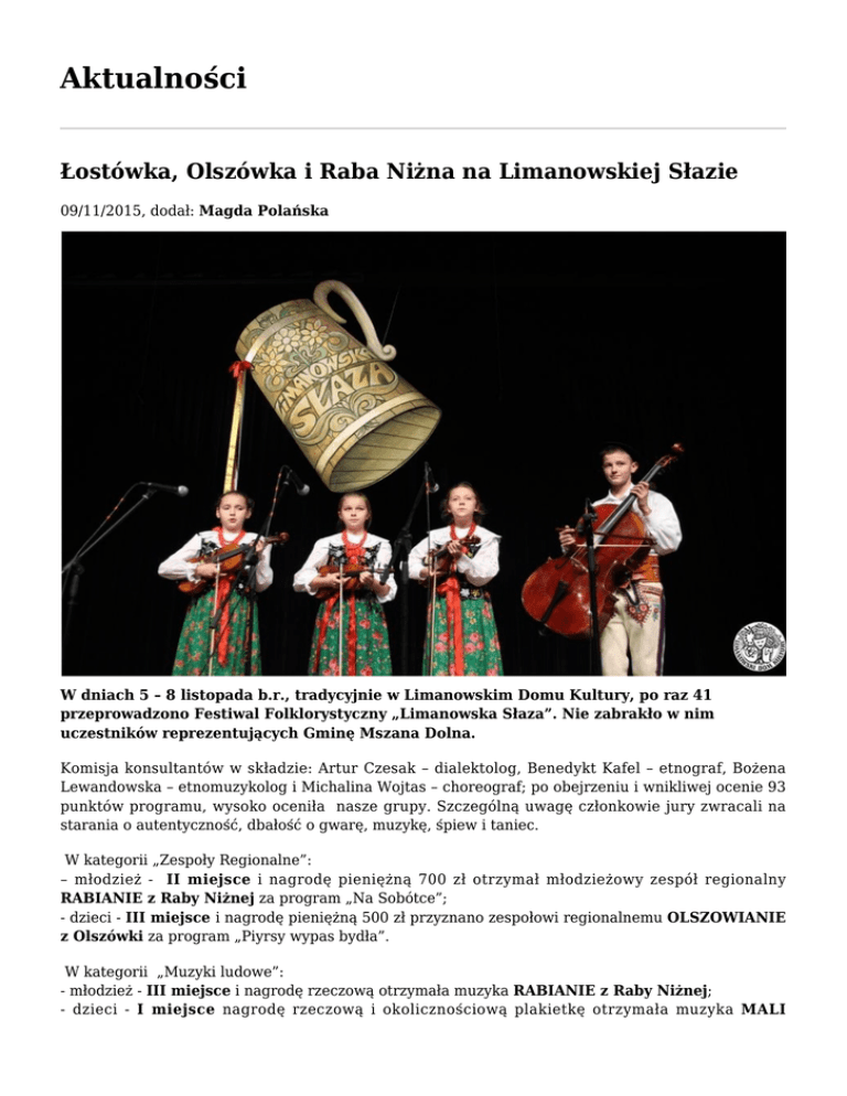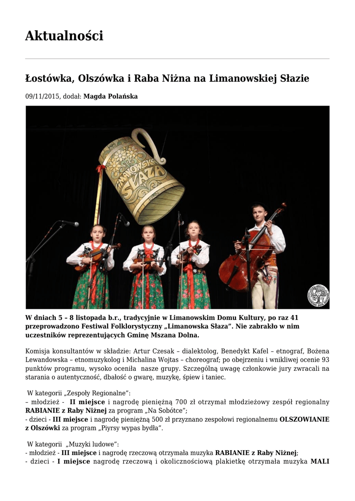 Aktualności Łostówka, Olszówka i Raba Niżna na Limanowskiej Słazie 09/11/2015, dodał: Magda Polańska W dniach 5 – 8 listopada b.r., tradycyjnie w Limanowskim Domu Kultury, po raz 41 przeprowadzono Festiwal Folklorystyczny „Limanowska Słaza”. Nie zabrakło w nim uczestników reprezentujących Gminę Mszana Dolna. Komisja konsultantów w składzie: Artur Czesak – dialektolog, Benedykt Kafel – etnograf, Bożena Lewandowska – etnomuzykolog i Michalina Wojtas – choreograf; po obejrzeniu i wnikliwej ocenie 93 punktów programu, wysoko oceniła nasze grupy. Szczególną uwagę członkowie jury zwracali na starania o autentyczność, dbałość o gwarę, muzykę, śpiew i taniec. W kategorii „Zespoły Regionalne”: – młodzież - II miejsce i nagrodę pieniężną 700 zł otrzymał młodzieżowy zespół regionalny RABIANIE z Raby Niżnej za program „Na Sobótce”; - dzieci - III miejsce i nagrodę pieniężną 500 zł przyznano zespołowi regionalnemu OLSZOWIANIE z Olszówki za program „Piyrsy wypas bydła”. W kategorii „Muzyki ludowe”: - młodzież - III miejsce i nagrodę rzeczową otrzymała muzyka RABIANIE z Raby Niżnej; - dzieci - I miejsce nagrodę rzeczową i okolicznościową plakietkę otrzymała muzyka MALI ŁOSTOWIANIE z Łostówki. W kategorii „Instrumentaliści ludowi” , w grupie dziecięcej gry na skrzypcach I miejsce wraz z nagrodą rzeczową i okolicznościową plakietką trafiło do Tomasza Łabuza z Łostówki. Szczególne gratulacje należą się Pani Marii Nawara z Olszówki, która z tegorocznej „Słazy” przywiozła dwie główne nagrody. Podczas Festiwalu zdobyła I miejsce wraz z nagrodą pieniężną w wysokości 200 zł za „Śpiew solowy” oraz I miejsce i taką samą nagrodę w kategorii „Gawędziarze” – obydwa występy w grupie dorosłych uczestników. Pani Maria została również delegowana przez komisję konkursową na 50. Ogólnopolski Konkurs Gawędziarzy, Instrumentalistów, Drużbów i Starostów Weselnych „Sabałowe Bajania” w Bukowinie Tatrzańskiej (sierpień 2016r.). Również z Olszówki pochodzi Karolina Kraus nagrodzona III miejscem i nagrodą rzeczową w kategorii „Śpiew solowy”. Młoda Olszowianka startowała w grupie dziecięcej. W kategorii „Grupy śpiewacze” – dorośli – II miejsce wraz z nagrodą pieniężną w wysokości 150 zł wyśpiewały gospodynie z KGW Olszówka. W tej samej kategorii, ale młodzieżowej grupie wiekowej, III miejsce wraz z okolicznościową plakietką przyznano „Olszowiankom”, również z Olszówki. W kolejnej kategorii konkursowej, nazwanej „Mistrz i uczeń”, I miejsce wraz z nagrodą pieniężną w wysokości 200 zł przyznano Jakubowi Rusieckiemu wraz z uczennicą Joanną Dudzik z Łostówki. Członkowie komisji w swoim protokole konkursowym podkreślili, że „wieloletni warsztatowy charakter festiwalu w widoczny sposób przyczynił się do stale wzrastającego merytoryczno artystycznego poziomu występujących grup i wszystkich wykonawców. Coroczna konieczność przygotowania nowego programu do występu dopinguje przyszłych uczestników do dalszego pogłębiania merytorycznej wiedzy oraz doskonalenia techniki wykonawczej. Wszystko to powoduje, że ruch folklorystyczny na Ziemi Limanowskiej w swojej większości jest przykładowy w skali Małopolski. Należy tylko mieć nadzieję, że ta z niemałym trudem wypracowana forma prezentacji i doskonalenia warsztatu będzie kontynuowana”. W tegorocznej „Limanowskiej Słazie” udział wzięły 673 osoby w tym: – 13 zespołów regionalnych, 7 dorosłych, 1 młodzieżowy i 5 dziecięcych, – 2 grupy regionalne, – 12 muzyk, 8 dorosłych, 3 młodzieżowe i 1 dziecięca; – 23 instrumentalistów, 11 dorosłych, 3 młodzieżowych i 9 dzieci; – 13 śpiewaków solistów, 7 dorosłych, 3 młodzieżowych, 3 dzieci; – 14 grup śpiewaczych, 9 dorosłych, 2 młodzieżowe i 3 dziecięce; – 10 gawędziarzy, 6 dorosłych i 4 dzieci; – 6 mistrzów z uczniami. Magda Polańska Źródło: www.ldk.limanowa.pl