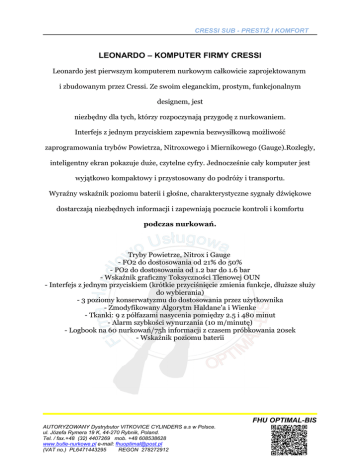 CRESSI SUB - PRESTIŻ I KOMFORT LEONARDO – KOMPUTER FIRMY CRESSI Leonardo jest pierwszym komputerem nurkowym całkowicie zaprojektowanym i zbudowanym przez Cressi. Ze swoim eleganckim, prostym, funkcjonalnym designem, jest niezbędny dla tych, którzy rozpoczynają przygodę z nurkowaniem. Interfejs z jednym przyciskiem zapewnia bezwysiłkową możliwość zaprogramowania trybów Powietrza, Nitroxowego i Miernikowego (Gauge).Rozległy, inteligentny ekran pokazuje duże, czytelne cyfry. Jednocześnie cały komputer jest wyjątkowo kompaktowy i przystosowany do podróży i transportu. Wyraźny wskaźnik poziomu baterii i głośne, charakterystyczne sygnały dźwiękowe dostarczają niezbędnych informacji i zapewniają poczucie kontroli i komfortu podczas nurkowań. Tryby Powietrze, Nitrox i Gauge - FO2 do dostosowania od 21% do 50% - PO2 do dostosowania od 1.2 bar do 1.6 bar - Wskaźnik graficzny Toksyczności Tlenowej OUN - Interfejs z jednym przyciskiem (krótkie przyciśnięcie zmienia funkcje, dłuższe służy do wybierania) - 3 poziomy konserwatyzmu do dostosowania przez użytkownika - Zmodyfikowany Algorytm Haldane'a i Wienke - Tkanki: 9 z półfazami nasycenia pomiędzy 2.5 i 480 minut - Alarm szybkości wynurzania (10 m/minutę) - Logbook na 60 nurkowań/75h informacji z czasem próbkowania 20sek - Wskaźnik poziomu baterii FHU OPTIMAL-BIS AUTORYZOWANY Dystrybutor VITKOVICE CYLINDERS a.s w Polsce. ul. Józefa Rymera 19 K, 44-270 Rybnik, Poland. Tel. / fax.+48 (32) 4407269 mob. +48 608538628 www.butle-nurkowe.pl e-mail: [email protected] (VAT no.) PL6471443295 REGON 278272912 CRESSI SUB - PRESTIŻ I KOMFORT − - Głośne, charakterystyczne sygnały dźwiękowe - Bateria do wymiany przez użytkownika - Jednostki miary do wyboru: Brytyjskie lub Metryczne - Podświetlenie - Wbudowany kalendarz i zegar - Urządzenie można w pełni zresetować w celu wypożyczenia − Cena 790,0 zł brutto Zapraszamy do zakupów ! Oferta ważna do wyczerpania zapasów ! Nie zwlekaj ! FHU OPTIMAL-BIS AUTORYZOWANY Dystrybutor VITKOVICE CYLINDERS a.s w Polsce. ul. Józefa Rymera 19 K, 44-270 Rybnik, Poland. Tel. / fax.+48 (32) 4407269 mob. +48 608538628 www.butle-nurkowe.pl e-mail: [email protected] (VAT no.) PL6471443295 REGON 278272912