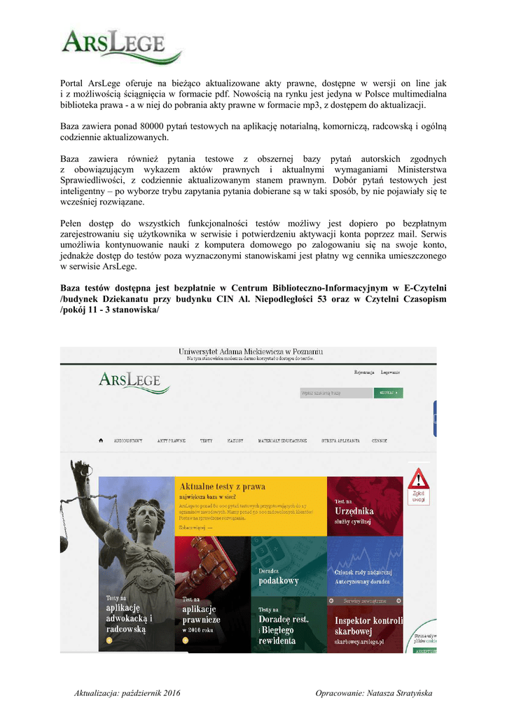 Portal ArsLege oferuje na bieżąco aktualizowane akty prawne, dostępne w wersji on line jak i z możliwością ściągnięcia w formacie pdf. Nowością na rynku jest jedyna w Polsce multimedialna biblioteka prawa - a w niej do pobrania akty prawne w formacie mp3, z dostępem do aktualizacji. Baza zawiera ponad 80000 pytań testowych na aplikację notarialną, komorniczą, radcowską i ogólną codziennie aktualizowanych. Baza zawiera również pytania testowe z obszernej bazy pytań autorskich zgodnych z obowiązującym wykazem aktów prawnych i aktualnymi wymaganiami Ministerstwa Sprawiedliwości, z codziennie aktualizowanym stanem prawnym. Dobór pytań testowych jest inteligentny – po wyborze trybu zapytania pytania dobierane są w taki sposób, by nie pojawiały się te wcześniej rozwiązane. Pełen dostęp do wszystkich funkcjonalności testów możliwy jest dopiero po bezpłatnym zarejestrowaniu się użytkownika w serwisie i potwierdzeniu aktywacji konta poprzez mail. Serwis umożliwia kontynuowanie nauki z komputera domowego po zalogowaniu się na swoje konto, jednakże dostęp do testów poza wyznaczonymi stanowiskami jest płatny wg cennika umieszczonego w serwisie ArsLege. Baza testów dostępna jest bezpłatnie w Centrum Biblioteczno-Informacyjnym w E-Czytelni /budynek Dziekanatu przy budynku CIN Al. Niepodległości 53 oraz w Czytelni Czasopism /pokój 11 - 3 stanowiska/ Aktualizacja: październik 2016 Opracowanie: Natasza Stratyńska