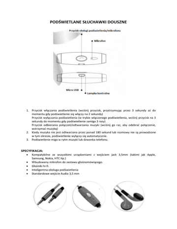 PODŚWIETLANE SŁUCHAWKI DOUSZNE 1. Przycisk włączania podświetlenia (wciśnij przycisk, przytrzymując przez 3 sekundy aż do momentu gdy podświetlenie się włączy na 2 sekundy) Przycisk wyłączania podświetlenia (w trybie włączonego podświetlenia, wciśnij przycisk na 3 sekundy do momentu gdy podświetlenie zamiga 3 razy) Przycisk odbierania połączeń/odtwarzania muzyki (wciśnij go raz, aby odebrać połączenie, wstrzymać muzykę) 2. Kiedy muzyka nie jest odtwarzana przez ponad 180 sekund lub rozmowy nie są prowadzone w tym okresie, podświetlenie wyłączy się automatycznie. 3. Podświetlenie miga w rytm muzyki lub dzwonka telefonu. SPECYFIKACJA: Kompatybilne ze wszystkimi urządzeniami z wejściem jack 3,5mm (takimi jak Apple, Samsung, Nokia, HTC itp.) Wbudowany mikrofon do zestawu głośnomówiącego. Głośniki hi-fi. Inteligentna obsługa podświetlenia Standardowe wejście Audio 3,5 mm