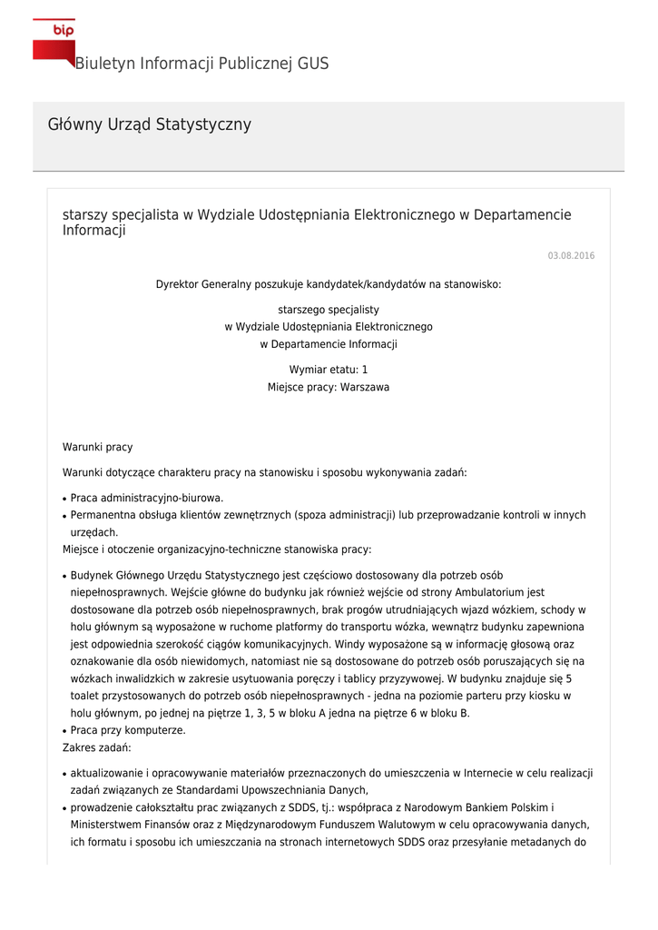 Biuletyn Informacji Publicznej GUS Główny Urząd Statystyczny starszy specjalista w Wydziale Udostępniania Elektronicznego w Departamencie Informacji 03.08.2016 Dyrektor Generalny poszukuje kandydatek/kandydatów na stanowisko: starszego specjalisty w Wydziale Udostępniania Elektronicznego w Departamencie Informacji Wymiar etatu: 1 Miejsce pracy: Warszawa Warunki pracy Warunki dotyczące charakteru pracy na stanowisku i sposobu wykonywania zadań: ● Praca administracyjno-biurowa. ● Permanentna obsługa klientów zewnętrznych (spoza administracji) lub przeprowadzanie kontroli w innych urzędach. Miejsce i otoczenie organizacyjno-techniczne stanowiska pracy: ● Budynek Głównego Urzędu Statystycznego jest częściowo dostosowany dla potrzeb osób niepełnosprawnych. Wejście główne do budynku jak również wejście od strony Ambulatorium jest dostosowane dla potrzeb osób niepełnosprawnych, brak progów utrudniających wjazd wózkiem, schody w holu głównym są wyposażone w ruchome platformy do transportu wózka, wewnątrz budynku zapewniona jest odpowiednia szerokość ciągów komunikacyjnych. Windy wyposażone są w informację głosową oraz oznakowanie dla osób niewidomych, natomiast nie są dostosowane do potrzeb osób poruszających się na wózkach inwalidzkich w zakresie usytuowania poręczy i tablicy przyzywowej. W budynku znajduje się 5 toalet przystosowanych do potrzeb osób niepełnosprawnych - jedna na poziomie parteru przy kiosku w holu głównym, po jednej na piętrze 1, 3, 5 w bloku A jedna na piętrze 6 w bloku B. ● Praca przy komputerze. Zakres zadań: ● aktualizowanie i opracowywanie materiałów przeznaczonych do umieszczenia w Internecie w celu realizacji zadań związanych ze Standardami Upowszechniania Danych, ● prowadzenie całokształtu prac związanych z SDDS, tj.: współpraca z Narodowym Bankiem Polskim i Ministerstwem Finansów oraz z Międzynarodowym Funduszem Walutowym w celu opracowywania danych, ich formatu i sposobu ich umieszczania na stronach internetowych SDDS oraz przesyłanie metadanych do MFW, ● współpraca z jednostkami statystyki publicznej, w celu uzgodnień jednolitości prezentowanych materiałów i aktualizacji, ● współpraca z departamentami GUS, w celu aktualizacji SDDS, ● prowadzenie całokształtu prac związanych ze sprzętem informatycznym na rzecz Departamentu. Wymagania niezbędne: ● Wykształcenie: wyższe, ● doświadczenie zawodowe: 1 rok ● znajomość języka angielskiego na poziomie komunikatywnym, ● znajomość ustawy o statystyce publicznej, ● znajomość ustawy o służbie cywilnej, ● umiejętność obsługi komputera (MS OFFICE), ● specjalistyczna wiedza informatyczna z zakresu budowy portali i tworzenia stron WWW, ● wykorzystywanie wiedzy i doskonalenie zawodowe, ● rzetelność, ● organizacja pracy i orientacja na osiąganie celów, ● komunikacja interpersonalna, komunikacja pisemna, ● współpraca, ● orientacja na klienta/interesanta, ● radzenie sobie w sytuacjach kryzysowych, ● kreatywność, ● posiadanie obywatelstwa polskiego, ● korzystanie z pełni praw publicznych, ● nieskazanie prawomocnym wyrokiem za umyślne przestępstwo lub umyślne przestępstwo skarbowe. Wymagania dodatkowe: ● wykształcenie wyższe informatyczne lub ekonomiczne, ● doświadczenie w tworzeniu stron WWW, ● szkolenia informatyczne w zakresie budowy portali. Dokumenty i oświadczenia niezbędne: ● życiorys/CV i list motywacyjny, ● kopie dokumentów potwierdzających spełnienie wymagania niezbędnego w zakresie wykształcenia, ● kopie dokumentów potwierdzających spełnienie wymagania niezbędnego w zakresie doświadczenia zawodowego/stażu pracy, ● kopie dokumentu potwierdzającego znajomość języka angielskiego na wymaganym poziomie lub oświadczenie o znajomości języka angielskiego na wymaganym poziomie, ● oświadczenie o posiadaniu obywatelstwa polskiego albo kopia dokumentu potwierdzającego posiadanie polskiego obywatelstwa , ● oświadczenie kandydata o wyrażeniu zgody na przetwarzanie danych osobowych do celów naboru, ● oświadczenie o korzystaniu z pełni praw publicznych, ● oświadczenie o nieskazaniu prawomocnym wyrokiem za umyślne przestępstwo lub umyślne przestępstwo skarbowe. Dokumenty i oświadczenia dodatkowe: ● kopia dokumentu potwierdzającego niepełnosprawność - w przypadku kandydatek/kandydatów, zamierzających skorzystać z pierwszeństwa w zatrudnieniu w przypadku, gdy znajdą się w gronie najlepszych kandydatek/kandydatów, ● kopie dokumentów potwierdzających spełnienie wymagania dodatkowego w zakresie wykształcenia informatycznego lub ekonomicznego, ● kopie dokumentów potwierdzających spełnianie wymagania dodatkowego w zakresie doświadczenia w tworzeniu stron WWW, ● kopie dokumentów potwierdzających spełnienie wymagania dodatkowego w zakresie szkoleń informatycznych w zakresie budowy portali. TERMINY I MIEJSCE SKŁADANIA DOKUMENTÓW: Dokumenty należy złożyć do: 17-08-2016 r. Decyduje data: wpływu oferty do urzędu Miejsce składania dokumentów: Główny Urząd Statystyczny Biuro Organizacji i Kadr pok. 234 lub 251 al. Niepodległości 208 00-925 Warszawa (w godz. 815-1615) koniecznie z dopiskiem: oferta nr 79/DI/2016 Inne informacje: W miesiącu poprzedzającym datę upublicznienia ogłoszenia wskaźnik zatrudnienia osób niepełnosprawnych w urzędzie, w rozumieniu przepisów o rehabilitacji zawodowej i społecznej oraz zatrudnianiu osób niepełnosprawnych, nie wynosi co najmniej 6%. Proponowane wynagrodzenie brutto ok. 2 998 zł + dodatek stażowy. Po upływie terminu składania dokumentów w Biuletynie Informacji Publicznej GUS zostanie upowszechniona lista kandydatek/kandydatów spełniających wymagania formalne określone w ogłoszeniu o naborze. Kandydatki/kandydaci spełniający wymagania formalne o kolejnych etapach naboru zostaną poinformowani telefonicznie lub e-mailem. Oferty złożo