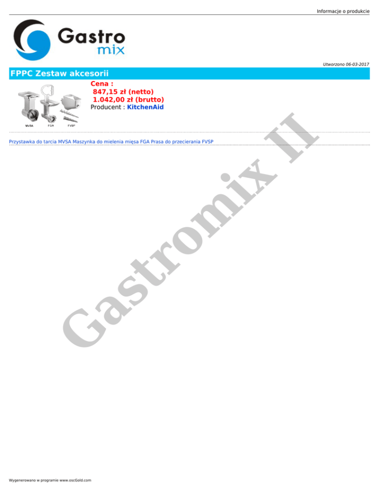 Informacje o produkcie Utworzono 06-03-2017 FPPC Zestaw akcesorii Cena : 847,15 zł (netto) 1.042,00 zł (brutto) G as tr o m ix Przystawka do tarcia MVSA Maszynka do mielenia mięsa FGA Prasa do przecierania FVSP II Producent : KitchenAid Wygenerowano w programie www.oscGold.com