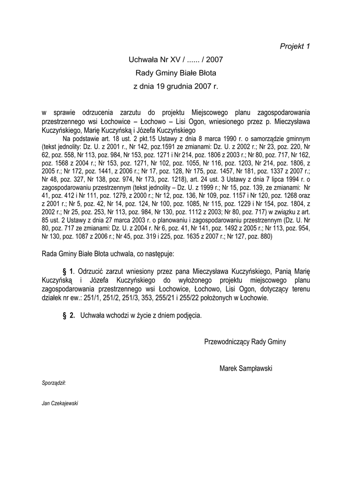 Projekt 1 Uchwała Nr XV / ...... / 2007 Rady Gminy Białe Błota z dnia 19 grudnia 2007 r. w sprawie odrzucenia zarzutu do projektu Miejscowego planu zagospodarowania przestrzennego wsi Łochowice – Łochowo – Lisi Ogon, wniesionego przez p. Mieczysława Kuczyńskiego, Marię Kuczyńską i Józefa Kuczyńskiego Na podstawie art. 18 ust. 2 pkt.15 Ustawy z dnia 8 marca 1990 r. o samorządzie gminnym (tekst jednolity: Dz. U. z 2001 r., Nr 142, poz.1591 ze zmianami: Dz. U. z 2002 r.; Nr 23, poz. 220, Nr 62, poz. 558, Nr 113, poz. 984, Nr 153, poz. 1271 i Nr 214, poz. 1806 z 2003 r.; Nr 80, poz. 717, Nr 162, poz. 1568 z 2004 r.; Nr 153, poz. 1271, Nr 102, poz. 1055, Nr 116, poz. 1203, Nr 214, poz. 1806, z 2005 r.; Nr 172, poz. 1441, z 2006 r.; Nr 17, poz. 128, Nr 175, poz. 1457, Nr 181, poz. 1337 z 2007 r.; Nr 48, poz. 327, Nr 138, poz. 974, Nr 173, poz. 1218), art. 24 ust. 3 Ustawy z dnia 7 lipca 1994 r. o zagospodarowaniu przestrzennym (tekst jednolity – Dz. U. z 1999 r.; Nr 15, poz. 139, ze zmianami: Nr 41, poz. 412 i Nr 111, poz. 1279, z 2000 r.; Nr 12, poz. 136, Nr 109, poz. 1157 i Nr 120, poz. 1268 oraz z 2001 r.; Nr 5, poz. 42, Nr 14, poz. 124, Nr 100, poz. 1085, Nr 115, poz. 1229 i Nr 154, poz. 1804, z 2002 r.; Nr 25, poz. 253, Nr 113, poz. 984, Nr 130, poz. 1112 z 2003; Nr 80, poz. 717) w związku z art. 85 ust. 2 Ustawy z dnia 27 marca 2003 r. o planowaniu i zagospodarowaniu przestrzennym (Dz. U. Nr 80, poz. 717 ze zmianami: Dz. U. z 2004 r. Nr 6, poz. 41, Nr 141, poz. 1492 z 2005 r.; Nr 113, poz. 954, Nr 130, poz. 1087 z 2006 r.; Nr 45, poz. 319 i 225, poz. 1635 z 2007 r.; Nr 127, poz. 880) Rada Gminy Białe Błota uchwala, co następuje: § 1. Odrzucić zarzut wniesiony przez pana Mieczysława Kuczyńskiego, Panią Marię Kuczyńską i Józefa Kuczyńskiego do wyłoŜonego projektu miejscowego planu zagospodarowania przestrzennego wsi Łochowice, Łochowo, Lisi Ogon, dotyczący terenu działek nr ew.: 251/1, 251/2, 251/3, 353, 255/21 i 255/22 połoŜonych w Łochowie. § 2. Uchwała wchodzi w Ŝycie z dniem podjęcia. Przewodniczący Rady Gminy Marek Sampławski Sporządził: Jan Czekajewski 2 Uzasadnienie Mieczysław Kuczyński, Maria Kuczyńska i Józef Kuczyński jako współwłaściciele działek nr ew.: 251/1, 251/2, 251/3, 255/21 i 255/22 połoŜonych w miejscowości Łochowo, gm. Białe Błota wnieśli w dniu 29.06.2007 r. zarzut do wyłoŜonego projektu planu zagospodarowania przestrzennego terenu wsi Łochowice – Łochowo – Lisi Ogon wyraŜając sprzeciw co do wprowadzenia poszerzenia ulicy lokalnej oznaczonej symbolem 0296 KL (ul. Topolowej) oraz wprowadzenia linii zabudowy na wysokości działek nr 255/21 i 255/22 na głębokość 18m od obecnej granicy z ul. Topolową. Wnoszący zarzut w uzasadnieniu twierdzą, Ŝe wprowadzenie poszerzenia ul. Topolowej do 15,0 m w liniach rozgraniczających, biorąc pod uwagę, Ŝe jest to ulica krótka i nie łączy innych ulic jest nieuzasadnione. Odnosząc się do wprowadzonej linii zabudowy na terenie działek 255/21 i 255/22 wnieśli, aby wynosiła 6,0 m od granicy z ulicą, czyli taka jak jest powszechnie stosowana. Po przeanalizowaniu wniesionego zarzutu oraz wnikliwym przeczytaniu rysunku planu stwierdzono, Ŝe przedstawione przez wnoszących argumenty nie odpowiadają sytuacji projektowanej ulicy lokalnej oznaczonej symbolem 0296 KL. Za odrzuceniem zarzutu, o którym mowa w § 1 uchwały przemawiają następujące argumenty: 1) Projektowana droga lokalna oznaczona symbolem 0296 KL zbiera ruch drogowy z przylegających do niej innych dróg lokalnych oznaczonych symbolami 0289 KL, 0290 KL, 0291 KL, 0292 KL, 0299 KL, 0300 KL, 0301 KL, 0302 KL, 0297 KL. Pomimo, Ŝe ulica Topolowa jest stosunkowo krótka, to w przyszłości będzie znacznie obciąŜona ruchem kołowym. Ponadto naleŜy mieć na uwadze, Ŝe w pasie drogowym trzeba będzie umieścić wszystkie media niezbędnej infrastruktury technicznej i przewidzieć chodniki dla ruchu pieszego, który będzie generowany z przylegających obszarów. Biorąc pod uwagę przepisy projektowania dróg przyjęta szerokość pasa drogowego dla projektowanej ul. Topolowej jest właściwa. 2) Wprowadzona nieprzekraczalna linia zabudowy od ul. Topolowej między innymi dla działek 255/21 i 255/22 podyktowana została przebiegiem napowietrznej linii energetycznej, dla której obowiązuje zachowanie strefy ochronnej z zakazem zabudowy. 3) Projekt miejscowego planu natomiast nie dyskwalifikuje istniejącej zabudowy, która przekracza projektowaną linię zabudowy. Istniejące obiekty mogą być uŜytkowane na dotychczasowych zasadach. Za uzasadnieniem prawnym odrzucenia zarzutu, o którym mowa w § 1 uchwały przemawia dodatkowo: Zgodnie z art. 64 Konstytucji RP z dnia 02.kwietnia 1992 roku (Dz. U. Z Dnia 16.lipca 1997r.) „KaŜdy ma prawo do własności, innych praw majątkowych oraz prawo dziedziczenia... Własność moŜe być ograniczona tylko w drodze ustawy i tylko w zakresie w jakim nie narusza ona istoty prawa własności”. Ten przepis chroni prawo własności, jednak zgodnie z art. 10 ust. 1 pkt 2 ustawy o zagospodarowaniu przestrzennym z 1994 r. w planie ustala się w zaleŜności od potrzeb linie rozgraniczające, ulice, place oraz drogi publiczne. W niniejszej sprawie władztwo planistyczne przysługujące gminie na podstawie art. 4 ust. 1 w/w ustawy nie zostało naduŜyte. Przedstawione wyŜej okoliczności faktyczne, przemawiają za usytuowaniem drogi 0296 KL oraz linii zabudowy dla tej drogi w sposób przedstawiony w projekcie planu. Ponadto zastosowane rozwiązanie zagospodarowania terenu w stosunku do wnioskowanego terenu w Łochowie jest spójne z ustaleniami Studium Uwarunkowań i kierunków zagospodarowania przestrzennego Gminy Białe Błota przyjętym Uchwałą Nr XXVIII/235/2001 Rady Gminy Białe Błota z dnia 15.02.2001 r. Dlatego postanowiono odrzucić wniesiony zarzut. Interes publiczny nie mógł być zaspokojony w tej sprawie tylko z wykorzystaniem tren