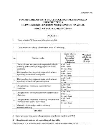 Załącznik nr 2 FORMULARZ OFERTY NA USŁUGĘ KOMPLEKSOWEGO UBEZPIECZENIA GLIWICKIEGO CENTRUM MEDYCZNEGO SP. Z O.O. SIWZ NR 64/13/03/2013/N/Gliwice PAKIET I 1. Nazwa i adres Wykonawcy (ubezpieczyciela): ............................................................................................................................................. 2. Cena ostateczna oferty (słownie) na okres 12 miesięcy: ............................................................................................................................................. Lp. 1 2 3 4 5 6 7 Nazwa ryzyka Udział własny/ franszyza integralna/ franszyza redukcyjna Wysokość składki na okres 12 m-cy Obowiązkowe ubezpieczenie odpowiedzialności cywilnej podmiotu wykonującego działalność leczniczą u.wł.: brak fr.int.: brak fr. red.: brak u.wł.: …….. Dobrowolne ubezpieczenie odpowiedzialności fr.int.: brak cywilnej– działalność medyczna fr. red.: brak u.wł.: brak Dobrowolne ubezpieczenie odpowiedzialności fr.int.: …….. cywilnej– działalność pozamedyczna fr. red.: ……. u.wł.: brak Ubezpieczenie mienia od ognia i innych fr.int.: brak Ŝywiołów fr. red.: …….. u.wł.: brak Ubezpieczenie szyb i przedmiotów szklanych od fr.int.: …… stłuczenia fr. red.: brak u.wł.: brak Ubezpieczenie mienia od kradzieŜy z włamaniem fr.int.: ……. i rabunku oraz ryzyka dewastacji fr. red.: brak Klauzule rozszerzające zakres ochrony ubezpieczeniowej RAZEM - 3. Sumy gwarancyjne, sumy ubezpieczenia oraz limity zgodnie z SIWZ 4. Ubezpieczenie mienia od ognia i innych Ŝywiołów Oświadczam, iŜ w ubezpieczeniu nieruchomości zastosowano stawkę (w %): ……………… Oświadczam, iŜ w ubezpieczeniu ruchomości zastosowano stawkę (w %): ………………… KLAUZULE ROZSZERZAJĄCE ZAKRES OCHRONY UBEZPIECZENIOWEJ Nazwa klauzuli Liczba pkt przypisana klauzuli 1. Klauzula przepięć Obligatoryjna 2. Klauzula reprezentantów Obligatoryjna 3. Klauzula automatycznego pokrycia 4. Klauzula stempla bankowego 5. Klauzula ograniczenia zasady proporcji Obligatoryjna Obligatoryjna Obligatoryjna 6. Klauzula Leeway’a Obligatoryjna 7. Klauzula podatku VAT Obligatoryjna 8. Klauzula remontowa Obligatoryjna 9. Klauzula prac budowlanych Obligatoryjna 10. Klauzula dewastacji Obligatoryjna 11. Klauzula rozliczenia składki Obligatoryjna 12. Klauzula wartości księgowej brutto 13. Klauzula automatycznego pokrycia majątku nabytego po zebraniu danych do SIWZ 14. Klauzula płatności rat 15. Klauzula zniesienia zasady proporcji 16. Klauzula zabezpieczeń przeciwpoŜarowych 17. Klauzula zabezpieczeń przeciwkradzieŜowych 18. Klauzula uderzenia pojazdu własnego 19. Klauzula przeniesienia mienia 20. Klauzula niezawiadomienia w terminie o szkodzie Obligatoryjna Obligatoryjna 5 20 5 10 5 5 10 Składka za 12 mcy Przyjęta TAK/NIE Nazwa klauzuli 21. Klauzula szybkiej likwidacji szkód Liczba pkt przypisana klauzuli 5 23. Klauzula katastrofy budowlanej 10 obiekty sąsiadujące RAZEM Przyjęta TAK/NIE 20 22. Klauzula jurysdykcji 24. Klauzula zniszczenia przez Składka za 12 mcy 20 - - 5. Składka za ubezpieczenie zostanie rozłoŜona na 4 raty. 6. Wykonawca oświadcza, Ŝe zapoznał się z warunkami przetargu, uzyskał wszystkie informacje niezbędne do oszacowania ryzyka, przygotowania oferty i właściwego wykonania zamówienia oraz, Ŝe nie wnosi Ŝadnych zastrzeŜeń do Specyfikacji Istotnych Warunków Zamówienia. Wykonawca oświadcza równieŜ, Ŝe zapoznał się z zapisami Umowy Generalnej i w pełni akceptuje jej treść. 7. Wykonawca oświadcza, Ŝe jest związany niniejszą ofertą przez okres 30 dni od upływu terminu składania ofert. 8. Wykonawcza oświadcza, Ŝe do oferty mają zastosowanie następujące Ogólne Warunki Ubezpieczenia: 1. Dobrowolne ubezpieczenie odpowiedzialności cywilnej – działalność medyczna Obowiązujące OWU:……………………………………………………………, 2. Dobrowolne ubezpieczenie odpowiedzialności cywilnej – działalność pozamedyczna Obowiązujące OWU:……………………………………………………………, 3. Ubezpieczenie mienia od ognia i innych Ŝywiołów Obowiązujące OWU:……………………………………………………………, 4. Ubezpieczenie szyb i przedmiotów szklanych od stłuczenia Obowiązujące OWU:……………………………………………………………, 5. Ubezpieczenie mienia od kradzieŜy z włamaniem i rabunku oraz ryzyka dewastacji Obowiązujące OWU:……………………………………………………………, ........................................., ............................ ......................................................... Miejscowość Data Podpis i pieczęć Wykonawcy