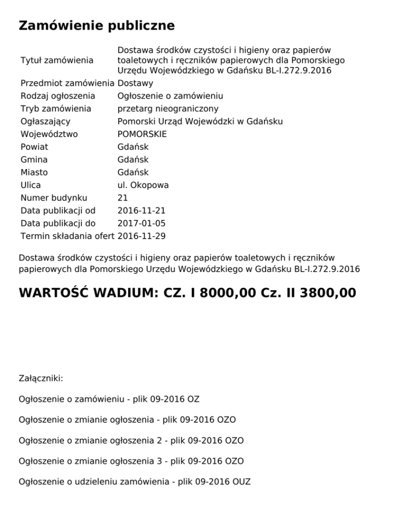 Zamówienie publiczne Tytuł zamówienia Dostawa środków czystości i higieny oraz papierów toaletowych i ręczników papierowych dla Pomorskiego Urzędu Wojewódzkiego w Gdańsku BL-I.272.9.2016 Przedmiot zamówienia Dostawy Rodzaj ogłoszenia Ogłoszenie o zamówieniu Tryb zamówienia przetarg nieograniczony Ogłaszający Pomorski Urząd Wojewódzki w Gdańsku Województwo POMORSKIE Powiat Gdańsk Gmina Gdańsk Miasto Gdańsk Ulica ul. Okopowa Numer budynku 21 Data publikacji od 2016-11-21 Data publikacji do 2017-01-05 Termin składania ofert 2016-11-29 Dostawa środków czystości i higieny oraz papierów toaletowych i ręczników papierowych dla Pomorskiego Urzędu Wojewódzkiego w Gdańsku BL-I.272.9.2016 WARTOŚĆ WADIUM: CZ. I 8000,00 Cz. II 3800,00 Załączniki: Ogłoszenie o zamówieniu - plik 09-2016 OZ Ogłoszenie o zmianie ogłoszenia - plik 09-2016 OZO Ogłoszenie o zmianie ogłoszenia 2 - plik 09-2016 OZO Ogłoszenie o zmianie ogłoszenia 3 - plik 09-2016 OZO Ogłoszenie o udzieleniu zamówienia - plik 09-2016 OUZ