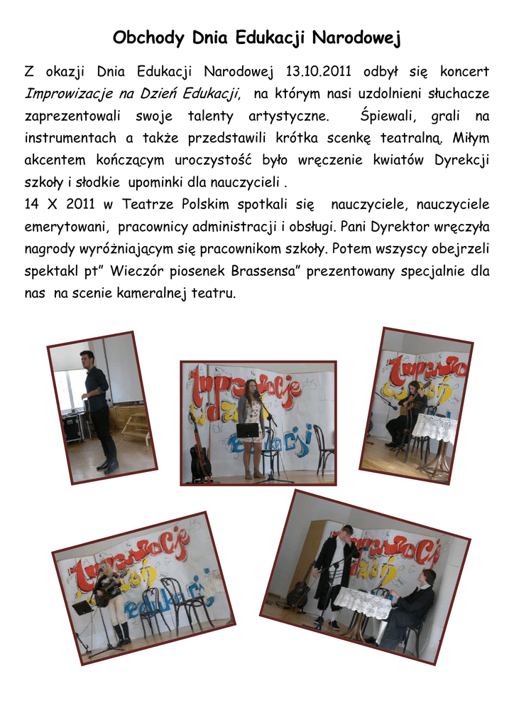 Obchody Dnia Edukacji Narodowej Z okazji Dnia Edukacji Narodowej 13.10.2011 odbył się koncert Improwizacje na Dzień Edukacji, na którym nasi uzdolnieni słuchacze zaprezentowali swoje talenty artystyczne. Śpiewali, grali na instrumentach a także przedstawili krótka scenkę teatralną. Miłym akcentem kończącym uroczystość było wręczenie kwiatów Dyrekcji szkoły i słodkie upominki dla nauczycieli . 14 X 2011 w Teatrze Polskim spotkali się nauczyciele, nauczyciele emerytowani, pracownicy administracji i obsługi. Pani Dyrektor wręczyła nagrody wyróżniającym się pracownikom szkoły. Potem wszyscy obejrzeli spektakl pt” Wieczór piosenek Brassensa” prezentowany specjalnie dla nas na scenie kameralnej teatru.