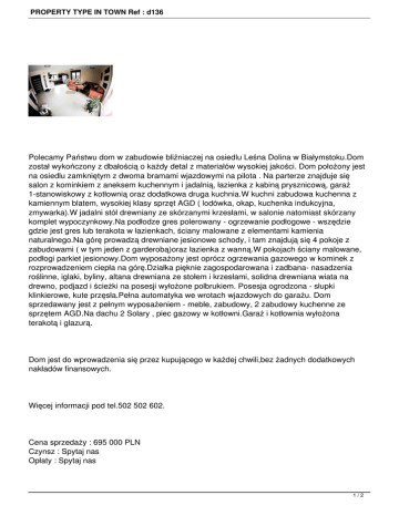 PROPERTY TYPE IN TOWN Ref : d136 Polecamy Państwu dom w zabudowie bliźniaczej na osiedlu Leśna Dolina w Białymstoku.Dom został wykończony z dbałością o każdy detal z materiałów wysokiej jakości. Dom położony jest na osiedlu zamkniętym z dwoma bramami wjazdowymi na pilota . Na parterze znajduje się salon z kominkiem z aneksem kuchennym i jadalnią, łazienka z kabiną prysznicową, garaż 1-stanowiskowy z kotłownią oraz dodatkowa druga kuchnia.W kuchni zabudowa kuchenna z kamiennym blatem, wysokiej klasy sprzęt AGD ( lodówka, okap, kuchenka indukcyjna, zmywarka).W jadalni stół drewniany ze skórzanymi krzesłami, w salonie natomiast skórzany komplet wypoczynkowy.Na podłodze gres polerowany - ogrzewanie podłogowe - wszędzie gdzie jest gres lub terakota w łazienkach, ściany malowane z elementami kamienia naturalnego.Na górę prowadzą drewniane jesionowe schody, i tam znajdują się 4 pokoje z zabudowami ( w tym jeden z garderobą)oraz łazienka z wanną.W pokojach ściany malowane, podłogi parkiet jesionowy.Dom wyposażony jest oprócz ogrzewania gazowego w kominek z rozprowadzeniem ciepła na górę.Działka pięknie zagospodarowana i zadbana- nasadzenia roślinne, iglaki, byliny, altana drewniana ze stołem i krzesłami, solidna drewniana wiata na drewno, podjazd i ścieżki na posesji wyłożone polbrukiem. Posesja ogrodzona - słupki klinkierowe, kute przęsła.Pełna automatyka we wrotach wjazdowych do garażu. Dom sprzedawany jest z pełnym wyposażeniem - meble, zabudowy, 2 zabudowy kuchenne ze sprzętem AGD.Na dachu 2 Solary , piec gazowy w kotłowni.Garaż i kotłownia wyłożona terakotą i glazurą. Dom jest do wprowadzenia się przez kupującego w każdej chwili,bez żadnych dodatkowych nakładów finansowych. Więcej informacji pod tel.502 502 602. Cena sprzedaży : 695 000 PLN Czynsz : Spytaj nas Opłaty : Spytaj nas 1/2 PROPERTY TYPE IN TOWN Ref : d136 Condition : Bardzo dobry Pow. użytkowa : 179.00 m² Wielkość gruntu : 300.00 m² Liczba pokoi : 5 Liczba łazienek : 2 Rok budowy : 2009 Technologia budowy : Cegła Stan prawny : Własność notarialna Zalety : - Woda Prąd Gaz Bliźniak CO- gazowe Kominek Adres : Leśna Dolina, BIAŁYSTOK Osiedle : Os. Leśna Dolina http://nieruchomosciszymborska.pl/index.php?option=com_jea&view=properties&Itemid=15&id= 838 2/2