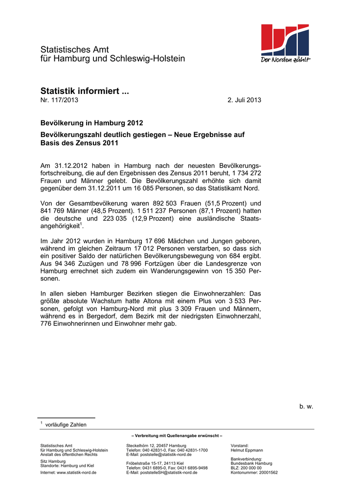 Statistisches Amt für Hamburg und Schleswig-Holstein Statistik informiert ... Nr. 117/2013 2. Juli 2013 Bevölkerung in Hamburg 2012 Bevölkerungszahl deutlich gestiegen – Neue Ergebnisse auf Basis des Zensus 2011 Am 31.12.2012 haben in Hamburg nach der neuesten Bevölkerungsfortschreibung, die auf den Ergebnissen des Zensus 2011 beruht, 1 734 272 Frauen und Männer gelebt. Die Bevölkerungszahl erhöhte sich damit gegenüber dem 31.12.2011 um 16 085 Personen, so das Statistikamt Nord. Von der Gesamtbevölkerung waren 892 503 Frauen (51,5 Prozent) und 841 769 Männer (48,5 Prozent). 1 511 237 Personen (87,1 Prozent) hatten die deutsche und 223 035 (12,9 Prozent) eine ausländische Staatsangehörigkeit1. Im Jahr 2012 wurden in Hamburg 17 696 Mädchen und Jungen geboren, während im gleichen Zeitraum 17 012 Personen verstarben, so dass sich ein positiver Saldo der natürlichen Bevölkerungsbewegung von 684 ergibt. Aus 94 346 Zuzügen und 78 996 Fortzügen über die Landesgrenze von Hamburg errechnet sich zudem ein Wanderungsgewinn von 15 350 Personen. In allen sieben Hamburger Bezirken stiegen die Einwohnerzahlen: Das größte absolute Wachstum hatte Altona mit einem Plus von 3 533 Personen, gefolgt von Hamburg-Nord mit plus 3 309 Frauen und Männern, während es in Bergedorf, dem Bezirk mit der niedrigsten Einwohnerzahl, 776 Einwohnerinnen und Einwohner mehr gab. b. w. 1 vorläufige Zahlen – Verbreitung mit Quellenangabe erwünscht – Statistisches Amt für Hamburg und Schleswig-Holstein Anstalt des öffentlichen Rechts Sitz Hamburg Standorte: Hamburg und Kiel Internet: www.statistik-nord.de Steckelhörn 12, 20457 Hamburg Telefon: 040 42831-0, Fax: 040 42831-1700 E-Mail: [email protected] Fröbelstraße 15-17, 24113 Kiel Telefon: 0431 6895-0, Fax: 0431 6895-9498 E-Mail: [email protected] Vorstand: Helmut Eppmann Bankverbindung: Bundesbank Hamburg BLZ: 200 000 00 Kontonummer: 20001562 –2– Bevölkerungsbestand der Bezirke in Hamburg am 31. Dezember 2012 Gebiet Insgesamt darunter: Ausländer männlich weiblich weiblich insgesamt Hamburg-Mitte 143 145 133 338 276 483 36 299 28 154 64 453 Altona 121 657 130 502 252 159 16 573 15 611 32 184 Eimsbüttel 116 880 129 864 246 744 11 584 12 521 24 105 Hamburg-Nord 132 964 148 057 281 021 14 302 14 581 28 883 Wandsbek 195 107 213 268 408 375 18 750 19 821 38 571 Bergedorf 58 414 61 660 120 074 5 930 5 969 11 899 Harburg 73 602 75 814 149 416 11 950 10 990 22 940 841 769 892 503 1 734 272 115 388 107 647 223 035 Hamburg Basis: Zensus 2011 Kontakt: Dr. Jürgen Delitz Telefon: 040 42831-1847 E-Mail: [email protected] Fachlicher Ansprechpartner: Ulrich Hußing Telefon: 040 42831-1479 E-Mail: [email protected] insgesamt männlich