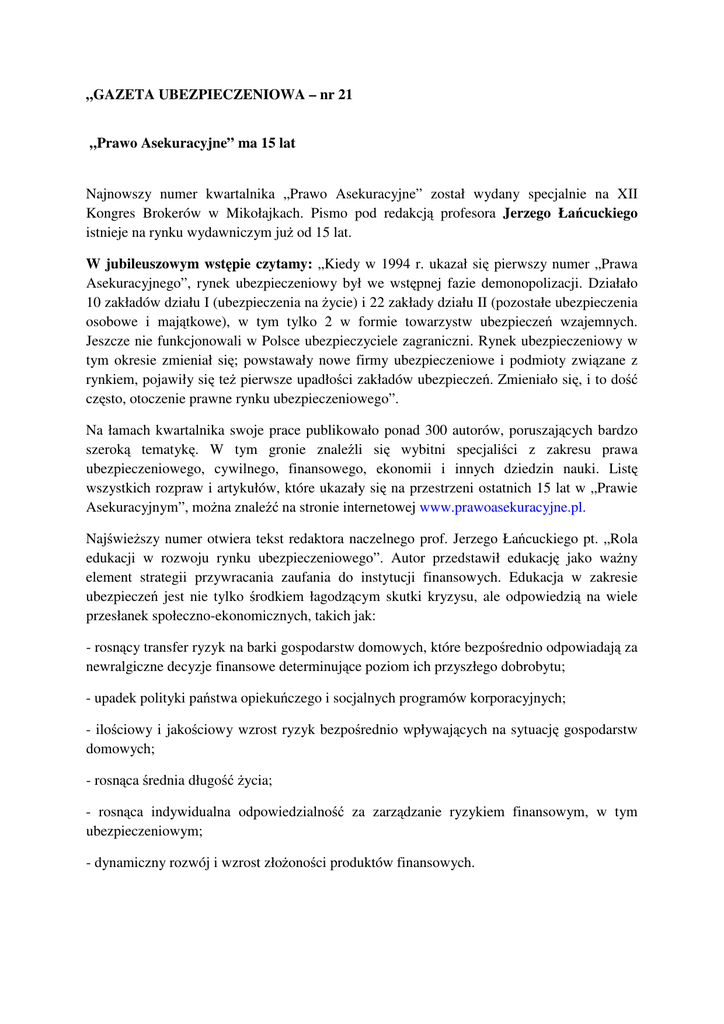 „GAZETA UBEZPIECZENIOWA – nr 21 „Prawo Asekuracyjne” ma 15 lat Najnowszy numer kwartalnika „Prawo Asekuracyjne” został wydany specjalnie na XII Kongres Brokerów w Mikołajkach. Pismo pod redakcją profesora Jerzego Łańcuckiego istnieje na rynku wydawniczym już od 15 lat. W jubileuszowym wstępie czytamy: „Kiedy w 1994 r. ukazał się pierwszy numer „Prawa Asekuracyjnego”, rynek ubezpieczeniowy był we wstępnej fazie demonopolizacji. Działało 10 zakładów działu I (ubezpieczenia na życie) i 22 zakłady działu II (pozostałe ubezpieczenia osobowe i majątkowe), w tym tylko 2 w formie towarzystw ubezpieczeń wzajemnych. Jeszcze nie funkcjonowali w Polsce ubezpieczyciele zagraniczni. Rynek ubezpieczeniowy w tym okresie zmieniał się; powstawały nowe firmy ubezpieczeniowe i podmioty związane z rynkiem, pojawiły się też pierwsze upadłości zakładów ubezpieczeń. Zmieniało się, i to dość często, otoczenie prawne rynku ubezpieczeniowego”. Na łamach kwartalnika swoje prace publikowało ponad 300 autorów, poruszających bardzo szeroką tematykę. W tym gronie znaleźli się wybitni specjaliści z zakresu prawa ubezpieczeniowego, cywilnego, finansowego, ekonomii i innych dziedzin nauki. Listę wszystkich rozpraw i artykułów, które ukazały się na przestrzeni ostatnich 15 lat w „Prawie Asekuracyjnym”, można znaleźć na stronie internetowej www.prawoasekuracyjne.pl. Najświeższy numer otwiera tekst redaktora naczelnego prof. Jerzego Łańcuckiego pt. „Rola edukacji w rozwoju rynku ubezpieczeniowego”. Autor przedstawił edukację jako ważny element strategii przywracania zaufania do instytucji finansowych. Edukacja w zakresie ubezpieczeń jest nie tylko środkiem łagodzącym skutki kryzysu, ale odpowiedzią na wiele przesłanek społeczno-ekonomicznych, takich jak: - rosnący transfer ryzyk na barki gospodarstw domowych, które bezpośrednio odpowiadają za newralgiczne decyzje finansowe determinujące poziom ich przyszłego dobrobytu; - upadek polityki państwa opiekuńczego i socjalnych programów korporacyjnych; - ilościowy i jakościowy wzrost ryzyk bezpośrednio wpływających na sytuację gospodarstw domowych; - rosnąca średnia długość życia; - rosnąca indywidualna odpowiedzialność za zarządzanie ryzykiem finansowym, w tym ubezpieczeniowym; - dynamiczny rozwój i wzrost złożoności produktów finansowych. Autor postuluje stworzenie narodowej strategii w zakresie edukacji finansowej. Koordynatorem prac nad strategią powinna być, zdaniem prof. Łańcuckiego, Komisja Nadzoru Finansowego. U podstaw strategii mogłyby się znaleźć następujące założenia: - kompleksowe i szczegółowe badania przeprowadzone w kraju powinny dostarczyć wiarygodnych danych w celu określenia poziomu „świadomości finansowej” poszczególnych grup społecznych oraz zidentyfikowania najważniejszych potrzeb edukacyjnych społeczeństwa; - poszczególne programy powinny być ukierunkowane na konkretne grupy stosownie do ich zróżnicowanych potrzeb; - strategie marketingowe powinny towarzyszyć każdej inicjatywie w celu maksymalizowania skuteczności jej oddziaływania na daną grupę celową; - musi być zapewnione finansowanie gwarantujące skuteczną realizację tych programów. Na uwagę zasługuje artykuł prof. Eugeniusza Kowalewskiego, dr Dariusza Fuchsa i Michała Piotra Ziemiaka pt. „Implementacja dyrektywy reasekuracyjnej do polskiego porządku prawnego. Autorzy rozważają rozwiązania prawne, które pojawiły się w ustawie z dnia 13 lutego 2009 r. o zmianie ustawy o działalności ubezpieczeniowej oraz niektórych innych ustaw pod wpływem dyrektywy reasekuracyjnej. W tekście znajdziemy omówienie regulacji reasekuracji w prawie wspólnotowym. Następnie autorzy zwracają na luki w nowelizacji ustawy o działalności ubezpieczeniowej. W podsumowaniu zwraca się uwagę na nieuporządkowanie normatywne omawianych przepisów. „Najpoważniejsze wątpliwości interpretacyjne mogą budzić nie do końca jasne przepisy dotyczące definicji działalności reasekuracyjnej, pozycjonujące reasekuratora w stosunku zarówno do ubezpieczyciela, jak i ubezpieczającego – chodzi tu oczywiście o szeroko omówiony art. 3 ust. 1a pkt 4 ustawy”. Dalej autorzy krytykują stworzenie towarzystw reasekuracji wzajemnej. Warto zajrzeć do tekstu Jakuba Nawracały, dyrektora Biura Ubezpieczeń Ochrony Prawnej i Odpowiedzialności Cywilnej Concordia Polska TUW w Poznaniu, pt. „Ubezpieczenie OC rolnika. Odpowiedzialność na zasadzie winy czy ryzyka?”. Zdaniem autora „W przypadku wyrządzenia szkody przy pracach bez wykorzystania maszyn i urządzeń poruszanych za pomocą sił przyrody odpowiedzialność ta będzie opierać się na zasadzie winy. Jeśli zaś szkoda będzie następstwem wykorzystania takich maszyn i urządzeń – podstawą odpowiedzialności będzie zasada ryzyka. W przypadku szkody wyrządzonej przez osobę, nad którą rolnik miał sprawować nadzór – zastosowanie znajdzie art. 427 k.c. wprowadzający odpowiedzialność na zasadzie winy, jednak z domniemaniem istnienia winy w nadzorze”. Jeszcze raz gratulujemy całej redakcji wytrwałości na niełatwym rynku branżowych pism specjalistycznych i życzymy co najmniej następnych 15 lat publikowania wartościowych tekstów, będących inspiracją zarówno dla teoretyków, jak i praktyków ubezpieczeń. Aleksandra Wysocka-Zańko [email protected]