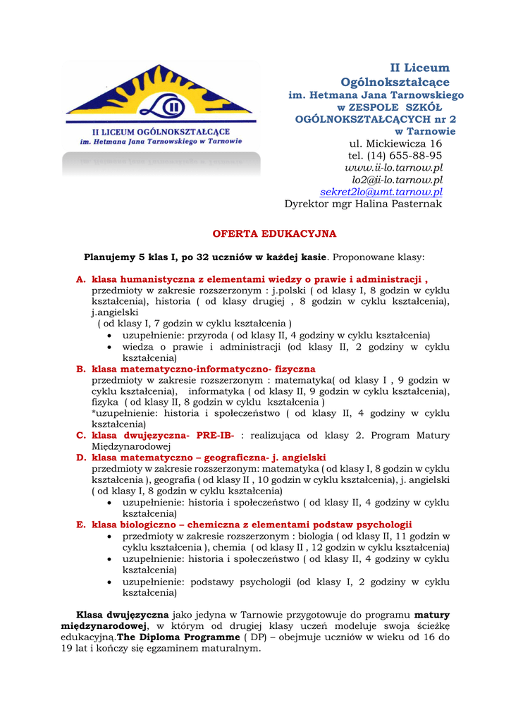 II Liceum Ogólnokształcące im. Hetmana Jana Tarnowskiego w ZESPOLE SZKÓŁ OGÓLNOKSZTAŁCĄCYCH nr 2 w Tarnowie ul. Mickiewicza 16 tel. (14) 655-88-95 www.ii-lo.tarnow.pl [email protected] [email protected] Dyrektor mgr Halina Pasternak OFERTA EDUKACYJNA Planujemy 5 klas I, po 32 uczniów w każdej kasie. Proponowane klasy: A. klasa humanistyczna z elementami wiedzy o prawie i administracji , przedmioty w zakresie rozszerzonym : j.polski ( od klasy I, 8 godzin w cyklu kształcenia), historia ( od klasy drugiej , 8 godzin w cyklu kształcenia), j.angielski ( od klasy I, 7 godzin w cyklu kształcenia ) uzupełnienie: przyroda ( od klasy II, 4 godziny w cyklu kształcenia) wiedza o prawie i administracji (od klasy II, 2 godziny w cyklu kształcenia) B. klasa matematyczno-informatyczno- fizyczna przedmioty w zakresie rozszerzonym : matematyka( od klasy I , 9 godzin w cyklu kształcenia), informatyka ( od klasy II, 9 godzin w cyklu kształcenia), fizyka ( od klasy II, 8 godzin w cyklu kształcenia ) *uzupełnienie: historia i społeczeństwo ( od klasy II, 4 godziny w cyklu kształcenia) C. klasa dwujęzyczna- PRE-IB- : realizująca od klasy 2. Program Matury Międzynarodowej D. klasa matematyczno – geograficzna- j. angielski przedmioty w zakresie rozszerzonym: matematyka ( od klasy I, 8 godzin w cyklu kształcenia ), geografia ( od klasy II , 10 godzin w cyklu kształcenia), j. angielski ( od klasy I, 8 godzin w cyklu kształcenia) uzupełnienie: historia i społeczeństwo ( od klasy II, 4 godziny w cyklu kształcenia) E. klasa biologiczno – chemiczna z elementami podstaw psychologii przedmioty w zakresie rozszerzonym : biologia ( od klasy II, 11 godzin w cyklu kształcenia ), chemia ( od klasy II , 12 godzin w cyklu kształcenia) uzupełnienie: historia i społeczeństwo ( od klasy II, 4 godziny w cyklu kształcenia) uzupełnienie: podstawy psychologii (od klasy I, 2 godziny w cyklu kształcenia) Klasa dwujęzyczna jako jedyna w Tarnowie przygotowuje do programu matury międzynarodowej, w którym od drugiej klasy uczeń modeluje swoja ścieżkę edukacyjną.The Diploma Programme ( DP) – obejmuje uczniów w wieku od 16 do 19 lat i kończy się egzaminem maturalnym. Dwuletni kurs obejmuje sześć przedmiotów wybieranych z szerokiej oferty , nauczanych w małych grupach , w języku angielskim. Zakończony jest zewnętrznie ocenianym egzaminem maturalnym, którego pomyślne zdanie gwarantuje wstęp na światowe uczelnie. Obowiązkowe dla uczniów są trzy komponenty programu: - Extended Essay – studium analityczne wybranego przez ucznia tematu z dowolnego przedmiotu; - Theory of Knowledge – teoria wiedzy, polegająca na nauce krytycznego myślenia, pokazaniu na czym polega proces poznania, czynniki go determinujące, metody i narzędzia właściwe dla różnych dyscyplin; - Creativity, Action, Service – kreatywność, działanie, służba ; pomaga rozwojowi własnemu ucznia, samodoskonaleniu, a także pozwala współuczestniczyć w różnych pracach na rzecz ludzi potrzebujących, lokalnej społeczności czy wspólnoty szkolnej. Szkoła dobrze przygotowuje do zdawania egzaminów z języków obcych – FCE, ACE, DELF, Fit Deutsch, Zertifikat Deutsch. Rozwija współpracę z PWSZ, zwłaszcza z Instytutem Romanistyki. Nasza szkoła jako jedyna w mieście również, od ponad 10 lat, może poszczycić się współpracą z Uniwersytetem Ekonomicznym w Krakowie: uczniowie każdej z klas mogą uczestniczyć w piątkowo-sobotnich zajęciach Studium Menadżerskiego, prowadzonego przez wykładowców tego uniwersytetu. Po 3 latach nauki korzystający z zajęć otrzymuje dyplom ukończenia ww. studium. Od roku 2009/2010 realizowany jest autorski program zajęć z podstaw psychologii. KRYTERIA NABORU. Kryteria przyjęcia reguluje Decyzja Małopolskiego Kuratora Oświaty. Do szkoły przyjęci mogą zostać uczniowie, którzy uzyskają minimum 120 punktów. Do klasy dwujęzycznej PRE-IB odbywa się dodatkowe postępowanie kwalifikacyjne, czyli sprawdzian opanowania języka angielskiego przeprowadzany w maju – ma postać pisemną i ustną. Sprawdzian jest zaliczeniowy. Laureaci konkursów j. angielskiego o zasięgu co najmniej wojewódzkim i kandydaci posiadający certyfikat FCE, CAE, CPE przystępują tylko do części ustnej postępowania kwalifikacyjnego. Przedmioty, które są punktowane przy rekrutacji do poszczególnych klas: klasa a – język polski, historia, język angielski, matematyka, klasa b – język polski, informatyka, fizyka, matematyka, klasa c – język polski, język angielski, historia, matematyka, klasa d – język polski, język angielski, matematyka, geografia, klasa e – język polski, biologia, chemia, fizyka. O SZKOLE II Liceum Ogólnokształcące wraz z Gimnazjum Dwujęzycznym – jedynym w Tarnowie – wchodzi w skład Zespołu Szkół Ogólnokształcących nr 2.Pierwsza matura w tej tarnowskiej szkole odbyła się w 1850 roku. Mimo otwarcia filii gimnazjum chętnych było tak wielu, że postanowiono otworzyć kolejne. Tak powstała druga tego typu szkoła w Tarnowie, której kontynuacją jest II LO. Jest ono zatem szkołą o ponad 100-letniej tradycji- 24 września 2011 II Liceum obchodziło Jubileusz 110-lecia założenia szkoły. Szkoła nasza od ponad 13 lat należy do Towarzystwa Szkół Twórczych, zrzeszającego 33 licea z całego kraju. Wyróżnia nas dbałość o ucznia i kształtowanie jego osobowości tak, by w przyszłości stał się nowoczesnym obywatelem swej „małej” i „dużej” Ojczyzny, a także obywatelem Europy. Atutem szkoły jest międzywydziałowe nauczanie drugiego języka obcego – języka niemieckiego, francuskiego lub rosyjskiego - co stwarza każdemu uczniowi optymalne warunki rozwijania predyspozycji językowych, systematyczny udział młodzieży – z dużymi sukcesami – w międzynarodowych i ogólnopolskich turniejach gier decyzyjnych. Przyporządkowanie do grup nauczania drugiego języka obcego odbywa się z podziałe