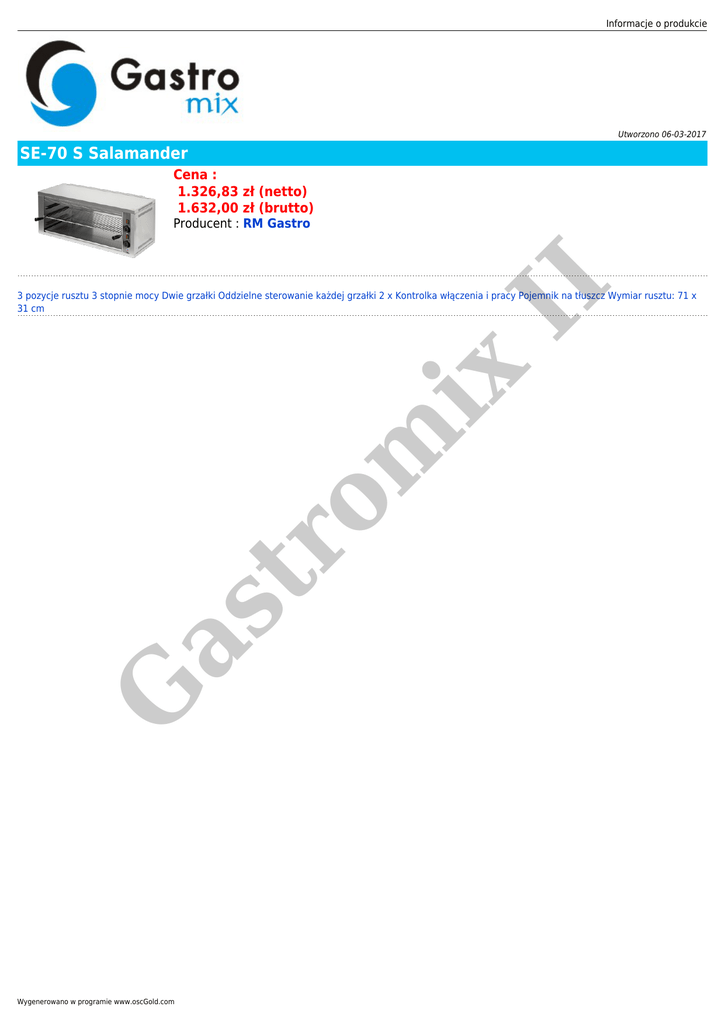 Informacje o produkcie Utworzono 06-03-2017 SE-70 S Salamander Cena : 1.326,83 zł (netto) 1.632,00 zł (brutto) II Producent : RM Gastro G as tr o m ix 3 pozycje rusztu 3 stopnie mocy Dwie grzałki Oddzielne sterowanie każdej grzałki 2 x Kontrolka włączenia i pracy Pojemnik na tłuszcz Wymiar rusztu: 71 x 31 cm Wygenerowano w programie www.oscGold.com