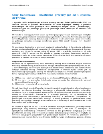 Newsletter, październik 2016 Marek Czernis Kancelaria Radcy Prawnego Ceny transferowe - zaostrzone przepisy już od 1 stycznia 2017 roku 1 stycznia 2017 r. w życie wejdą niektóre przepisy ustawy z dnia 9 października 2015 r. o zmianie ustawy o podatku dochodowym od osób fizycznych, ustawy o podatku dochodowym od osób prawnych oraz niektórych innych ustaw („Nowelizacja”), wprowadzające do polskiego porządku prawnego nowe obowiązki w zakresie cen transferowych. Obowiązki te skupiają się wokół takich aspektów jak progi powiązań kapitałowych pomiędzy podmiotami, progi istotności transakcji oraz progi obrotowe. Ponadto, Nowelizacja przewiduje nowe obligatoryjne elementy dokumentacji podatkowej cen transferowych a także wprowadza do polskiego porządku prawnego postulowane przez OECD zasady Country - by - Country reporting. W powyższym kontekście w pierwszej kolejności wskazać należy, iż Nowelizacja podwyższa poziom powiązań kapitałowych powodujących obowiązek sporządzania dokumentacji. Obecnie, zgodnie z art. 11 ust. 5a ustawy z dnia 15 lutego 1992 r. o podatku dochodowym od osób prawnych („CitU”), wynosi on 5% udziału w kapitale podmiotu. Tymczasem, zgodnie z Nowelizacją, próg ten podwyższony zostanie do 25% udziałów, bądź akcji posiadanych przez podatnika w kapitale zakładowym innego podmiotu. Progi istotności transakcji Odnosząc się do wprowadzonej mocą Nowelizacji zmiany zasad ustalania progów istotności transakcji wskazać należy, iz ustawodawca odstąpił od sztywnej zasady wyrażonej w art. 9a ust. 2 CitU stanowiącej, iż obowiązek sporządzenia dokumentacji podatkowej cen transferowych dotyczy transakcji między podmiotami powiązanymi, w których łączna kwota (lub jej równowartość) wynikająca z umowy lub rzeczywiście zapłacona w roku podatkowym łączna kwota wymagalnych w roku podatkowym świadczeń przekracza równowartość: 1. 100 tys. euro - jeżeli wartość transakcji nie przekracza 20% kapitału zakładowego spółki, 2. 30 tys. euro - w przypadku świadczenia usług, sprzedaży lub udostępnienia wartości niematerialnych i prawnych, 3. 50 tys. euro - w pozostałych przypadkach. W myśl Nowelizacji wysokość progów istotności transakcji uzależniona jest od spełnienia przez podatnika określonego kryterium obrotowego, a obowiązki dokumentacyjne podatników zwiększają się wraz z przyrostem ich przychodów lub zwiększaniem się kosztów w rozumieniu ustawy o rachunkowości. Oznacza to, iż najmniejsi podatnicy nie są zobowiązani do przygotowywania dokumentacji podatkowej transakcji z podmiotami powiązanymi. W powyższym kontekście podkreślenia wymaga, iż kwotą graniczną od przekroczenia której podatnicy zostają objęci obowiązkiem w zakresie cen transferowych, jest równowartość 2 mln euro w skali roku podatkowego. Co istotne w myśl art. 9a ust. 1a CitU w brzmieniu nadanym Nowelizacją, podatnicy którzy przekroczyli próg obrotowy stanowiący równowartość 2 mln euro, są obowiązani do sporządzenia dokumentacji podatkowej również za rok podatkowy następujący po roku podatkowym, za który byli obowiązani sporządzić dokumentację podatkową, bez względu na wysokość osiągniętych przychodów lub poniesionych kosztów, w rozumieniu przepisów o rachunkowości. Innymi słowy, konsekwencją każdorazowego przekroczenia przez podatnika 26 Newsletter, październik 2016 Marek Czernis Kancelaria Radcy Prawnego progu obrotowego wynoszącego równowartość 2 mln euro jest obowiązek sporządzania dokumentacji podatkowej cen transferowych przez co najmniej 2 lata podatkowe. Odmienne progi istotności obowiązują w przypadku transakcji lub innych zdarzeń z podmiotami ulokowanymi w krajach lub na terytoriach stosujących szkodliwą konkurencję podatkową. W takim przypadku próg istotności transakcji wynosi równowartość 20 tys. euro. Wpływ progów obrotowych na progi istotności transakcji W przypadku podatników spełniających kryterium obrotowe 2 mln euro oraz dokonujących w skali roku podatkowego transakcji z podmiotami powiązanymi, progi istotności transakcji uzależnione są od wartości przychodów osiąganych przez tych podatników w skali roku podatkowego. Minimalny próg istotności transakcji wynosi równowartość 50 tys. euro, przy czym wartość tego progu wzrasta wraz ze zwiększaniem się przychodów osiąganych przez podatnika, w ten sposób, że w przypadku gdy: 1. przychody podatnika przekroczyły równowartość 2 mln euro, lecz nie przekroczyły równowartości 20 mln euro próg istotności wynosi równowartość 50 tys. euro i ulega on zwiększeniu o 5 tys. euro za każdy 1 mln euro przychodu powyżej 2 mln euro; 2. przychody podatnika przekroczyły równowartość 20 mln euro, lecz nie przekroczyły równowartości 100 mln euro, próg istotności wynosi równowartość 140 tys. euro i ulega on zwiększeniu o 45 tys. euro za każde 10 mln euro przychodu powyżej 20 mln euro; 3. przychody podatnika przekroczyły równowartość 100 mln euro - próg istotności przekracza równowartość kwoty 500 tys. euro. Wpływ progów obrotowych na zakres dokumentacji podatkowej cen transferowych W myśl Nowelizacji, również zakres obligatoryjnych elementów dokumentacji podatkowej cen transferowych jest uzależniony od spełnienia przez podatnika określonego kryterium obrotowego. W tym zakresie, Nowelizacja wyróżnia trzy kategorie podatników: 1. podatnicy, których przychody lub koszty w roku podatkowym przekraczają 2 mln euro, 2. podatnicy, których przychody lub koszty w roku podatkowym przekraczają 10 mln euro, 3. podatnicy, których przychody lub koszty w roku podatkowym przekraczają 20 mln euro. W przypadku podatników, których przychody lub koszty w roku podatkowym przekraczają 2 mln euro, dokumentacja podatkowa cen transferowych powinna zawierać: 1. opis dokumentowanej transakcji, określając jej rodzaj i przedmiot oraz dotyczące jej dane fin