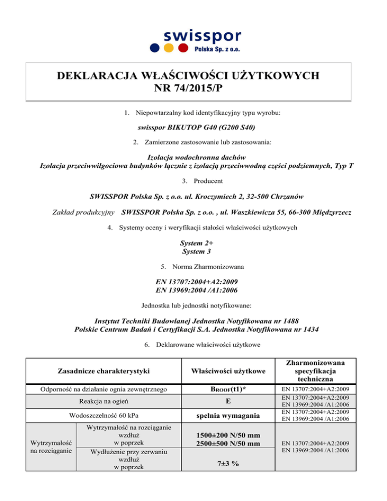 DEKLARACJA WŁAŚCIWOŚCI UŻYTKOWYCH NR 74/2015/P 1. Niepowtarzalny kod identyfikacyjny typu wyrobu: swisspor BIKUTOP G40 (G200 S40) 2. Zamierzone zastosowanie lub zastosowania: Izolacja wodochronna dachów Izolacja przeciwwilgociowa budynków łącznie z izolacją przeciwwodną części podziemnych, Typ T 3. Producent SWISSPOR Polska Sp. z o.o. ul. Kroczymiech 2, 32-500 Chrzanów Zakład produkcyjny SWISSPOR Polska Sp. z o.o. , ul. Waszkiewicza 55, 66-300 Międzyrzecz 4. Systemy oceny i weryfikacji stałości właściwości użytkowych System 2+ System 3 5. Norma Zharmonizowana EN 13707:2004+A2:2009 EN 13969:2004 /A1:2006 Jednostka lub jednostki notyfikowane: Instytut Techniki Budowlanej Jednostka Notyfikowana nr 1488 Polskie Centrum Badań i Certyfikacji S.A. Jednostka Notyfikowana nr 1434 6. Deklarowane właściwości użytkowe Zasadnicze charakterystyki Właściwości użytkowe Odporność na działanie ognia zewnętrznego BROOF(t1)* Reakcja na ogień E Wodoszczelność 60 kPa spełnia wymagania Wytrzymałość na rozciąganie Wytrzymałość na rozciąganie wzdłuż w poprzek Wydłużenie przy zerwaniu wzdłuż w poprzek 1500±200 N/50 mm 2500±500 N/50 mm 7±3 % Zharmonizowana specyfikacja techniczna EN 13707:2004+A2:2009 EN 13707:2004+A2:2009 EN 13969:2004 /A1:2006 EN 13707:2004+A2:2009 EN 13969:2004 /A1:2006 EN 13707:2004+A2:2009 EN 13969:2004 /A1:2006 7±3 % Odporność na przerastanie korzeni NPD Odporność na obciążenie statyczne NPD Odporność na uderzenie NPD Wytrzymałość na rozdzieranie 300±150 N Wytrzymałość złącza na oddzieranie Wytrzymałość Wytrzymałość złącza na ścinanie złącza wzdłuż w poprzek Trwałość (odporność na sztuczne starzenie) Trwałość po sztucznym starzeniu (60 kPa) Trwałość Odporność na chemikalia EN 13707:2004+A2:2009 EN 13707:2004+A2:2009 EN 13969:2004 /A1:2006 EN 13707:2004+A2:2009 EN 13969:2004 /A1:2006 EN 13707:2004+A2:2009 EN 13969:2004 /A1:2006 NPD 2000±500 N/50 mm 1400±200 N/50 mm NPD EN 13707:2004+A2:2009 EN 13969:2004 /A1:2006 EN 13707:2004+A2:2009 spełnia wymagania spełnia wymagania zgodnie z załącznikiem A do normy EN 13969 EN 13969:2004 /A1:2006 Giętkość -5 ˚C Substancje niebezpieczne nie zawiera EN 13707:2004+A2:2009 EN 13969:2004 /A1:2006 EN 13707:2004+A2:2009 EN 13969:2004 /A1:2006 NPD – właściwość użytkowa nie jest określana *dotyczy przebadanych systemów pokryć dachowych 7.Właściwości użytkowe wyrobu określonego w pkt 1 i 2 są zgodne z właściwościami użytkowymi deklarowanymi w pkt 6. Właściwości użytkowe określonego powyżej wyrobu są zgodne z zestawem deklarowanych właściwości użytkowych. Niniejsza deklaracja właściwości użytkowych wydana zostaje zgodnie z rozporządzeniem (UE) nr 305/2011 na wyłączną odpowiedzialność producenta określonego powyżej. W imieniu producenta podpisał: Pelplin 30.05.2015 KARTA TECHNICZNA swisspor BIKUTOP G40 (G200 S40) OPIS I ZASTOSOWANIE Papa asfaltowa zgrzewalna podkładowa, na osnowie z tkaniny szklanej. Wierzchnia strona papy pokryta jest mineralną posypką drobnoziarnistą. Spodnia strona papy zabezpieczona jest folią z tworzywa sztucznego. Izolacja wodochronna dachów. Podkładowa warstwa wielowarstwowych pokryć dachowych. Izolacja przeciwwilgociowa budynków łącznie z izolacją przeciwwodną części podziemnych, typ T SPECYFIKACJA TECHNICZNA Właściwość Metoda badania Wady widoczne Długość Wymiary Szerokość Prostoliniowość Grubość Wodoszczelność (ciśnienie 60 kPa) Odporność na działanie ognia zewnętrznego Reakcja na ogień Wytrzymałość złączy na ścinanie - wzdłuż - w poprzek Właściwości mechaniczne przy rozciąganiu: maksymalna siła rozciągająca - wzdłuż - w poprzek Właściwości mechaniczne przy rozciąganiu: wydłużenie - wzdłuż - w poprzek Odporność na uderzenie Odporność na obciążenie statyczne Odporność na rozdzieranie (gwoździem) Giętkość w niskiej temperaturze Odporność na spływanie w podwyższonej temperaturze Wodoszczelność po sztucznym starzeniu (ciśnienie 60 kPa) PN-EN 1850-1:2002 PN-EN 1848-1:2002 PN-EN 1848-1:2002 PN-EN 1848-1:2002 PN-EN 1849-1:2002 PN-EN 1928:2002 metoda A PN-EN 13501-5+A1:2010 PN-EN 13501-1:2007 m m mm klasa klasa brak wad widocznych ≥ 7,5 ≥ 1,00 odchyłka ≤ 15 mm / 7,5 m 4,0 ± 0,2 spełnia wymagania BROOF(t1)* E PN-EN 12317-1:2001 N/50mm 2000 ± 500 1400 ± 200 PN-EN 12311-1:2001 N/50mm 1500 ± 200 2500 ± 500 PN-EN 12311-1:2001 % PN-EN 12691:2007 PN-EN 12730:2002 PN-EN 12310-1:2001 PN-EN 1109:2013 mm kg N 0C 7± 3 7± 3 NPD NPD 300 ± 150 ≤ -5 PN-EN 1110:2011 0C ≥ 80 PN-EN 1926:2002 PN-EN 1928:2002 - spełnia wymagania Wodoszczelność po działaniu chemikaliów PN-EN 13969:2006/A1:2007 - PN-EN 13707+A2:2012 - spełnia wymagania zgodnie z załącznikiem A do PN-EN 13969 μ = 20 000 PN-EN 13501-2+A2:2010 klasa REI 45* Przenikanie pary wodnej Odporność ogniowa warstwowych przekryć dachowych *dotyczy przebadanych systemów pokryć dachowych Wymiar Wartość lub ustalenie NPD – właściwość użytkowa nie jest określana TRANSPORT I PRZECHOWYWANIE Rolki papy należy przewozić krytymi środkami transportowymi, układane w jednej warstwie, w pozycji stojącej, zabezpieczone przed przewracaniem i uszkodzeniem. Rolki papy należy układać tak, aby uniemożliwić przemieszczenie się podczas jazdy. Rolki papy mogą być przewożone w kontenerach lub na paletach. Rolki papy należy przechowywać w pomieszczeniach krytych, chroniących przed zawilgoceniem i zabezpieczających przed działaniem promieni słonecznych, w odległości co najmniej 120 cm od grzejników. Rolki papy należy układać w stosy na równym podłożu w pozycji stojącej w jednej warstwie. Stosy powinny zawierać nie więcej niż 1200 szt. papy, a odległość między stosami powinna wynosić nie mniej niż 80 cm. rolki kg 46 palety kg 940 m2 150 Ilość na palecie rolek 20 *Dane orientacyjne nie kontrolowane służące optymalizacji transpo