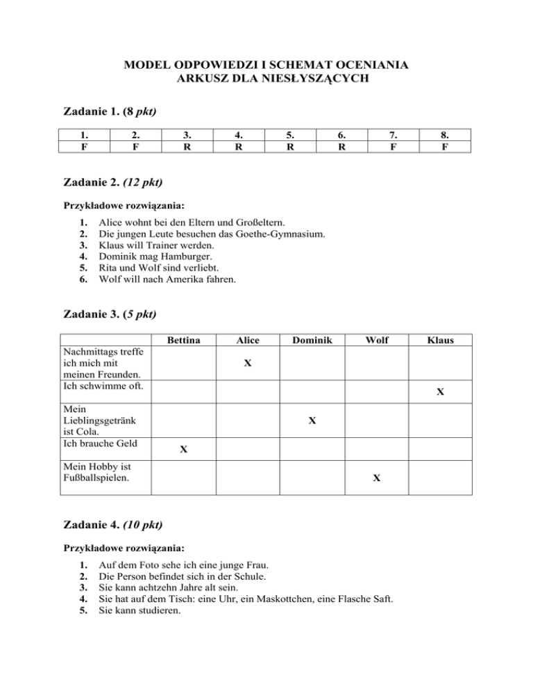 MODEL ODPOWIEDZI I SCHEMAT OCENIANIA ARKUSZ DLA NIESŁYSZĄCYCH Zadanie 1. (8 pkt) 1. F 2. F 3. R 4. R 5. R 6. R 7. F 8. F Zadanie 2. (12 pkt) Przykładowe rozwiązania: 1. 2. 3. 4. 5. 6. Alice wohnt bei den Eltern und Großeltern. Die jungen Leute besuchen das Goethe-Gymnasium. Klaus will Trainer werden. Dominik mag Hamburger. Rita und Wolf sind verliebt. Wolf will nach Amerika fahren. Zadanie 3. (5 pkt) Bettina Nachmittags treffe ich mich mit meinen Freunden. Ich schwimme oft. Mein Lieblingsgetränk ist Cola. Ich brauche Geld Alice Dominik Wolf X X X X Mein Hobby ist Fußballspielen. X Zadanie 4. (10 pkt) Przykładowe rozwiązania: 1. 2. 3. 4. 5. Klaus Auf dem Foto sehe ich eine junge Frau. Die Person befindet sich in der Schule. Sie kann achtzehn Jahre alt sein. Sie hat auf dem Tisch: eine Uhr, ein Maskottchen, eine Flasche Saft. Sie kann studieren. Zadanie 5. (8 pkt) Kunde: Verkäuferin: Kunde: Verkäuferin: Kunde: Verkäuferin: Kunde: Verkäuferin: Kunde: Verkäuferin: Kunde: Verkäuferin: Kunde: Verkäuferin: Guten Tag! Guten Tag, was möchten Sie? Ich suche einen Pullover. Welche Farbe suchen Sie ? Mir gefällt dunkelblau. Welche Größe tragen Sie? Ich glaube, die 40 passt mir gut. Also, nehmen Sie den Pullover? Ja, und wie viel kostet er? Fünfundfünfzig Euro. Prima, wo kann ich bezahlen? An der Kasse vorne. Danke , auf Wiedersehen. Auf Wiedersehen. Zadanie 6. (7 pkt) 1. G 2. B 3. A 4. H 5. E 6. D 7. C Zadanie 7. (5 pkt) 1. 2. 3. 4. 5. Axel feiert am Freitag seinen Geburtstag. Das Fußballspiel beginnt um 21 Uhr. Frau Schnabel geht jede Woche zum Arzt. Der Supermarkt ist von 12 bis 20 Uhr geöffnet. Peter und Christine fahren mit dem Auto ins Gebirge. Zadanie 8. (5 pkt) 1. 2. 3. 4. 5. Koch Kindergärtnerin Sekretärin Apotheker Lehrer Zadanie 9. (5pkt) 1. D 2. E 3. B 4. C 5. A 2 Zadanie 10. (5 pkt) 1. B 2. A 3. C 4. A 5. B Zadanie 11. (10pkt) Ocenia egzaminator zgodnie z kryteriami. Zadanie 12. (20 pkt) Ocenia egzaminator zgodnie z kryteriami. 3