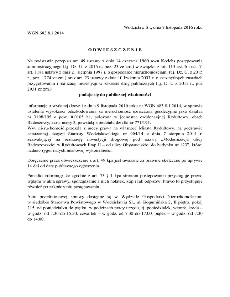 Wodzisław Śl., dnia 9 listopada 2016 roku WGN.683.8.1.2014 OBWIESZCZENIE Na podstawie przepisu art. 49 ustawy z dnia 14 czerwca 1960 roku Kodeks postępowania administracyjnego (t.j. Dz. U. z 2016 r., poz. 23 ze zm.) w związku z art. 113 ust. 6 i ust. 7, art. 118a ustawy z dnia 21 sierpnia 1997 r. o gospodarce nieruchomościami (t.j. Dz. U. z 2015 r., poz. 1774 ze zm.) oraz art. 23 ustawy z dnia 10 kwietnia 2003 r. o szczególnych zasadach przygotowania i realizacji inwestycji w zakresie dróg publicznych (t.j. D. U z 2015 r., poz 2031 ze zm.) podaje się do publicznej wiadomości informację o wydanej decyzji z dnia 9 listopada 2016 roku nr WGN.683.8.1.2014, w sprawie ustalenia wysokości odszkodowania za nieruchomość oznaczoną geodezyjnie jako działka nr 3108/195 o pow. 0,0105 ha, położoną w jednostce ewidencyjnej Rydułtowy, obręb Radoszowy, karta mapy 3, powstałą z podziału działki nr 771/195. Ww. nieruchomość przeszła z mocy prawa na własność Miasta Rydułtowy, na podstawie ostatecznej decyzji Starosty Wodzisławskiego nr 004/14 z dnia 7 sierpnia 2014 r. zezwalającej na realizację inwestycji drogowej pod nazwą „Modernizacja ulicy Radoszowskiej w Rydułtowach Etap II – od ulicy Obywatelskiej do budynku nr 123”, której nadano rygor natychmiastowej wykonalności. Doręczenie przez obwieszczenie z art. 49 kpa jest uważane za prawnie skuteczne po upływie 14 dni od daty publicznego ogłoszenia. Ponadto informuję, że zgodnie z art. 73 § 1 kpa stronom postępowania przysługuje prawo wglądu w akta sprawy, sporządzanie z nich notatek, kopii lub odpisów. Prawo to przysługuje również po zakończeniu postępowania. Akta przedmiotowej sprawy dostępne są w Wydziale Gospodarki Nieruchomościami w siedzibie Starostwa Powiatowego w Wodzisławiu Śl., ul. Bogumińska 2, II piętro, pokój 215, od poniedziałku do piątku, w godzinach pracy urzędu, tj. poniedziałek, wtorek, środa – w godz. od 7.30 do 15.30, czwartek – w godz. od 7.30 do 17.00, piątek – w godz. od 7.30 do 14.00.