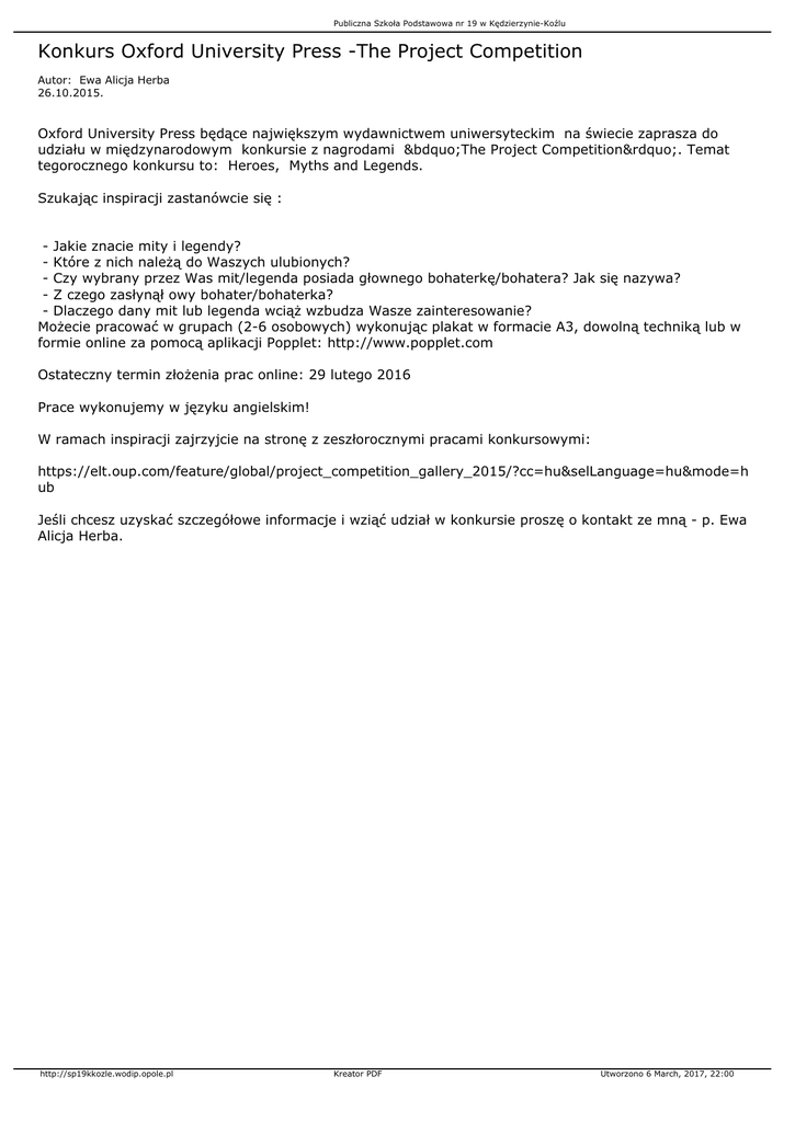 Publiczna Szkoła Podstawowa nr 19 w Kędzierzynie-Koźlu Konkurs Oxford University Press -The Project Competition Autor: Ewa Alicja Herba 26.10.2015. Oxford University Press będące największym wydawnictwem uniwersyteckim na świecie zaprasza do udziału w międzynarodowym konkursie z nagrodami „The Project Competition”. Temat tegorocznego konkursu to: Heroes, Myths and Legends. Szukając inspiracji zastanówcie się : - Jakie znacie mity i legendy? - Które z nich należą do Waszych ulubionych? - Czy wybrany przez Was mit/legenda posiada głownego bohaterkę/bohatera? Jak się nazywa? - Z czego zasłynął owy bohater/bohaterka? - Dlaczego dany mit lub legenda wciąż wzbudza Wasze zainteresowanie? Możecie pracować w grupach (2-6 osobowych) wykonując plakat w formacie A3, dowolną techniką lub w formie online za pomocą aplikacji Popplet: http://www.popplet.com Ostateczny termin złożenia prac online: 29 lutego 2016 Prace wykonujemy w języku angielskim! W ramach inspiracji zajrzyjcie na stronę z zeszłorocznymi pracami konkursowymi: https://elt.oup.com/feature/global/project_competition_gallery_2015/?cc=hu&selLanguage=hu&mode=h ub Jeśli chcesz uzyskać szczegółowe informacje i wziąć udział w konkursie proszę o kontakt ze mną - p. Ewa Alicja Herba. http://sp19kkozle.wodip.opole.pl Kreator PDF Utworzono 6 March, 2017, 22:00
