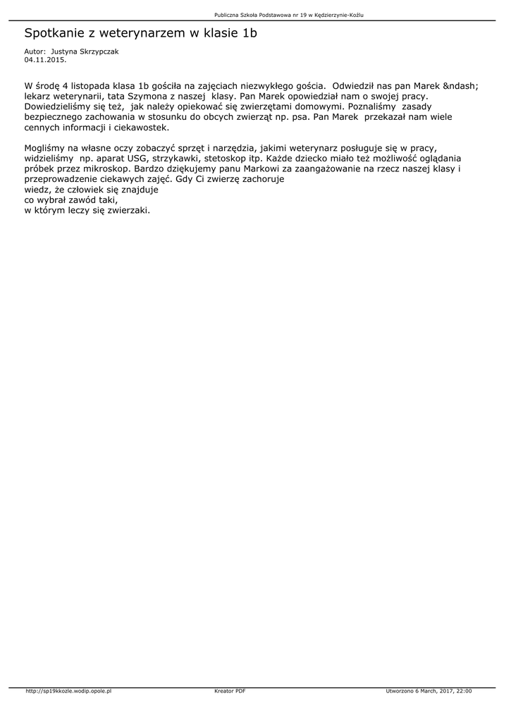 Publiczna Szkoła Podstawowa nr 19 w Kędzierzynie-Koźlu Spotkanie z weterynarzem w klasie 1b Autor: Justyna Skrzypczak 04.11.2015. W środę 4 listopada klasa 1b gościła na zajęciach niezwykłego gościa. Odwiedził nas pan Marek – lekarz weterynarii, tata Szymona z naszej klasy. Pan Marek opowiedział nam o swojej pracy. Dowiedzieliśmy się też, jak należy opiekować się zwierzętami domowymi. Poznaliśmy zasady bezpiecznego zachowania w stosunku do obcych zwierząt np. psa. Pan Marek przekazał nam wiele cennych informacji i ciekawostek. Mogliśmy na własne oczy zobaczyć sprzęt i narzędzia, jakimi weterynarz posługuje się w pracy, widzieliśmy np. aparat USG, strzykawki, stetoskop itp. Każde dziecko miało też możliwość oglądania próbek przez mikroskop. Bardzo dziękujemy panu Markowi za zaangażowanie na rzecz naszej klasy i przeprowadzenie ciekawych zajęć. Gdy Ci zwierzę zachoruje wiedz, że człowiek się znajduje co wybrał zawód taki, w którym leczy się zwierzaki. http://sp19kkozle.wodip.opole.pl Kreator PDF Utworzono 6 March, 2017, 22:00