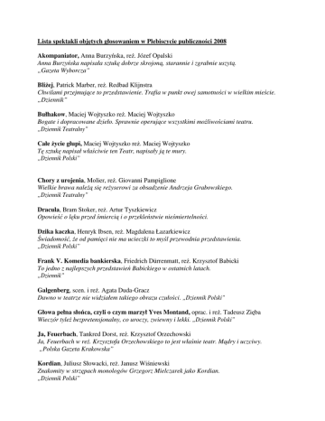 Lista spektakli objętych głosowaniem w Plebiscycie publiczności 2008 Akompaniator, Anna Burzyńska, reż. Józef Opalski Anna Burzyńska napisała sztukę dobrze skrojoną, starannie i zgrabnie uszytą. „Gazeta Wyborcza” Bliżej, Patrick Marber, reż. Redbad Klijnstra Chwilami przejmujące to przedstawienie. Trafia w punkt owej samotności w wielkim mieście. „Dziennik” Bułhakow, Maciej Wojtyszko reż. Maciej Wojtyszko Bogate i dopracowane dzieło. Sprawnie operujące wszystkimi możliwościami teatru. „Dziennik Teatralny” Całe życie głupi, Maciej Wojtyszko reż. Maciej Wojtyszko Tę sztukę napisał właściwie ten Teatr, napisały ją te mury. „Dziennik Polski” Chory z urojenia, Molier, reż. Giovanni Pampiglione Wielkie brawa należą się reżyserowi za obsadzenie Andrzeja Grabowskiego. „Dziennik Teatralny” Dracula, Bram Stoker, reż. Artur Tyszkiewicz Opowieść o lęku przed śmiercią i o przekleństwie nieśmiertelności. Dzika kaczka, Henryk Ibsen, reż. Magdalena Łazarkiewicz Świadomość, że od pamięci nie ma ucieczki to myśl przewodnia przedstawienia. „Dziennik Polski” Frank V. Komedia bankierska, Friedrich Dürrenmatt, reż. Krzysztof Babicki To jedno z najlepszych przedstawień Babickiego w ostatnich latach. „Dziennik” Galgenberg, scen. i reż. Agata Duda-Gracz Dawno w teatrze nie widziałem takiego obrazu czułości. „Dziennik Polski” Głowa pełna słońca, czyli o czym marzył Yves Montand, oprac. i reż. Tadeusz Zięba Wieczór tyleż bezpretensjonalny, co uroczy, zwiewny i lekki. „Dziennik Polski” Ja, Feuerbach, Tankred Dorst, reż. Krzysztof Orzechowski Ja, Feuerbach w reż. Krzysztofa Orzechowskiego to jest właśnie teatr. Mądry i uczciwy. „Polska Gazeta Krakowska” Kordian, Juliusz Słowacki, reż. Janusz Wiśniewski Znakomity w strzępach monologów Grzegorz Mielczarek jako Kordian. „Dziennik Polski” Kraina kłamczuchów, Maciej Wojtyszko, reż. Maciej Wojtyszko Przyjemne dwie godziny w kulturalnym teatrze. „Gazeta Wyborcza” Łucja Szalona, Don Nigro, reż. Magdalena Piekorz Bardzo udany melanż dobrze napisanego tekstu z reżyserskim rzemiosłem. „Rzeczpospolita” Orkiestra „Titanic”, Christo Bojczew, reż. Andrzej Domalik Domalikowi udało się zbudować nastrój oczekiwania, niepewności, tajemnicy. „Kraków” Ożenek, Mikołaj Gogol, reż. Maciej Sobociński Sobociński intrygował swoimi pomysłami od początku do końca. „Dziennik Teatralny” Pokojówki, Jean Genet, reż. Józef Opalski Koncert pierwszorzędnych ról. „Rzeczpospolita” Pułapka na myszy, Agatha Christie, reż. Olga Lipińska Spektakl Lipińskiej miesza w sobie wszystkie elementy grozy i humoru. „Dziennik Teatralny” Pułapka, Tadeusz Różewicz, reż. Krzysztof Babicki Na szacunek zasługuje praca nad słowem i solidne potraktowanie każdej postaci. „Przegląd” Rozmowy poufne, Ingmar Bergman, reż. Iwona Kempa Rzadko zdarzają się w polskim teatrze opowieści snute tak krystalicznie. „Dziennik Polski” Tango Piazzolla, Anna Burzyńska, reż. Józef Opalski Reżyser zapewnia widzom obcowanie z kunsztownie zakomponowanym, wzruszającym dziełem. „Rzeczpospolita” Wesele, Stanisław Wyspiański, reż. Bodolay Wizja Bodolaya przyciąga uwagę oryginalnością i konsekwencją, wprowadza świeżość i dystans. „Rzeczpospolita”