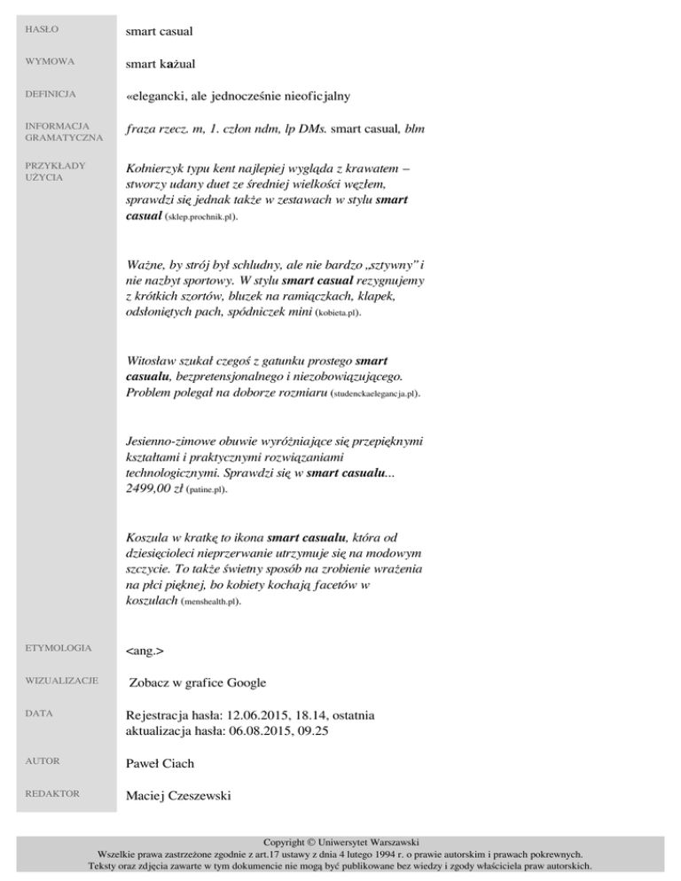 HASŁO smart casual WYMOWA smart każual DEFINICJA «elegancki, ale jednocześnie nieoficjalny» INFORMACJA GRAMATYCZNA fraza rzecz. m, 1. człon ndm, lp DMs. smart casual, blm PRZYKŁADY UŻYCIA Kołnierzyk typu kent najlepiej wygląda z krawatem – stworzy udany duet ze średniej wielkości węzłem, sprawdzi się jednak także w zestawach w stylu smart casual (sklep.prochnik.pl). Ważne, by strój był schludny, ale nie bardzo „sztywny” i nie nazbyt sportowy. W stylu smart casual rezygnujemy z krótkich szortów, bluzek na ramiączkach, klapek, odsłoniętych pach, spódniczek mini (kobieta.pl). Witosław szukał czegoś z gatunku prostego smart casualu, bezpretensjonalnego i niezobowiązującego. Problem polegał na doborze rozmiaru (studenckaelegancja.pl). Jesienno-zimowe obuwie wyróżniające się przepięknymi kształtami i praktycznymi rozwiązaniami technologicznymi. Sprawdzi się w smart casualu... 2499,00 zł (patine.pl). Koszula w kratkę to ikona smart casualu, która od dziesięcioleci nieprzerwanie utrzymuje się na modowym szczycie. To także świetny sposób na zrobienie wrażenia na płci pięknej, bo kobiety kochają facetów w koszulach (menshealth.pl). ETYMOLOGIA WIZUALIZACJE <ang.> Zobacz w grafice Google DATA Rejestracja hasła: 12.06.2015, 18.14, ostatnia aktualizacja hasła: 06.08.2015, 09.25 AUTOR Paweł Ciach REDAKTOR Maciej Czeszewski Copyright © Uniwersytet Warszawski Wszelkie prawa zastrzeżone zgodnie z art.17 ustawy z dnia 4 lutego 1994 r. o prawie autorskim i prawach pokrewnych. Teksty oraz zdjęcia zawarte w tym dokumencie nie mogą być publikowane bez wiedzy i zgody właściciela praw autorskich. Copyright © Uniwersytet Warszawski Wszelkie prawa zastrzeżone zgodnie z art.17 ustawy z dnia 4 lutego 1994 r. o prawie autorskim i prawach pokrewnych. Teksty oraz zdjęcia zawarte w tym dokumencie nie mogą być publikowane bez wiedzy i zgody właściciela praw autorskich. Powered by TCPDF (www.tcpdf.org)