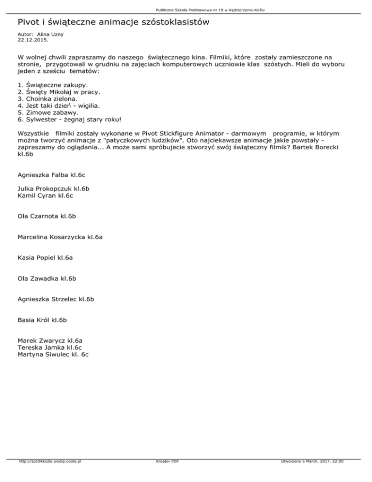 Publiczna Szkoła Podstawowa nr 19 w Kędzierzynie-Koźlu Pivot i świąteczne animacje szóstoklasistów Autor: Alina Uzny 22.12.2015. W wolnej chwili zapraszamy do naszego świątecznego kina. Filmiki, które zostały zamieszczone na stronie, przygotowali w grudniu na zajęciach komputerowych uczniowie klas szóstych. Mieli do wyboru jeden z sześciu tematów: 1. 2. 3. 4. 5. 6. Świąteczne zakupy. Święty Mikołaj w pracy. Choinka zielona. Jest taki dzień - wigilia. Zimowe zabawy. Sylwester - żegnaj stary roku! Wszystkie filmiki zostały wykonane w Pivot Stickfigure Animator - darmowym programie, w którym można tworzyć animacje z "patyczkowych ludzików". Oto najciekawsze animacje jakie powstały zapraszamy do oglądania... A może sami spróbujecie stworzyć swój świąteczny filmik? Bartek Borecki kl.6b Agnieszka Falba kl.6c Julka Prokopczuk kl.6b Kamil Cyran kl.6c Ola Czarnota kl.6b Marcelina Kosarzycka kl.6a Kasia Popiel kl.6a Ola Zawadka kl.6b Agnieszka Strzelec kl.6b Basia Król kl.6b Marek Zwarycz kl.6a Tereska Jamka kl.6c Martyna Siwulec kl. 6c http://sp19kkozle.wodip.opole.pl Kreator PDF Utworzono 6 March, 2017, 22:00