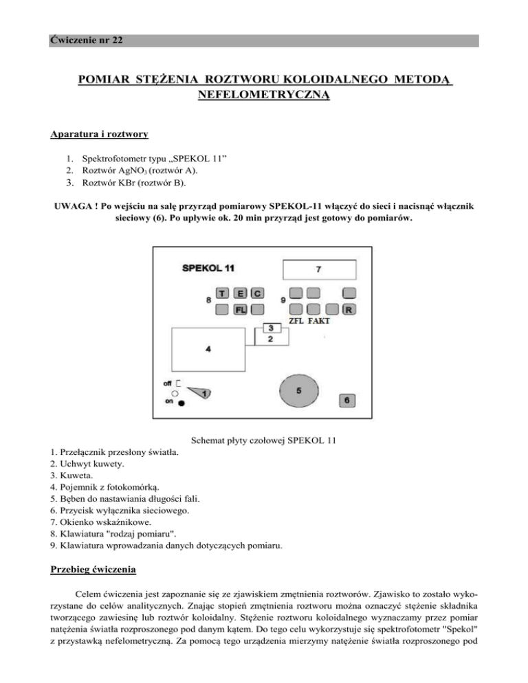 Ćwiczenie nr 22 POMIAR STĘŻENIA ROZTWORU KOLOIDALNEGO METODĄ NEFELOMETRYCZNĄ Aparatura i roztwory 1. Spektrofotometr typu „SPEKOL 11” 2. Roztwór AgNO3 (roztwór A). 3. Roztwór KBr (roztwór B). UWAGA ! Po wejściu na salę przyrząd pomiarowy SPEKOL-11 włączyć do sieci i nacisnąć włącznik sieciowy (6). Po upływie ok. 20 min przyrząd jest gotowy do pomiarów. Schemat płyty czołowej SPEKOL 11 1. Przełącznik przesłony światła. 2. Uchwyt kuwety. 3. Kuweta. 4. Pojemnik z fotokomórką. 5. Bęben do nastawiania długości fali. 6. Przycisk wyłącznika sieciowego. 7. Okienko wskaźnikowe. 8. Klawiatura "rodzaj pomiaru". 9. Klawiatura wprowadzania danych dotyczących pomiaru. Przebieg ćwiczenia Celem ćwiczenia jest zapoznanie się ze zjawiskiem zmętnienia roztworów. Zjawisko to zostało wykorzystane do celów analitycznych. Znając stopień zmętnienia roztworu można oznaczyć stężenie składnika tworzącego zawiesinę lub roztwór koloidalny. Stężenie roztworu koloidalnego wyznaczamy przez pomiar natężenia światła rozproszonego pod danym kątem. Do tego celu wykorzystuje się spektrofotometr "Spekol" z przystawką nefelometryczną. Za pomocą tego urządzenia mierzymy natężenie światła rozproszonego pod kątem 900. W ćwiczeniu wyznaczamy stężenie roztworu koloidalnego AgBr, który powstaje w wyniku zmieszania roztworu AgNO3 (roztwór A) i KBr (roztwór B), Ag+ + Br- ----> AgBr Roztwory A i B mają stężenie 5⋅10 mol/dm3. 1. Z roztworów A i B pobrać do naczynia miarowego po 5 ml cieczy, odczekać 15 minut w celu powstania roztworu koloidalnego i uzupełnić wodą destylowaną do 20 ml (otrzymujemy roztwór koloidalny o stężeniu 2.5⋅10-3 mol/dm3). 2. Z powstałego roztworu koloidalnego przygotowujemy 5 próbek o stężeniach odpowiednio równych: 0.5⋅10-4, 1⋅10-4, 1.5⋅10-4, 2⋅10-4, 2.5⋅10-4. Otrzymujemy je nalewając ilości koloidu podane w tabeli 2 formularza ćwiczeniowego, uzupełniając objętości próbek wodą destylowaną do 25 ml. 3. Wyjściowy roztwór koloidalny (po operacji z punktu 2 zostało go 12.5 ml) uzupełnić do 25 ml wodą destylowaną – otrzymujemy stężenie 12.5⋅10-4 mol/dm3; roztwór ten nazwiemy próbką C - posłuży ona do przeprowadzenia badania zmętnienia w funkcji długości fali. 4. Nastawiamy na bębnie SPEKOLA długość fali 400 nm i wprowadzamy kuwetę z wodą destylowaną w bieg promieni. Wciskamy przycisk `FL`, następnie przycisk `Z – FL MIN` a na koniec przycisk `FAKT` (w okienku wyświetlacza powinna pojawić się cyfra 1.0000). 5. Następnie wyjmujemy kuwetę z wodą i w bieg promieni wprowadzamy kuwetę wypełnioną próbką C. Wciskamy przycisk `FAKT` a po chwili przycisk `R`. Przeprowadzamy pomiar zmętnienia w funkcji długości fali dla próbki C. Sporządzamy wykres zależności zmętnienia (natężenia światła rozproszonego) od długości fali. Pomiary wykonujemy dla przedziału długości fal od 390 nm do 560 nm, zmieniając długość fali co 10 nm. Odczyt natężenia światła należy wykonać po około 10 sek od wprowadzenia próbki w bieg promieni, niezależnie od wyświetlanych wartości. Dane z pomiarów należy wpisać do tabeli 1. 6. Z wykresu wyznaczamy długość fali λmax, dla której zmętnienie roztworu osiąga wartość maksymalną. Na bębnie długości fali ustawiamy odczytaną z wykresu wartość λmax. Podczas ustawiania tej długości fali kuweta z próbką C powinna znajdować się wewnątrz przyrządu pomiarowego. 7. Następnie kolejno wyznaczamy zmętnienia próbek przygotowanych w punkcie 2 (w kolejności od stężenia najmniejszego do największego) przy ustalonej uprzednio długości fali. W tym celu wysuwamy karetkę (w okienku wyświetlacza pojawia się `-OFL`), napełniamy kuwetkę kolejną próbką i umieszczamy ją w przyrządzie pomiarowym. Dane z pomiarów wpisujemy do tabeli 2. Po wykonaniu pomiaru badany roztwór wlać z powrotem do cylindra miarowego. Na podstawie uzyskanych wyników sporządzamy wykres zmętnienia (natężenie światła rozproszonego) w funkcji stężenia próbki. 8. Zmierzyć zmętnienie próbki o nieznanym stężeniu Cx (przygotowanym przez prowadzącego ćwiczenia) i na podstawie wykresu (punkt 4) wyznaczyć stężenie tej próbki. -3 Wymagane wiadomości teoretyczne 1. Układy koloidalne oraz ich właściwości optyczne. 2. Podstawy teorii Rayleigha rozpraszania światła. 3. Oddziaływanie światła z materią – pochłanianie a rozpraszanie. 4. Zjawisko Ramana. 5. Zasada działania nefelometru. Zalecana literatura 1. L. Sobczyk, A. Kisza, „Chemia fizyczna dla przyrodników”, PWN, 1975. 2. E. Szyszko, „Instrumentalne metody analityczne”, PZWL, Warszawa 1975. 3. K. Michalak, A. Hendrich, „Ćwiczenia laboratoryjne z biofizyki”, Wydawnictwo AM Wrocław, 2002. 4. „Biofizyka dla biologów”, PWN, 1997. Uniwersytet Medyczny we Wrocławiu Katedra Biofizyki Zakład Biofizyki Ćwiczenie 22 Pomiar stężenia roztworu koloidalnego metodą nefelometryczną Podpis prowadzącego ćwiczenia ....................................................... ....................................................... Imiona i nazwiska studentów Wydział: Data Grupa studencka: Grupa ćwiczeniowa: Stopień zaliczenia 1. Pomiar natężenia światła rozproszonego przez roztwór koloidalny w zależności od długości fali światła padającego. Tabela 1. Długość fali λ [nm] Natężenie światła rozproszonego [%] Długość fali λ [nm] Natężenie światła rozproszonego [%] 480 490 500 510 520 530 540 550 390 400 410 420 430 440 450 460 470 560 2. Wyznaczanie z wykresu długości fali, dla której natężenie światła rozproszonego jest największe (λmax). λmax = 3. Pomiar zależności natężenia światła rozproszonego od stężenia roztworu koloidalnego dla λmax. Tabela 2. Ilość koloidu w 25 cm3 próbki [cm3] Stężenie próbki [mol/dm3] Natężenie światła rozproszonego [%] 0,5 1 1,5 2 4. Pomiar natężenia świat