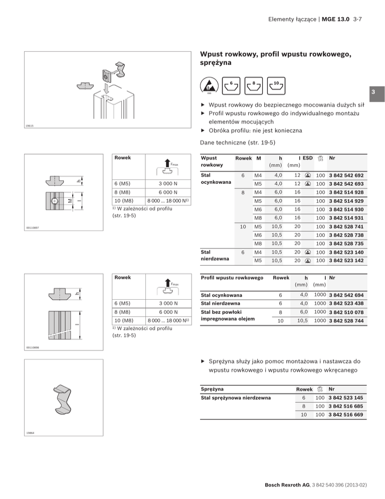 Elementy łączące | MGE 13.0 3-7 Wpust rowkowy, profil wpustu rowkowego, sprężyna 1 2 6 8 10 3 ESD f Wpust rowkowy do bezpiecznego mocowania dużych sił f Profil wpustu rowkowego do indywidualnego montażu elementów mocujących 19615 5 f Obróka profilu: nie jest konieczna Dane techniczne (str. 19-5) Rowek h Fmax 6 (M5) I M 8 (M8) 10 (M8) 3 000 N Wpust rowkowy Rowek M Stal ocynkowana 6 6 000 N 8 8 000 ... 18 000 N1) 1) W zależności od profilu (str. 19-5) 10 00110897 Stal nierdzewna 6 4 6 h (mm) l ESD (mm) M4 4,0 12 ESD M5 4,0 12 ESD Nr 100 3 842 542 692 100 3 842 542 693 M4 6,0 16 100 3 842 514 928 M5 6,0 16 100 3 842 514 929 M6 6,0 16 100 3 842 514 930 M8 6,0 16 100 3 842 514 931 M5 10,5 20 100 3 842 528 741 M6 10,5 20 100 3 842 528 738 100 3 842 528 735 M8 10,5 20 M4 10,5 20 ESD M5 10,5 20 ESD 100 3 842 523 140 7 8 9 10 11 12 100 3 842 523 142 13 Rowek Profil wpustu rowkowego Rowek Fmax l Nr (mm) 6 6 (M5) 3 000 N Stal nierdzewna 6 4,0 1000 3 842 523 438 8 (M8) 6 000 N Stal bez powłoki impregnowana olejem 8 6,0 1000 3 842 510 078 10,5 1000 3 842 528 744 h Stal ocynkowana 4,0 10 (M8) l h (mm) 8 000 ... 18 000 N1) 10 1000 3 842 542 694 W zależności od profilu (str. 19-5) 14 15 16 1) 17 00110898 f Sprężyna służy jako pomoc montażowa i nastawcza do wpustu rowkowego i wpustu rowkowego wkręcanego Sprężyna Rowek Stal sprężynowa nierdzewna Nr 6 100 3 842 523 145 8 100 3 842 516 685 10 100 3 842 516 669 19864 Bosch Rexroth AG, 3 842 540 396 (2013-02) 18 19 20 21 3-8 MGE 13.0 | Elementy łączące Wpust rowkowy obracany Profil wpustu rowkowego, obracany 6 8 10 ESD f Obracany profil wpustu rowkowego do montażu 1 2 elementów mocujących we własnym zakresie 3 f Wpust rowkowy obracany do bezpośredniego włożenia w miejsce montażu; wyjątkowo łatwy w montażu f Wpust rowkowy obracany ze sprężyną do bezpośredniego włożenia w miejscu montażu i ustalenia pozycji poprzez przymocowane punktowo sprężyny f Wpust rowkowy obracany, z wkrętem bez łba do zabezpieczenia przed przesuwem f Obróbka profilu: nie jest konieczna Dane techniczne (str. 19-5) 19614 h Rowek Fmax 1000 +3 8 (M8) 10 (M8) 2 200 N Profil wpustu rowkowego, obracany Stal bez powłoki impregnowana olejem Rowek h (mm) l (mm) Nr 8 4,8 1000 3 842 529 327 10 5,3 1000 3 842 529 325 8 000 ... 18 000 N1) W zależności od profilu (str. 19-5) 1) 00110901 Rowek Wpust rowkowy obracany Rowek M h (mm) l (mm) Nr h Fmax Stal nierdzewna 8 (M8) I M 10 (M8) 2 200 N 8 000 ... 18 000 N1) W zależności od profilu (str. 19-5) 1) Stal ocynkowana 3,0 12 100 3 842 536 669 8 M6 4,8 16 100 3 842 530 321 10 M8 5,3 20 100 3 842 530 316 8 M5 4,8 16 100 3 842 529 319 M6 4,8 16 100 3 842 529 320 M8 4,8 16 100 3 842 529 321 M6 5,3 20 100 3 842 529 323 M8 5,3 20 100 3 842 529 324 10 00110900 Akcesoria: Bosch Rexroth AG, 3 842 540 396 (2013-02) M4 6 Sprężyna (str. 3-7) Elementy łączące | MGE 13.0 3-9 Rowek h Fmax 8 (M8) 10 (M8) I M h I b M M 00117784 8 000 ... 18 000 N1) W zależności od profilu (str. 19-5) 1) 00110902 2 200 N Wpust rowkowy Rowek M h l ESD obracany ze (mm) (mm) sprężyną Stal ocynkowana, chromowana z warstwą prześwitującą Sprężyna: stal sprężynowa nierdzewna 8 10 M4 4,8 16 ESD M5 4,8 16 ESD M6 4,8 16 ESD M8 4,8 16 ESD M4 5,3 20 ESD M5 5,3 20 ESD M6 5,3 20 ESD M8 5,3 20 ESD Wpust rowkowy Rowek M b h l obracany (mm) (mm) (mm) z wkrętem bez łba Nr 1 2 100 3 842 529 294 100 3 842 529 295 100 3 842 529 296 100 3 842 529 297 100 3 842 541 393 100 3 842 529 298 100 3 842 529 299 100 3 842 529 300 Nr Stal nierdzewna 6 M4 8 3,0 15 100 3 842 536 673 Stal ocynkowana 8 M5 12 4,8 24 100 3 842 536 675 10 M5 14 5,3 30 100 3 842 536 676 3 4 5 6 7 8 9 10 11 12 13 14 15 16 17 18 19 20 21 Bosch Rexroth AG, 3 842 540 396 (2013-02)